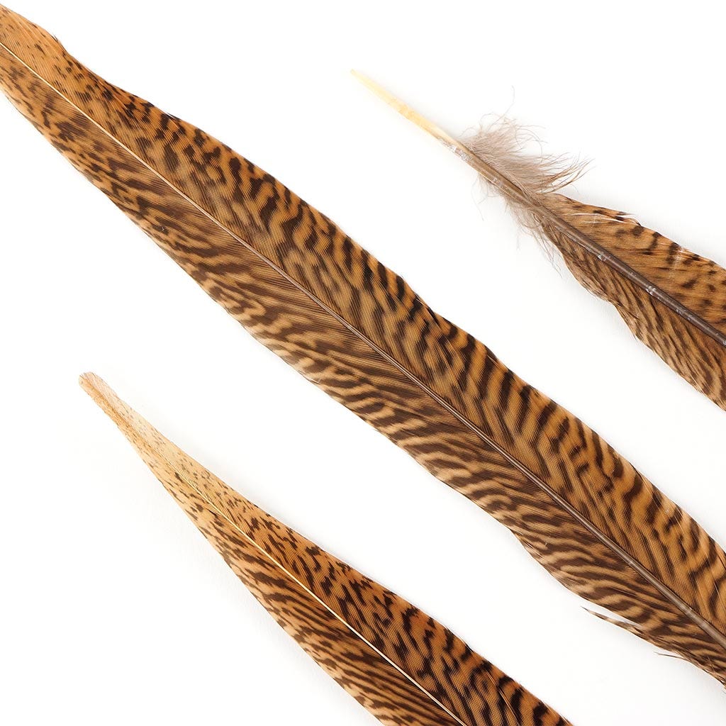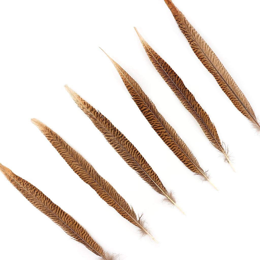 Natural Golden Pheasant Tail Feathers range in size from 14-16 inches long and come in a 100 piece package. Natural Golden Pheasant Tail Feathers are golden brown with dark natural brown, zebra-like markings throughout the body of the feather. These pheasant tails are approximately 1/2" wide near the base of the quill and become approx. 1" wide through the body of the feather before tapering to a 1/5" point at the top.