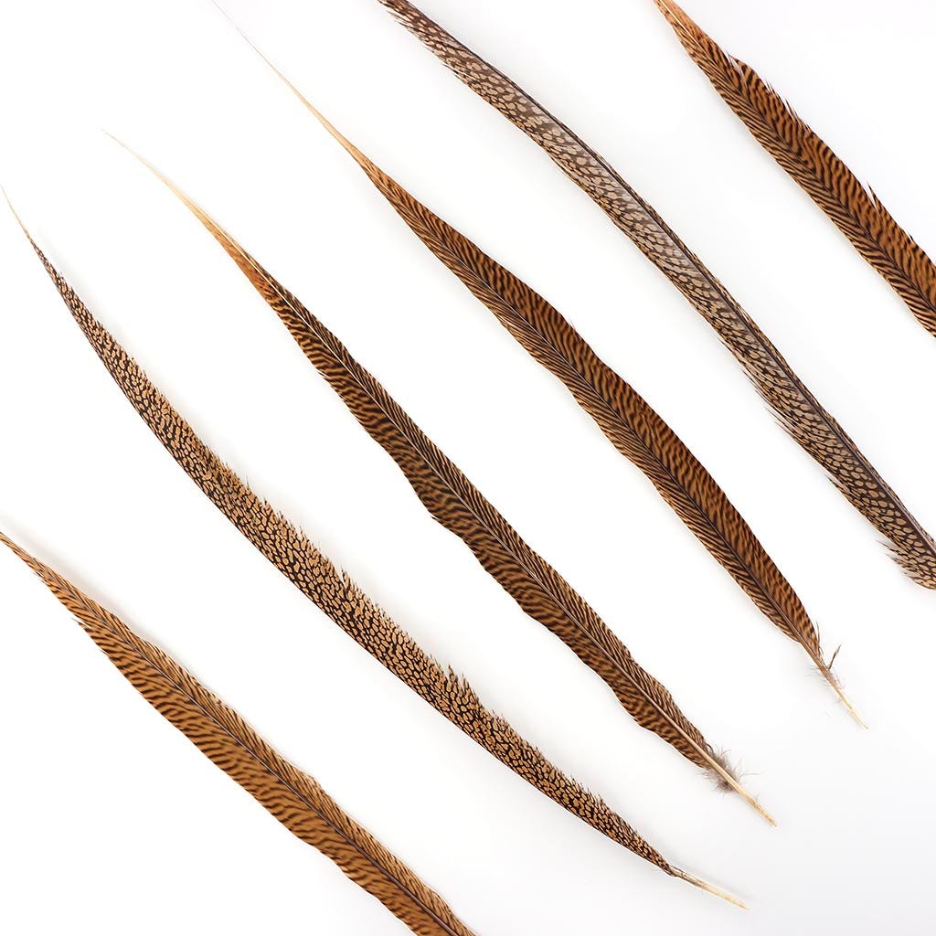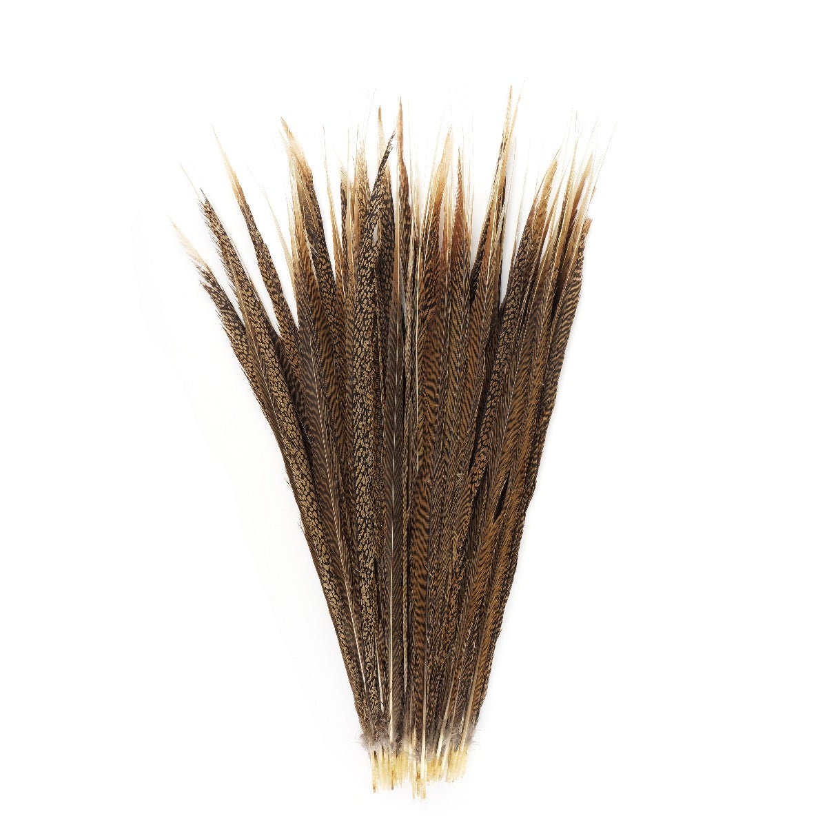 - Natural Golden Pheasant Tail Feathers are golden brown with dark natural brown, zebra-like markings throughout the body of the feather.