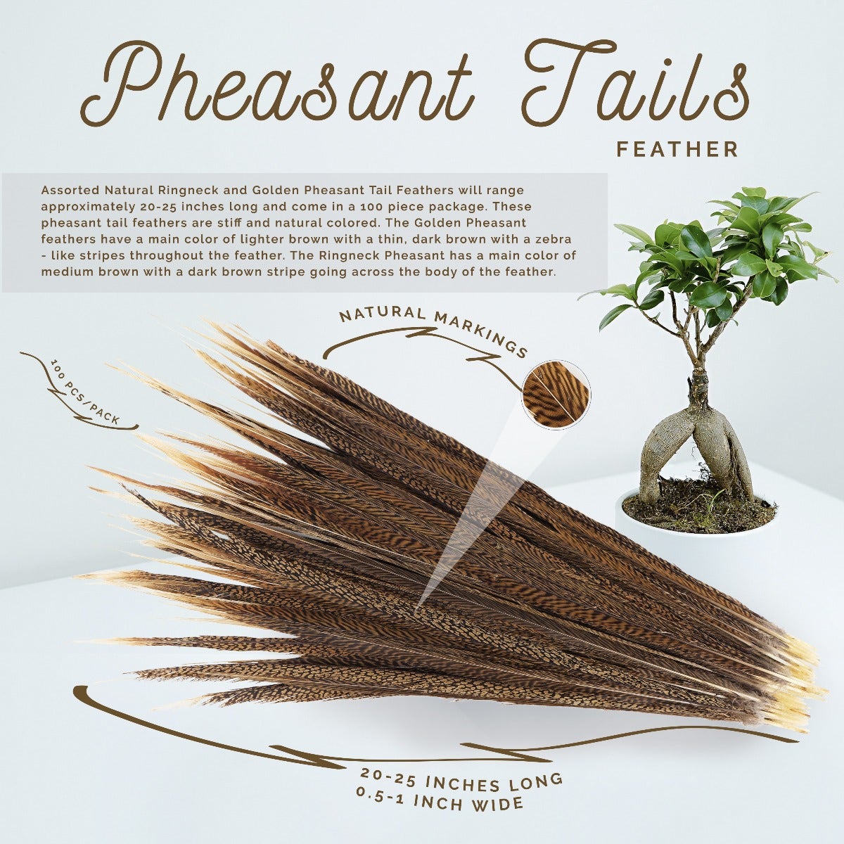 - Natural Golden Pheasant Tail Feathers range in size from 20-25 inches long and come in a 3 piece package.