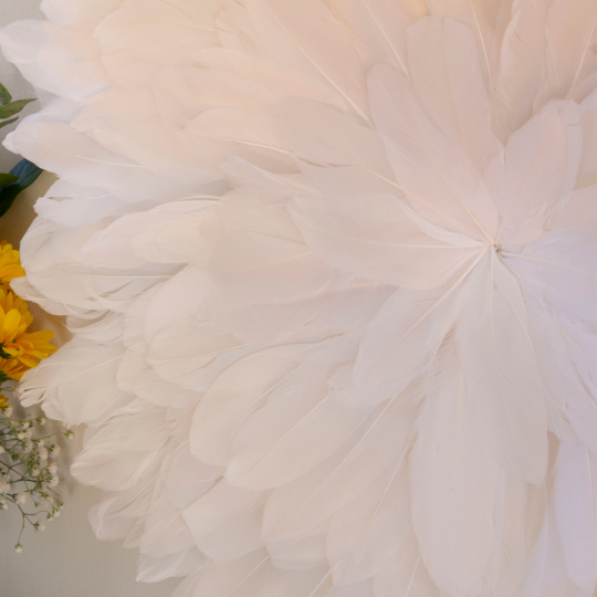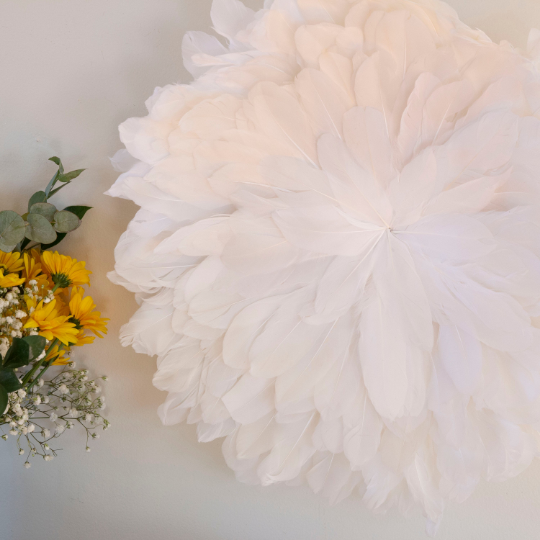 Express your unique style with these Small Feather Medallion Wall Art And Décor Accents. These handmade Feather Medallions are made with Dyed 5-6" Goose Pallet Feathers that have been arranged on a 11.5" diameter Jute & Wood Base. Choose from a variety of colors to match your lifestyle and space. The overall dimensions measure 18"-22" in diameter and has a sawtooth hanger on the back to make it easy to hang as decorative wall art. Decorate with eco friendly decor, perfect for the Modern or Bohemian home, these feather accents compliment any wall space or table setting. Pair them together or showcase them separately for a stunning display of natural beauty.