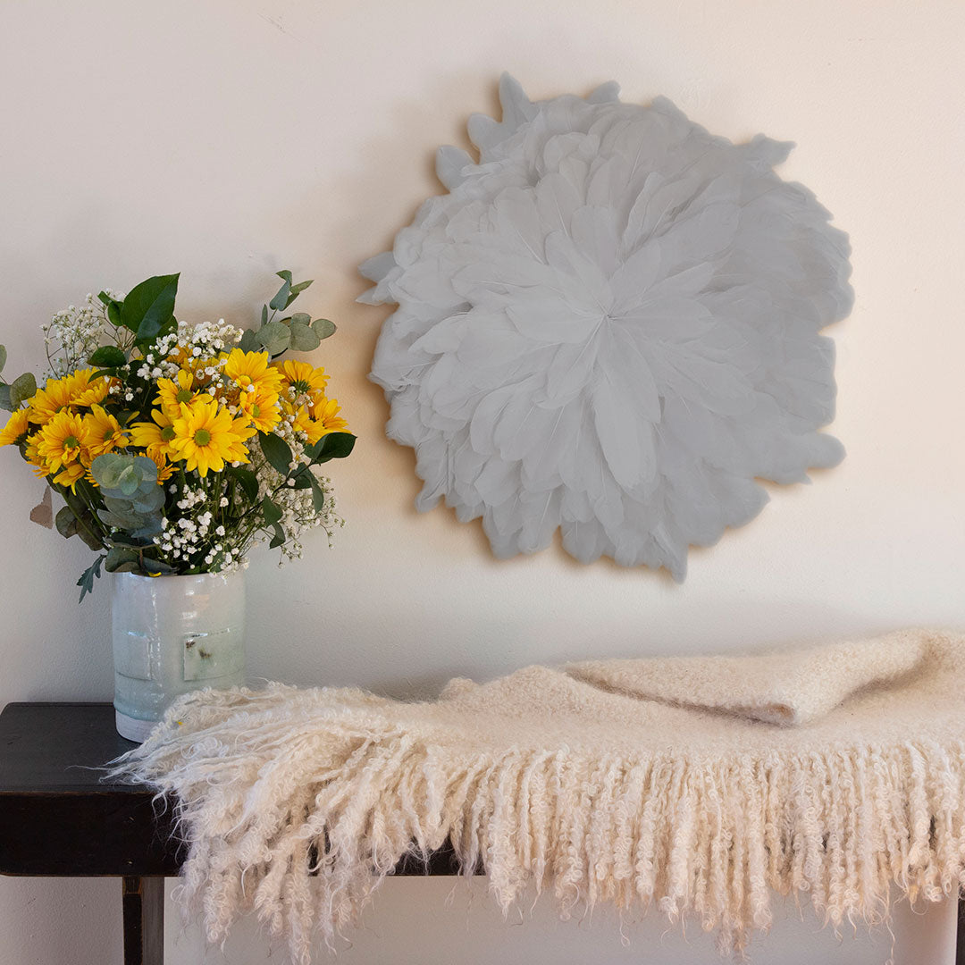 Express your unique style with these Small Feather Medallion Wall Art And Décor Accents. Made to Order - These handmade Feather Medallions are made with Dyed 5-6" Goose Pallet Feathers that have been arranged on a 11.5" diameter Jute & Wood Base. Choose from a variety of colors to match your lifestyle and space. The overall dimensions measure 18"-22" in diameter and has a sawtooth hanger on the back to make it easy to hang as decorative wall art. Decorate with eco friendly decor, perfect for the Modern or Bohemian home, these feather accents compliment any wall space or table setting. Pair them together or showcase them separately for a stunning display of natural beauty.