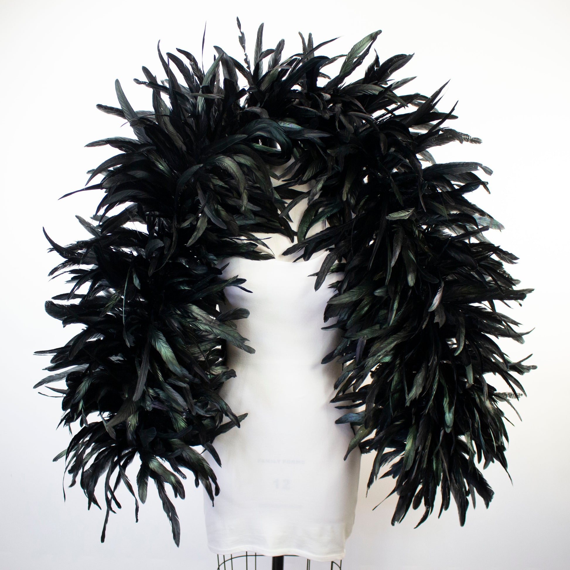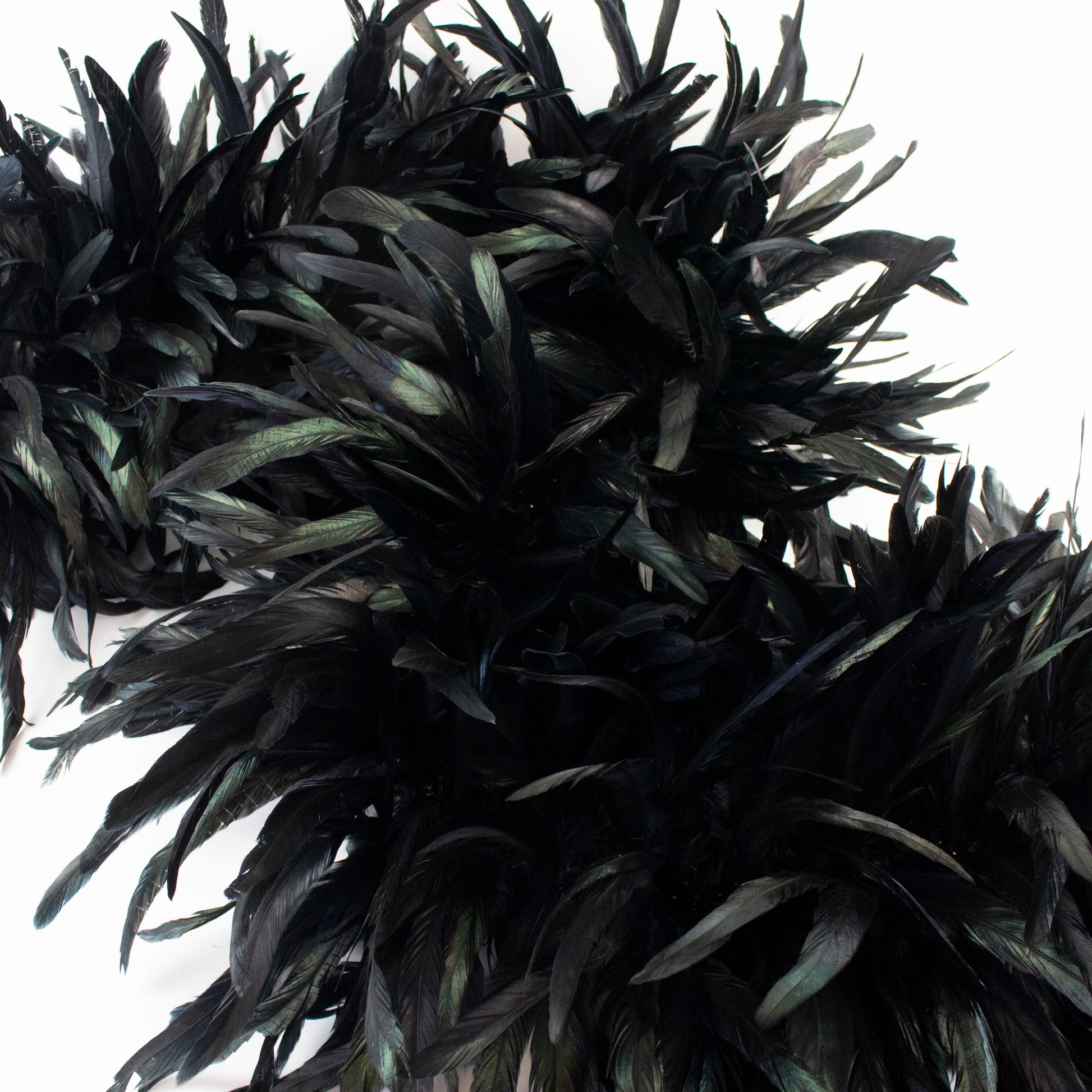 Add a Touch of Glamour with our Deluxe Rooster Coque Tail Feather Boa! This luxurious feather boa is the perfect accessory to elevate any look. Ideal for burlesque performances, ballroom dancing, photography, fashion and costume design, or any special occasion, it brings drama, elegance, and flair wherever you go. Whether you're stepping into the spotlight or adding a bold accent to your ensemble, this boa delivers timeless sophistication with every sway. These luxurious feather boas measure 2 yards (6 feet) in length and are crafted from 10-12" black dyed iridescent rooster coque tail feathers...making it approximately 20-24" inches in diameter.