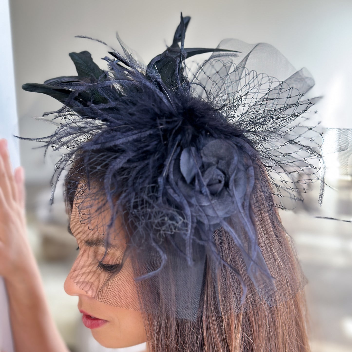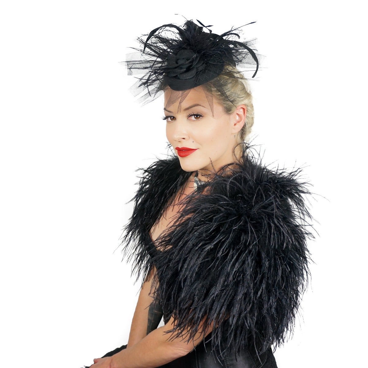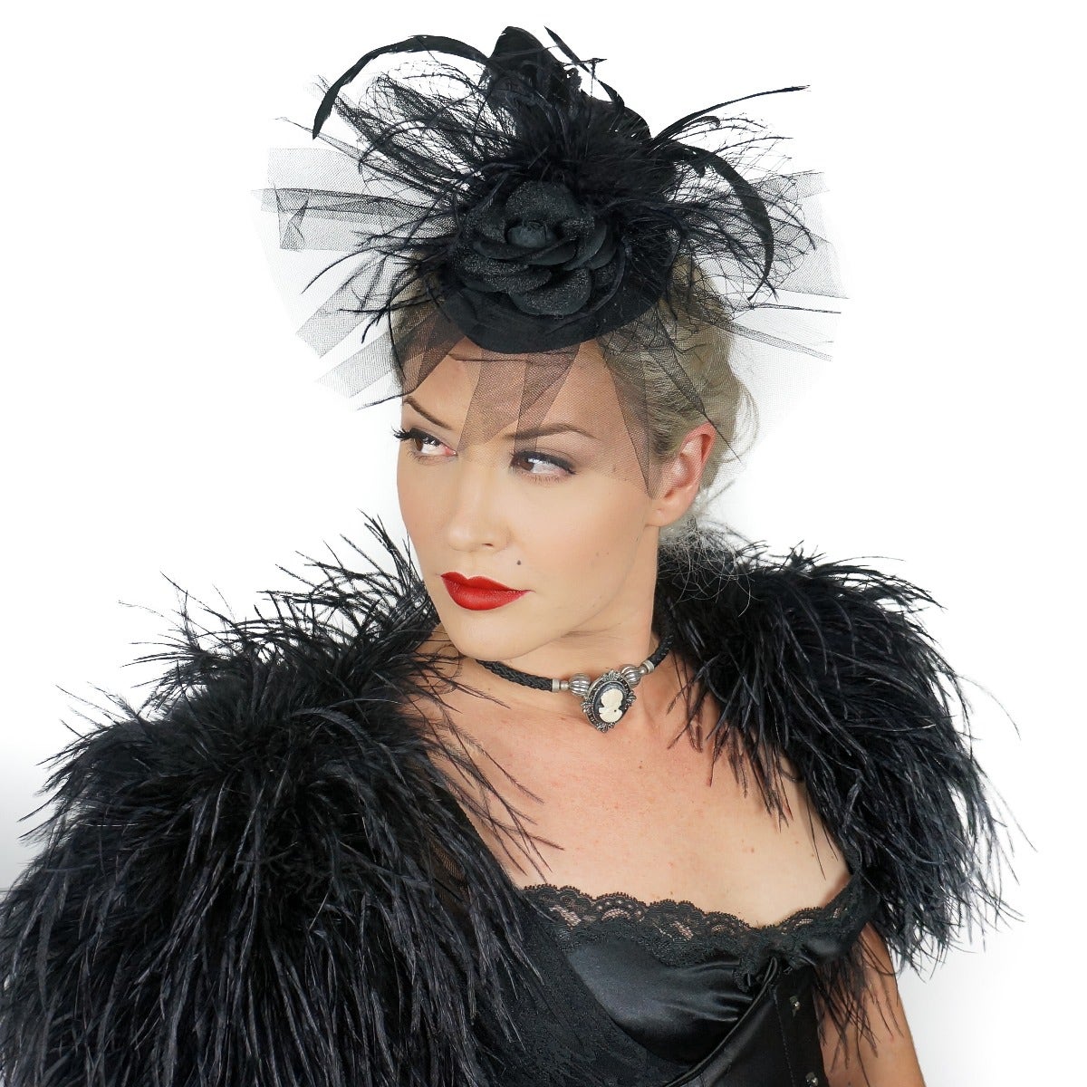 The Blair black ostrich feather vintage style fascinator is made with tulle veil, hair clip and accessory. Our gothic Victorian style clip is perfect to use for weddings, dressing up as British royalty, Halloween, a Gatsby event, or a Kentucky Derby Hat.