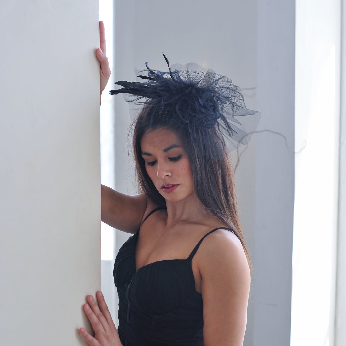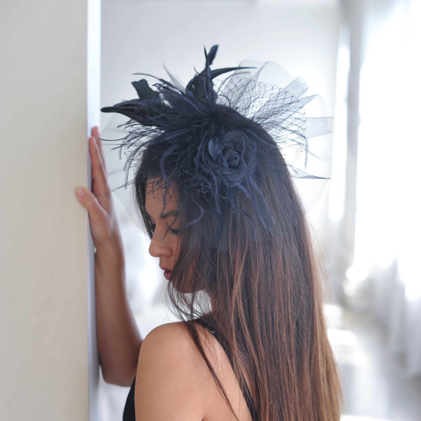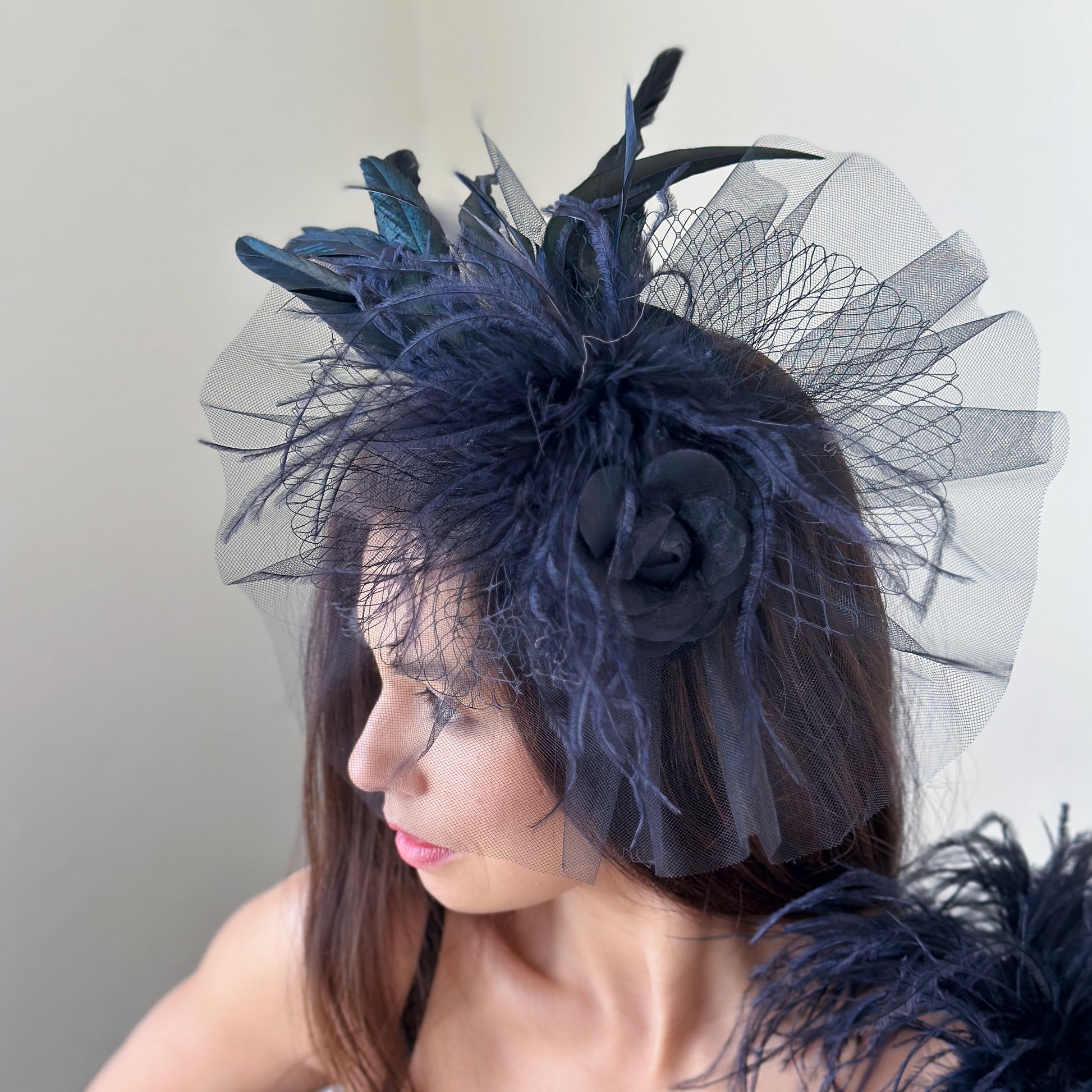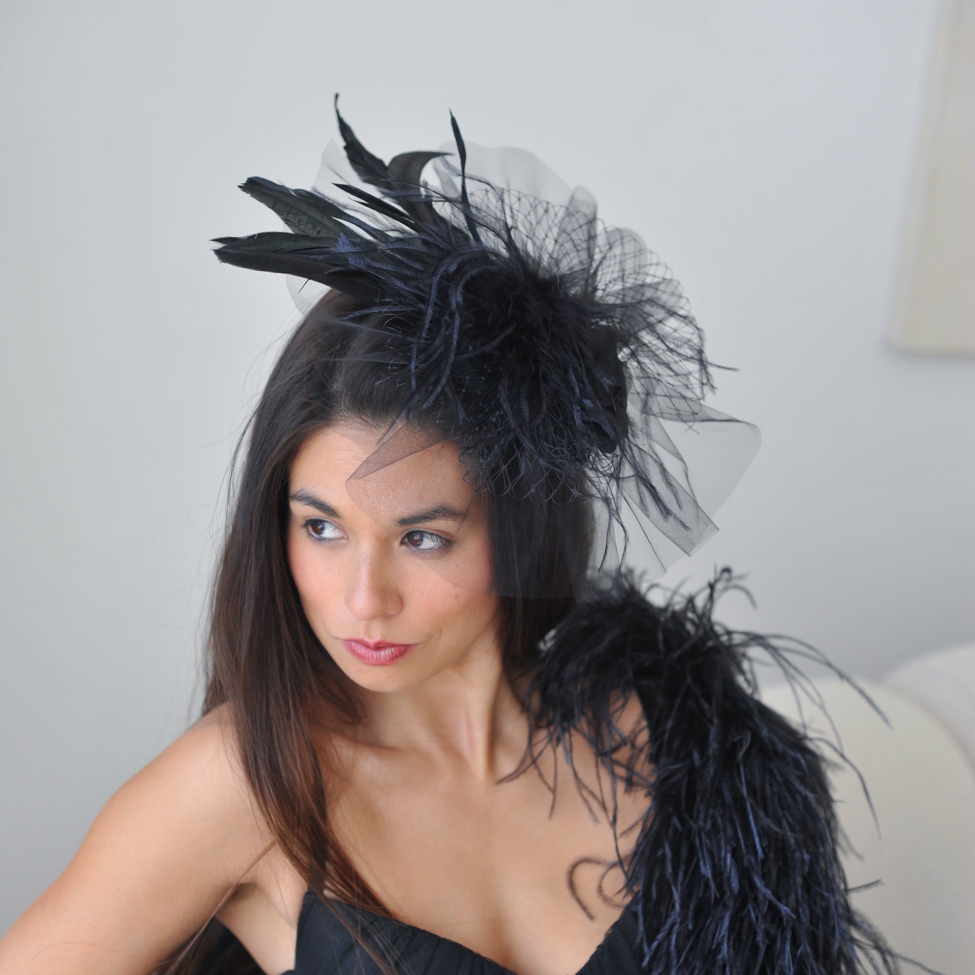 The Blair black ostrich feather vintage style fascinator is made with tulle veil, hair clip and accessory. Our gothic Victorian style clip is perfect to use for weddings, dressing up as British royalty, Halloween, a Gatsby event, or a Kentucky Derby Hat.