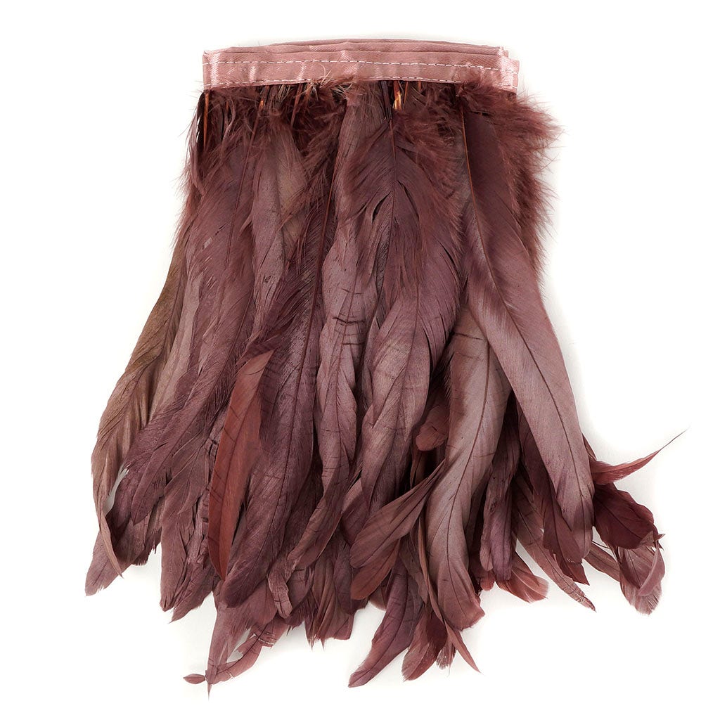 Iridescent Bronze Coque Tail Feather Fringe approx 8-10" inches long on 1 yard roll with matching satin-blend bias tape. This handmade Feather Fringe is made from dyed iridescent bronze coque tail feathers (located on the tail of the Rooster) that have been sewn on to a matching satin-blend bias tape. There are approx 10 feathers per inch. When feathers on this trim are dyed over the natural bronze it continues to have an iridescent shine to it.
