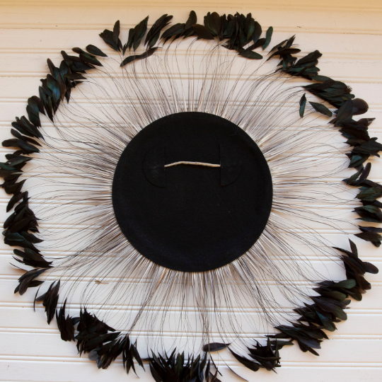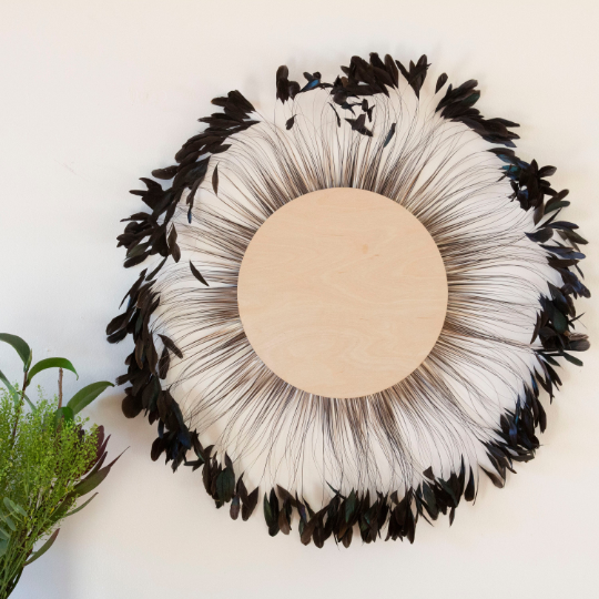 Made to Order - Full Sun Feather Decor 26in from feather to feather (entire diameter), 11 1/4in diameter Wooden Circle Center with 8" Natural Half Brz Stripped Coque around edge of wood- black felt on back.