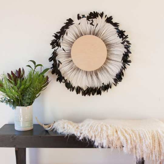 Decorate with eco friendly decor, perfect for the Modern or Bohemian home. Handmade with stripped coque feathers and wooden discs, these feather shapes complement any wall space or table setting. Pair them together or showcase them separately for a stunning display of natural beauty.