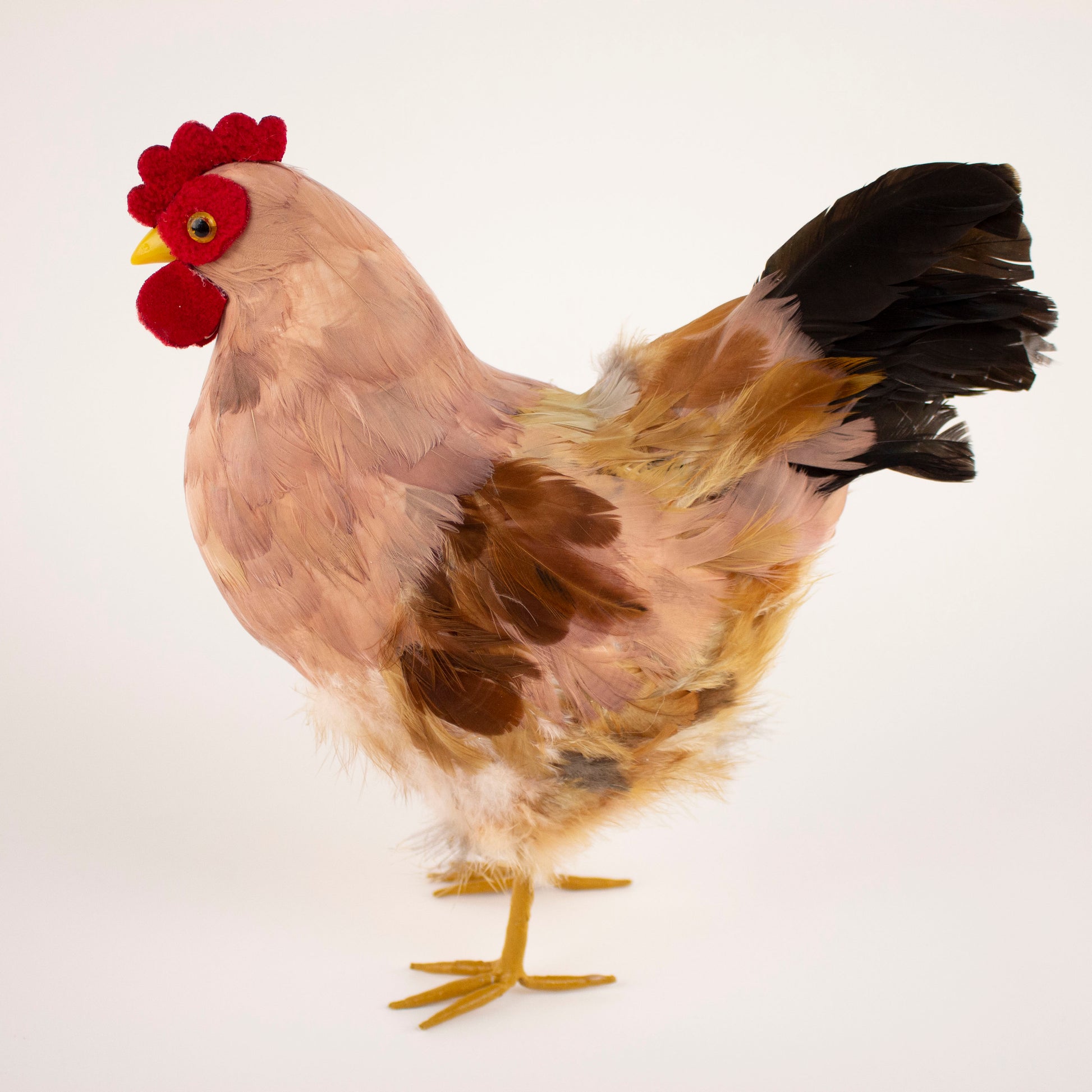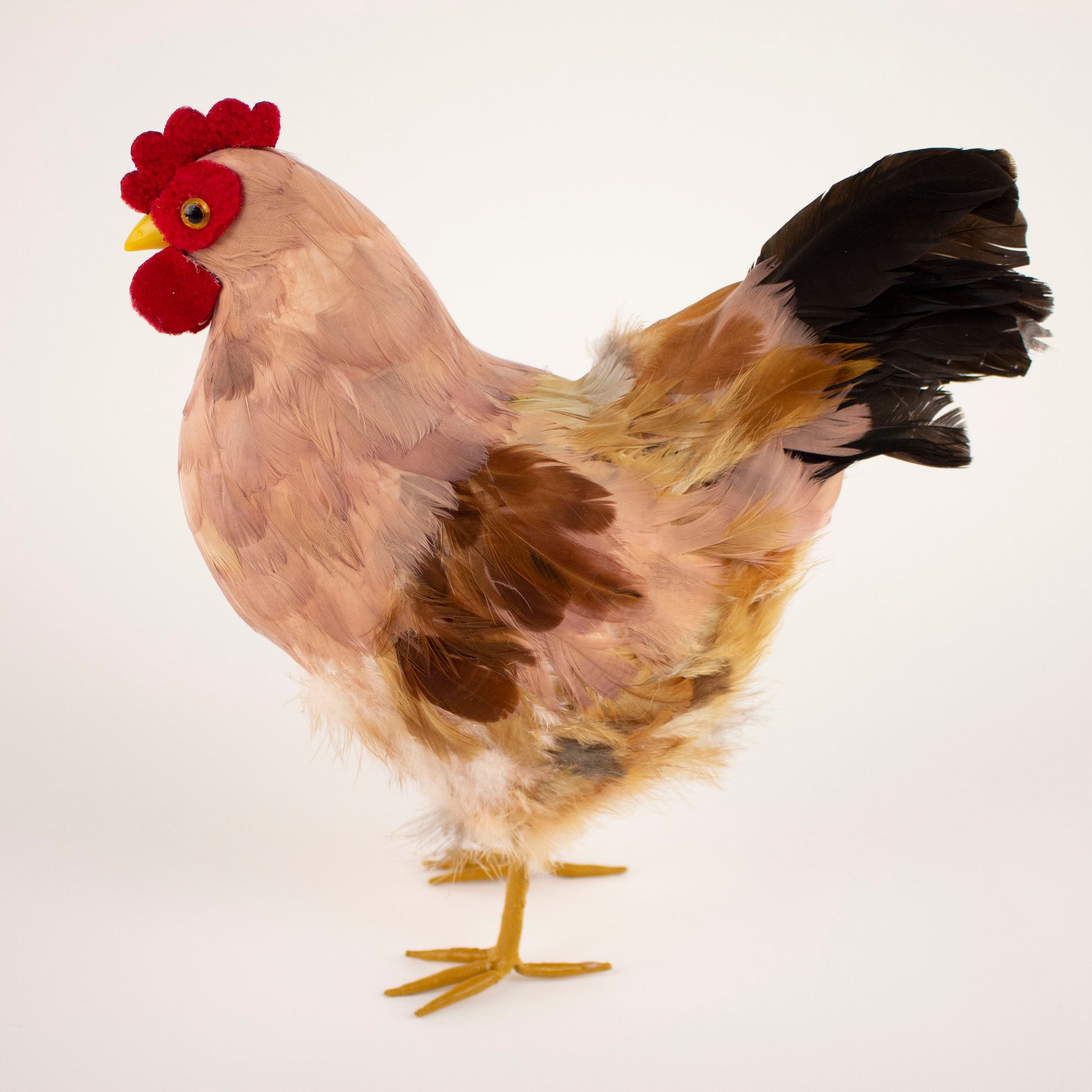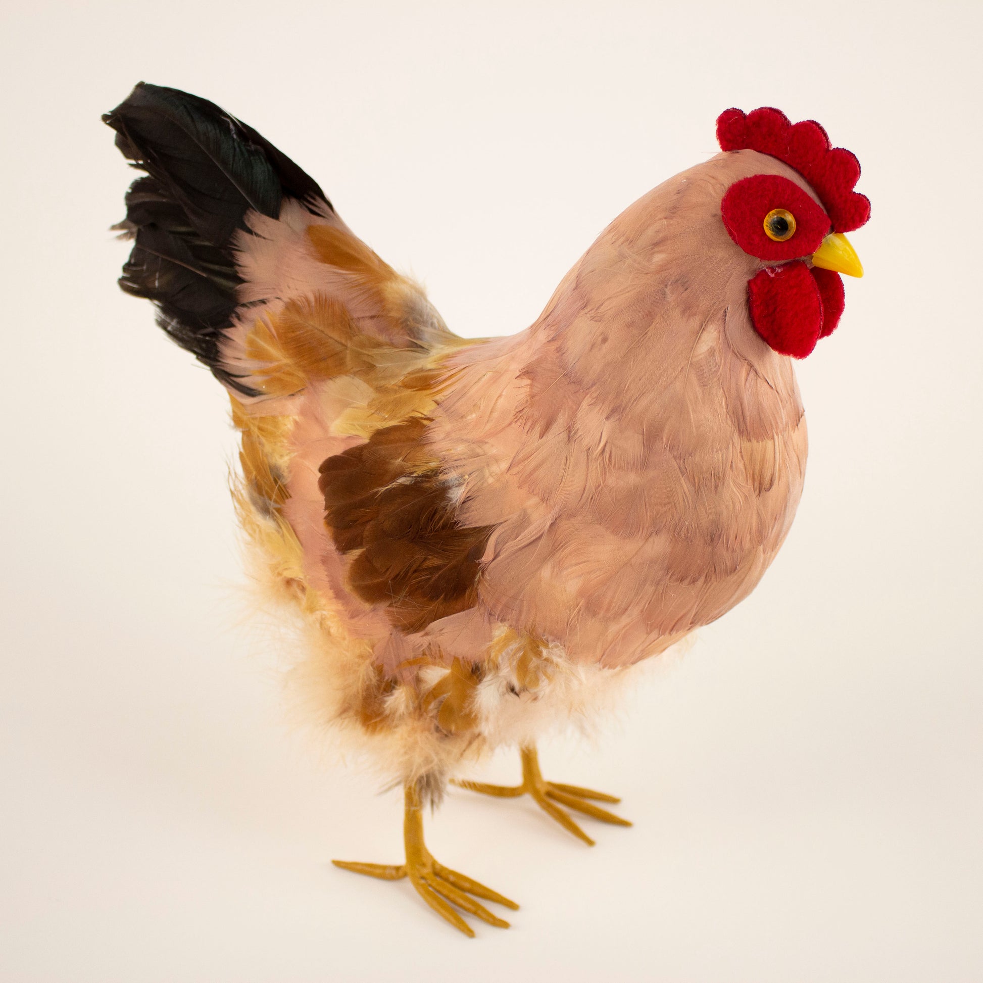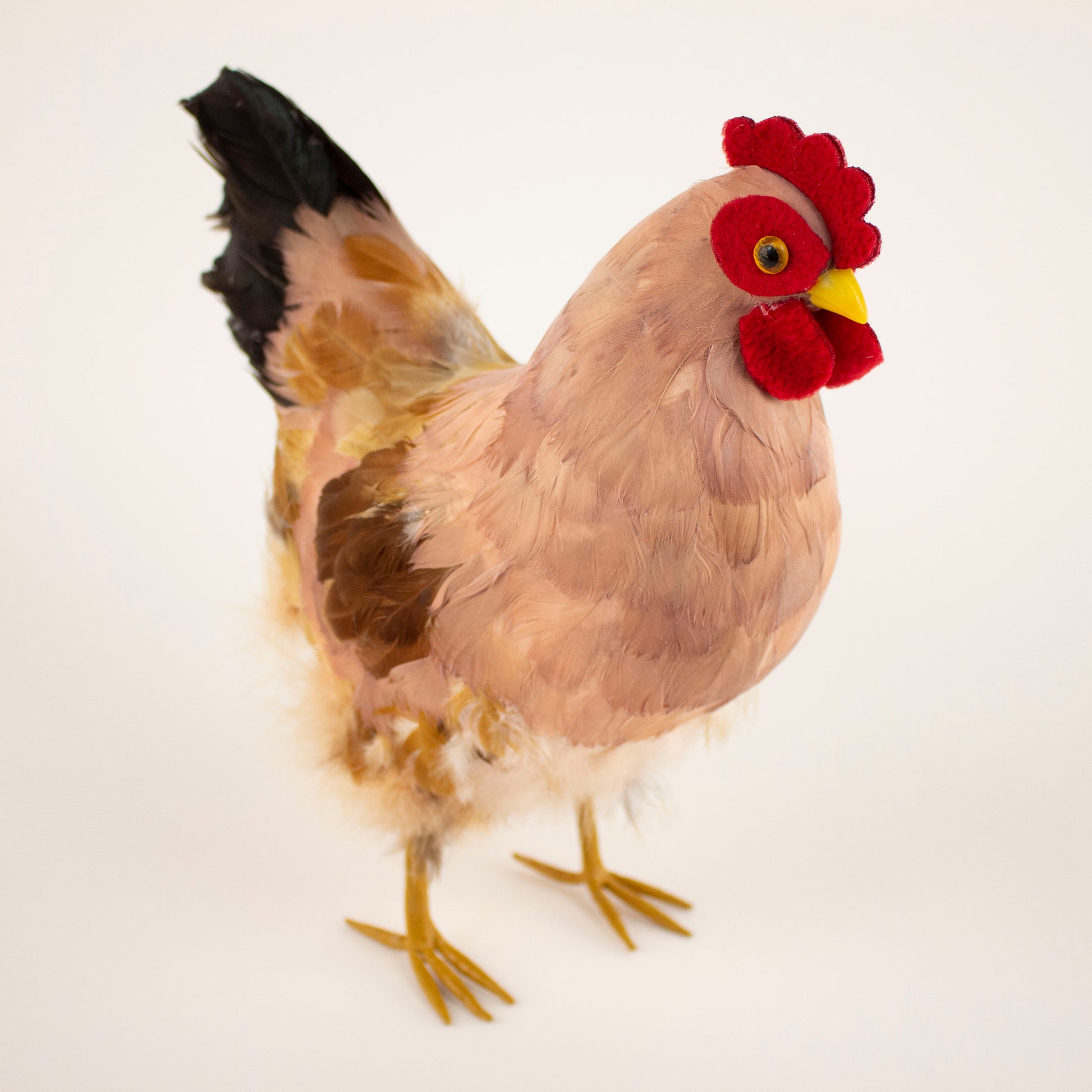 This fluffy feather hen measure 7" x 8" and can be displayed on its own or with our feathered hens of other sizes and colors. This natural feather hen is a great present for her or perfect for modern farmhouse decor.