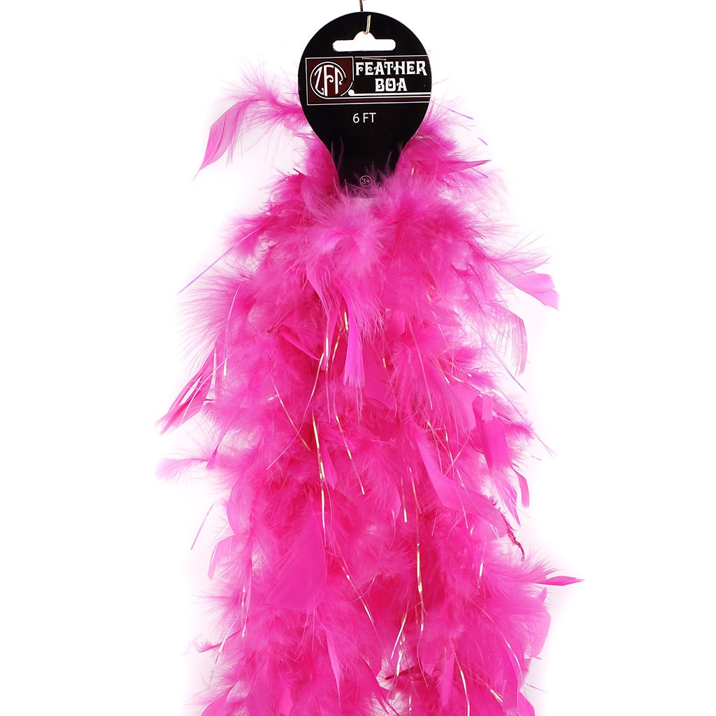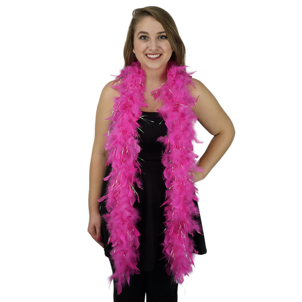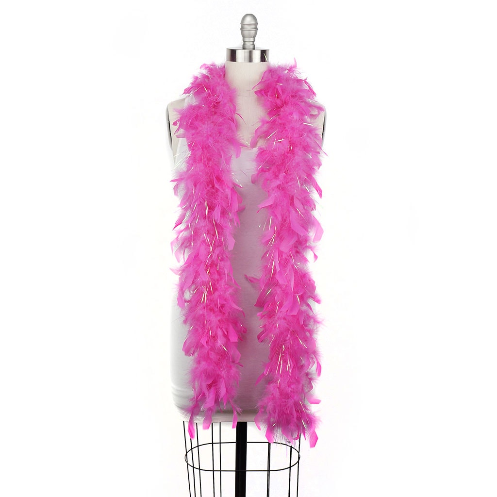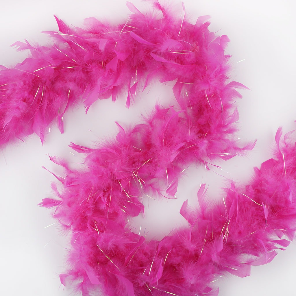 This small feather boa is the lightest of our chandelle boas. This pink feather boa has shiny opal lurex added among the fluffy feathers. Our thin feather boa measures 2 yards (6 ft) long, and approx 4-4.5" in diameter. This Zucker feather boa can be cut without unraveling as feathers are sewn on to a cotton cord.