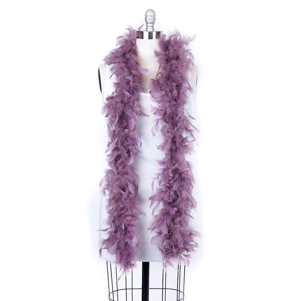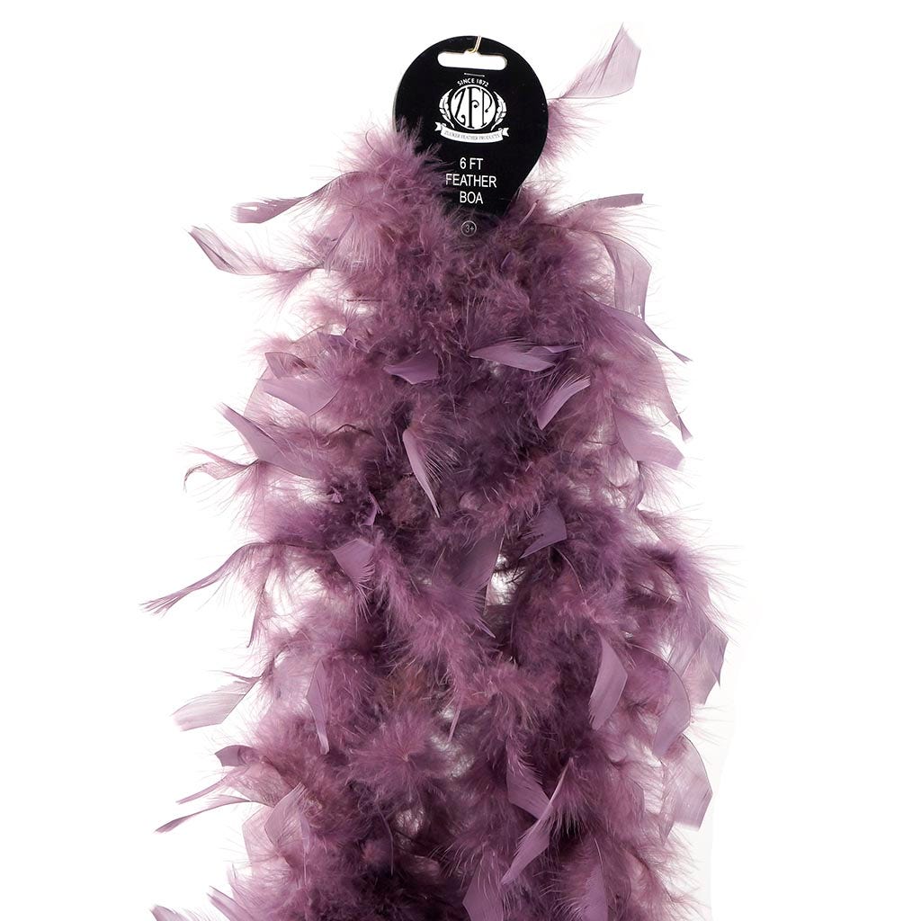 This purple feather boa is the lightest of our chandelle boas. Our thin feather boa measures 2 yards (6 ft) long, and approx 4-4.5" in diameter. This Zucker feather boa can be cut without unraveling as feathers are sewn on to a cotton cord.