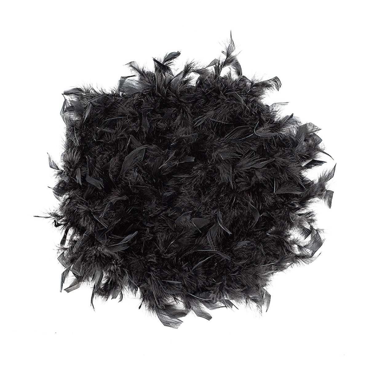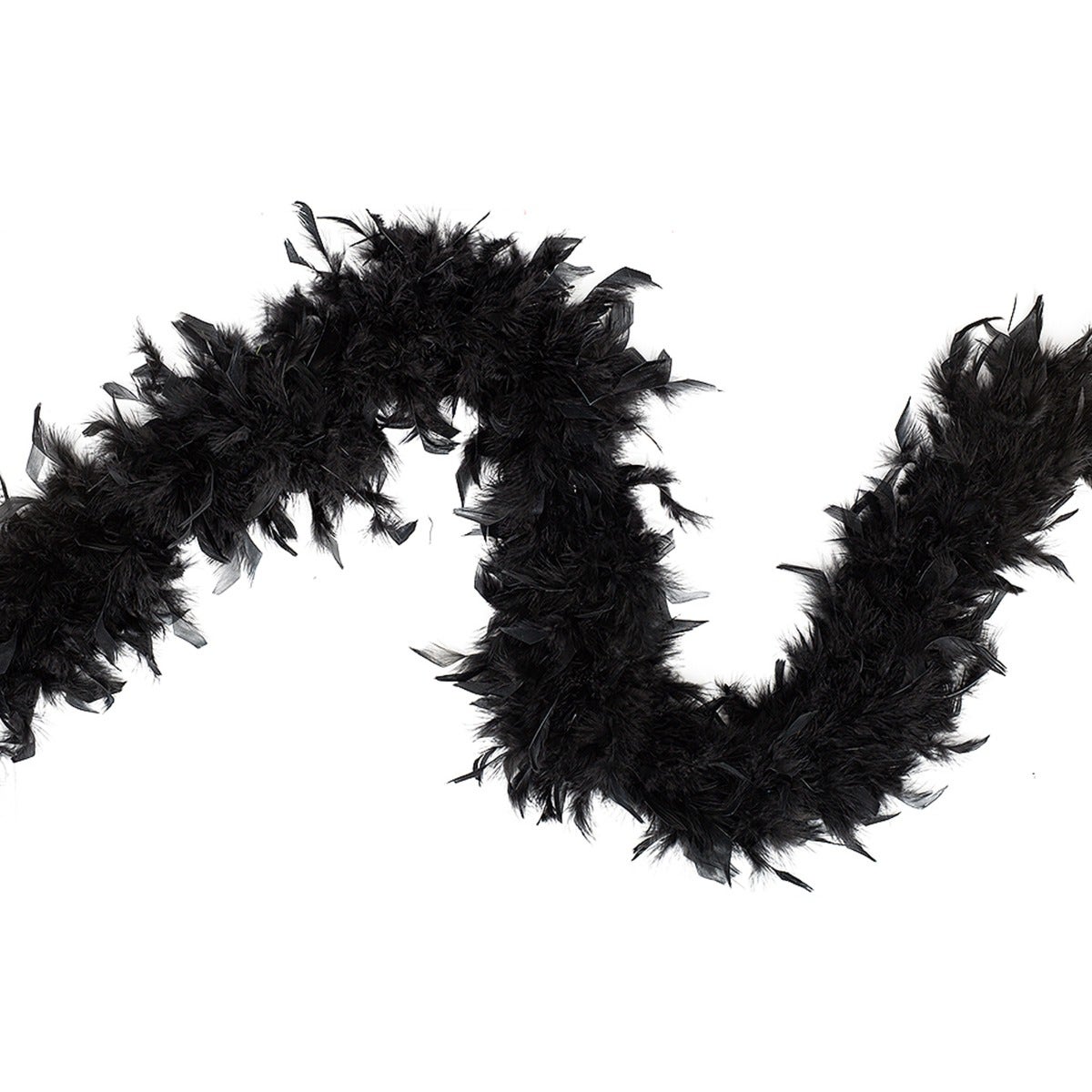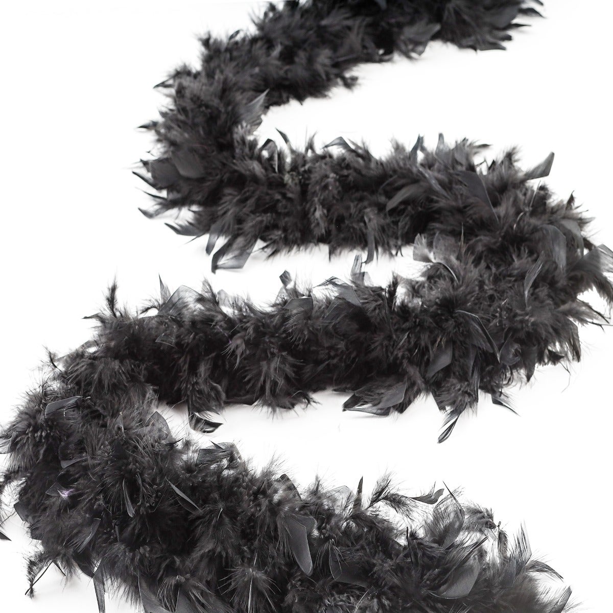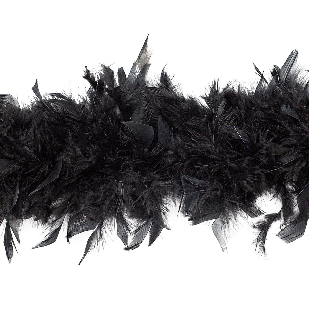 This fluffy feather boa is our medium weight chandelle boa. This black feather boa measures 2 yards (6 ft) long, and approx 5.5" in diameter. Our mid-sized Zucker feather boa gives you a fuller look without adding much additional cost. It can be cut without unraveling as feathers are sewn on to a cotton cord