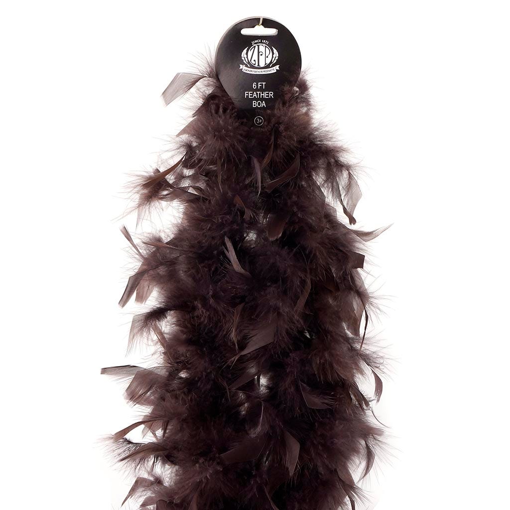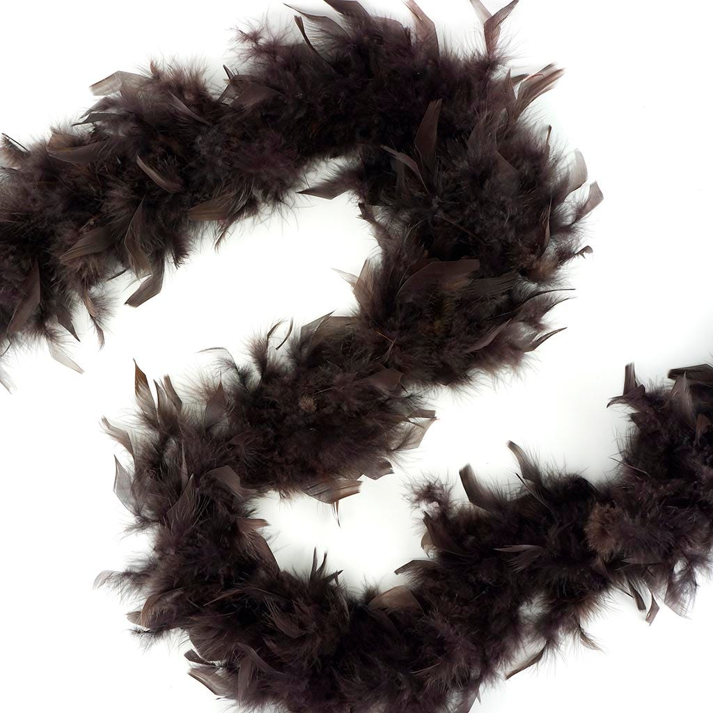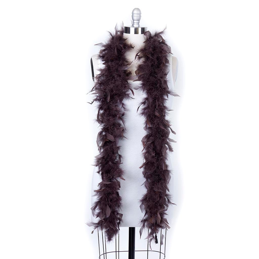 This brown feather boa is the lightest of our chandelle boas. Our thin feather boa measures 2 yards (6 ft) long, and approx 4-4.5" in diameter. This Zucker feather boa can be cut without unraveling as feathers are sewn on to a cotton cord.