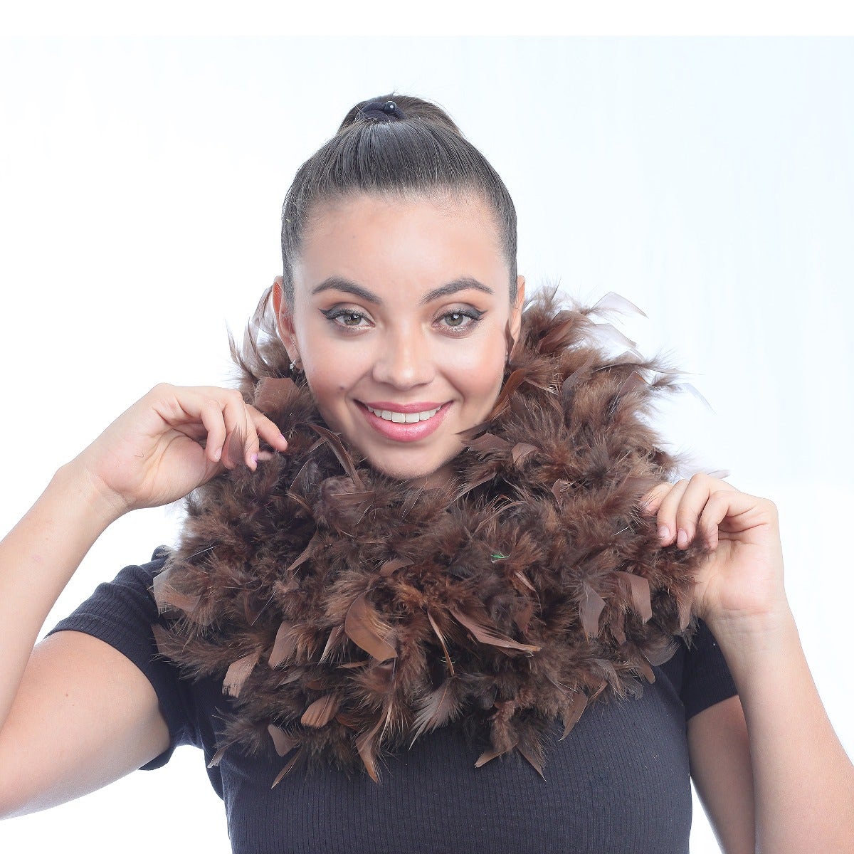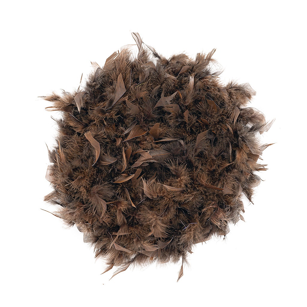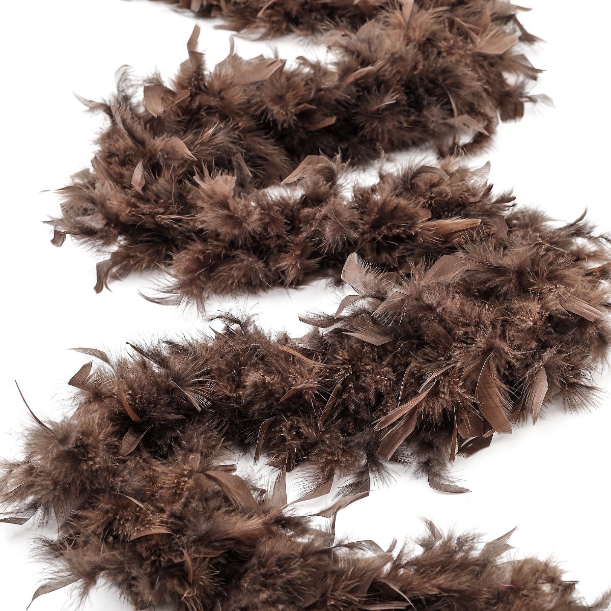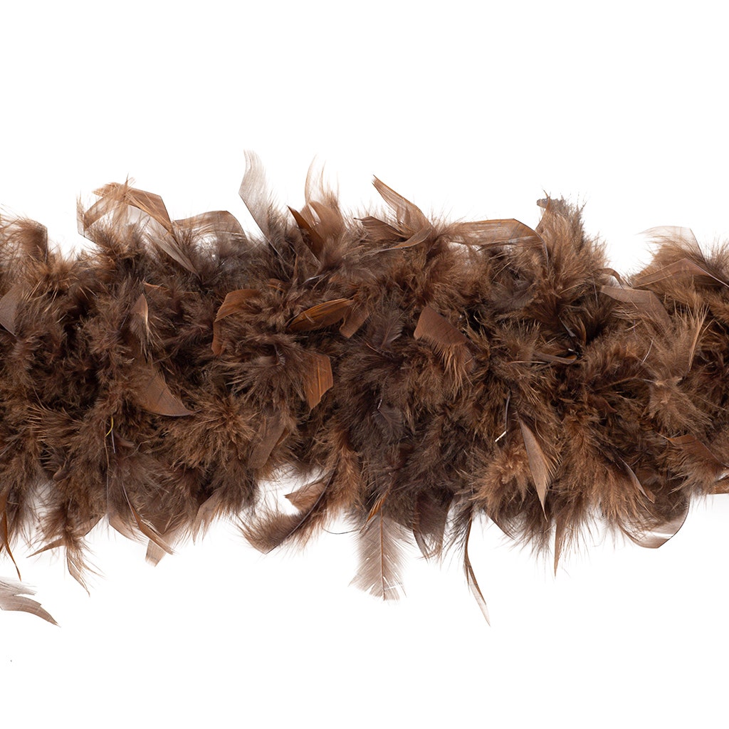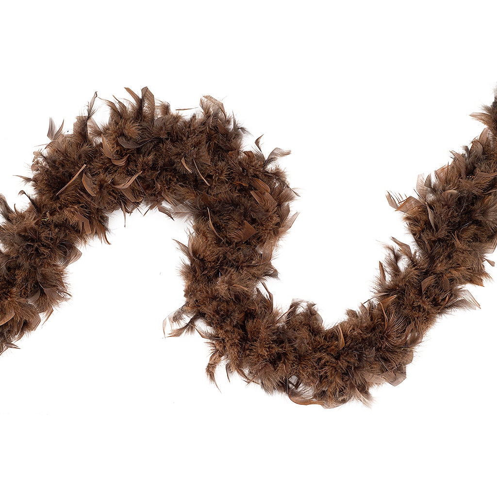 This fluffy feather boa is our medium weight chandelle boa. This brown feather boa measures 2 yards (6 ft) long, and approx 5.5" in diameter. Our mid-sized Zucker feather boa gives you a fuller look without adding much additional cost. It can be cut without unraveling as feathers are sewn on to a cotton cord
