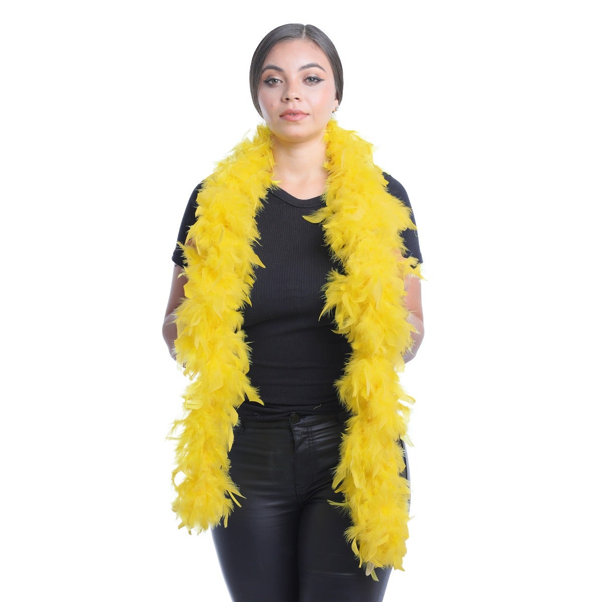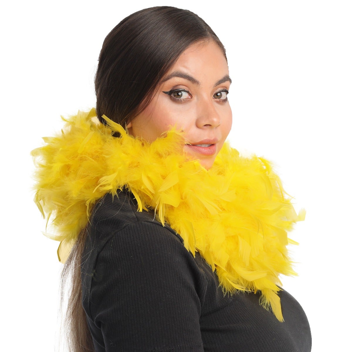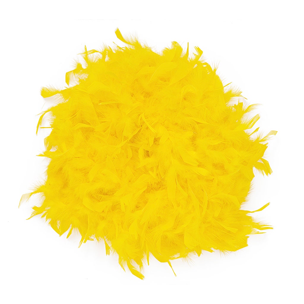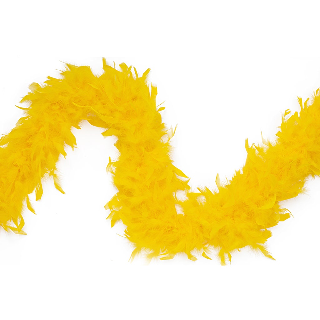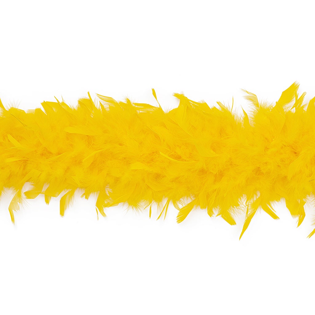 This fluffy feather boa is our medium weight chandelle boa. This gold feather boa measures 2 yards (6 ft) long, and approx 5.5" in diameter. Our mid-sized Zucker feather boa gives you a fuller look without adding much additional cost. It can be cut without unraveling as feathers are sewn on to a cotton cord