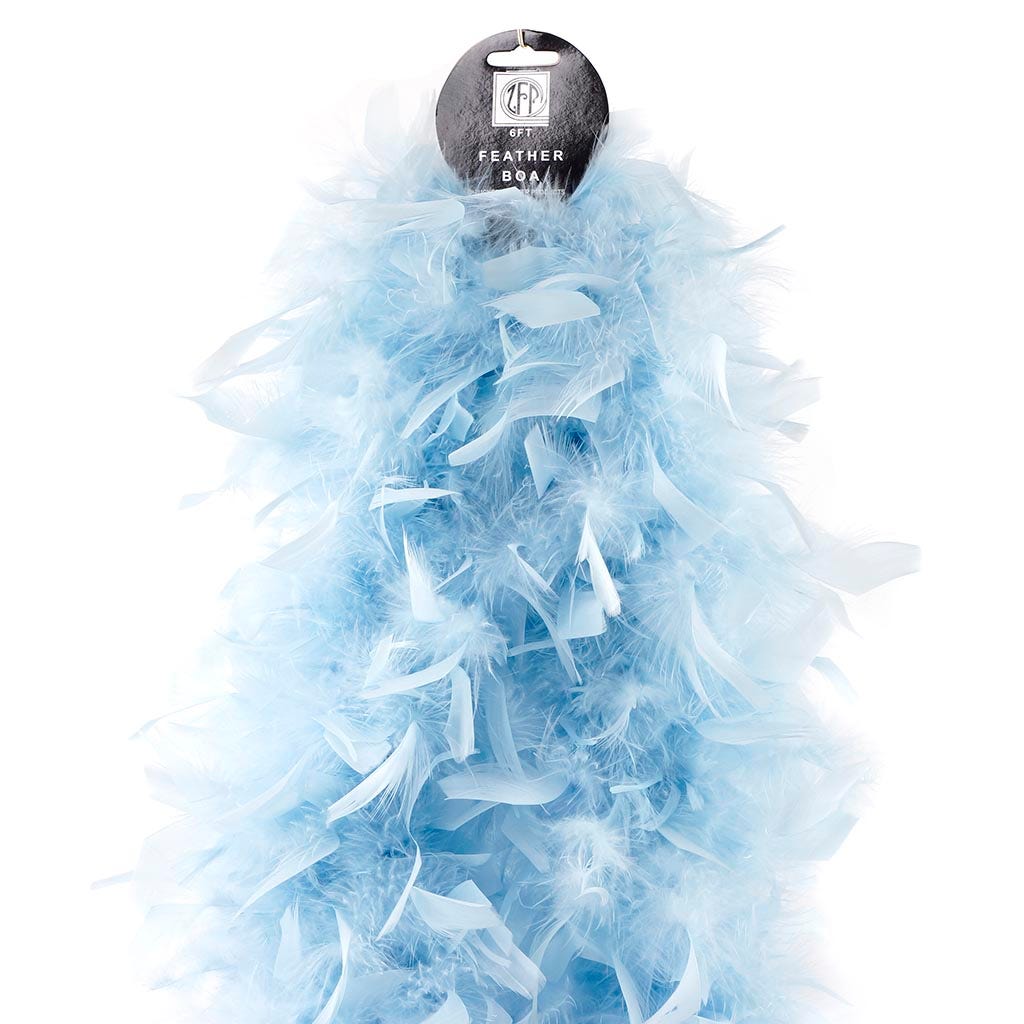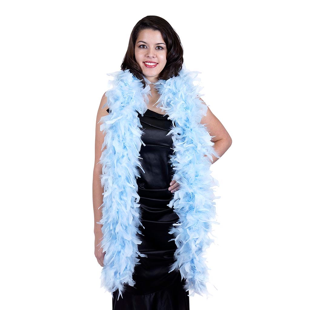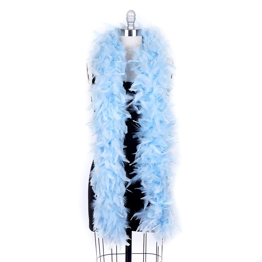 This light blue feather boa is the fullest and most luxurious of the thick feather boas made from chandelle. Our Zucker feather boa measures 2 yards (6 ft) long, and approx 7.5" in diameter.