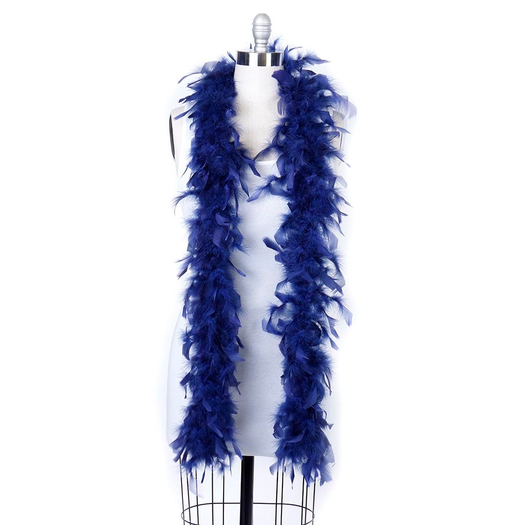 This navy feather boa is the lightest of our chandelle boas. Our thin feather boa measures 2 yards (6 ft) long, and approx 4-4.5" in diameter. This Zucker feather boa can be cut without unraveling as feathers are sewn on to a cotton cord.