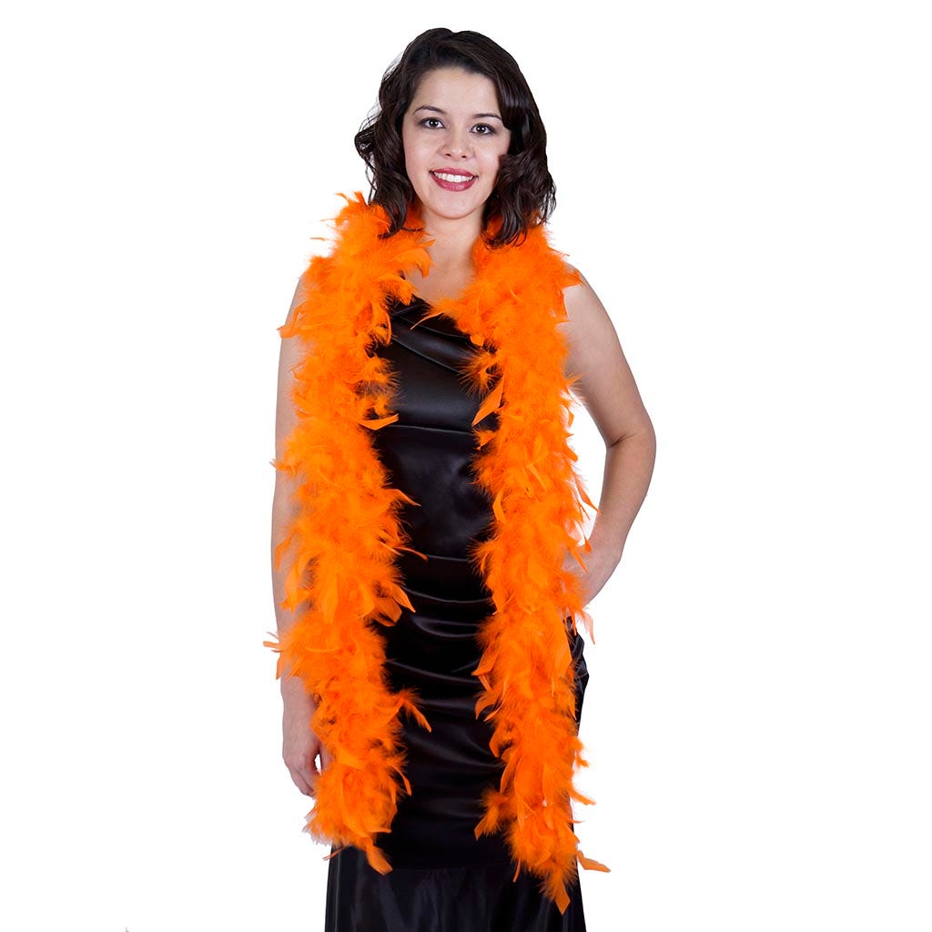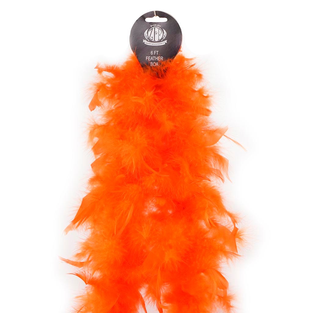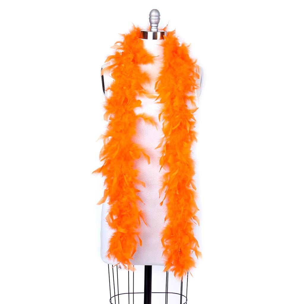 This orange feather boa is the lightest of our chandelle boas. Our thin feather boa measures 2 yards (6 ft) long, and approx 4-4.5" in diameter. This Zucker feather boa can be cut without unraveling as feathers are sewn on to a cotton cord.