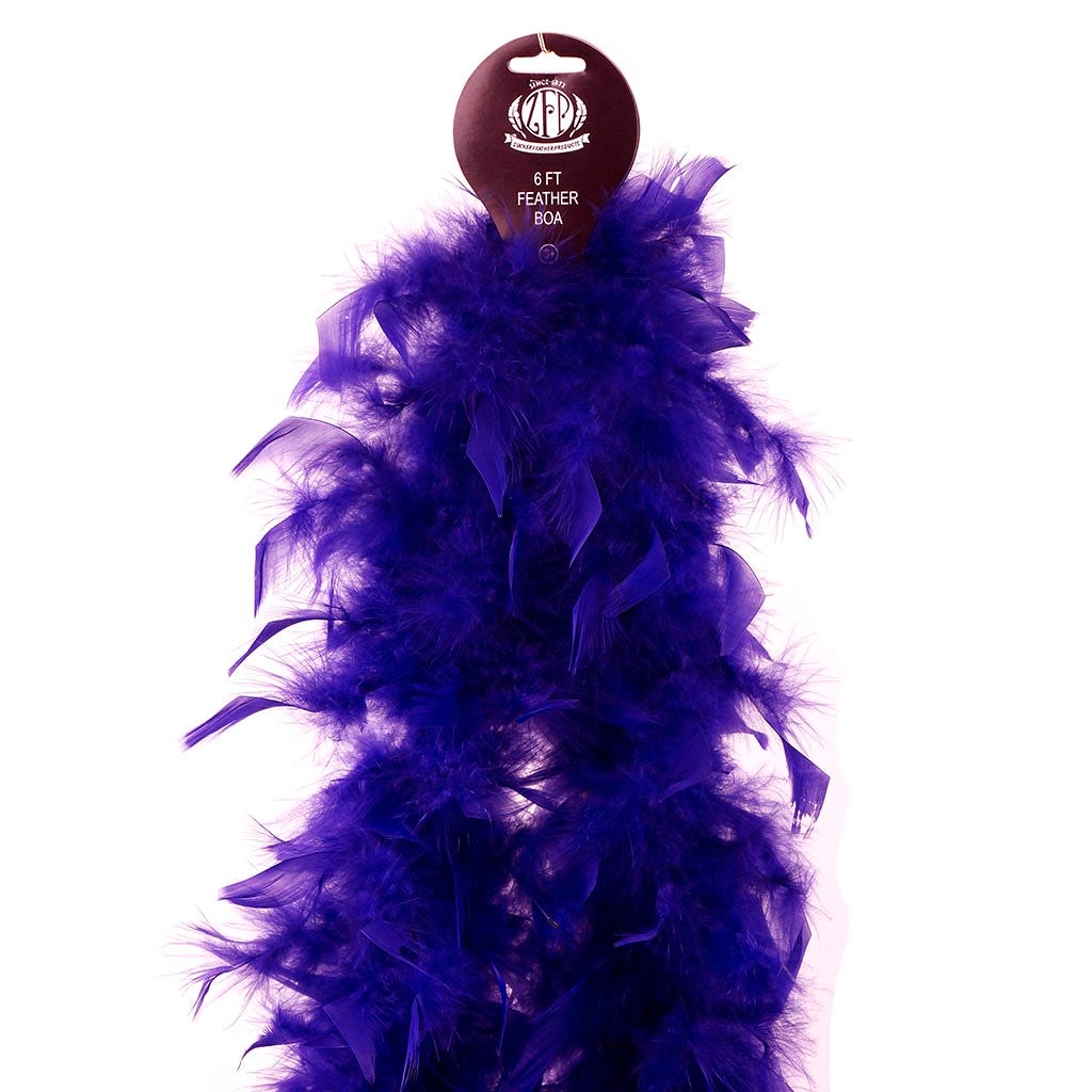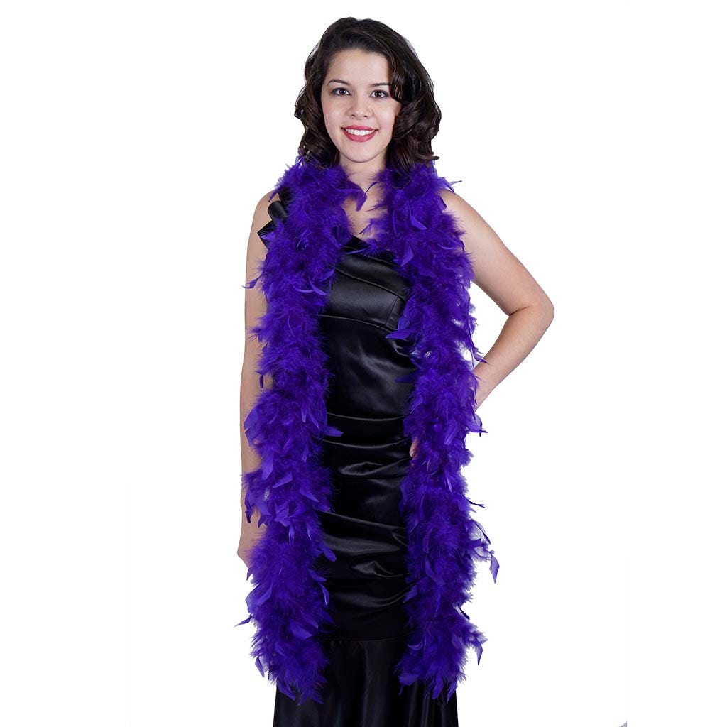 This purple feather boa is the lightest of our chandelle boas. Our thin feather boa measures 2 yards (6 ft) long, and approx 4-4.5" in diameter. This Zucker feather boa can be cut without unraveling as feathers are sewn on to a cotton cord.