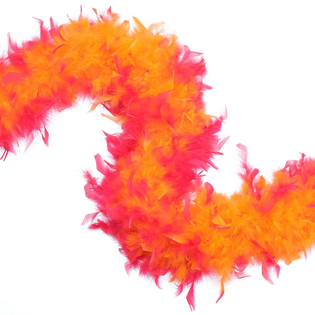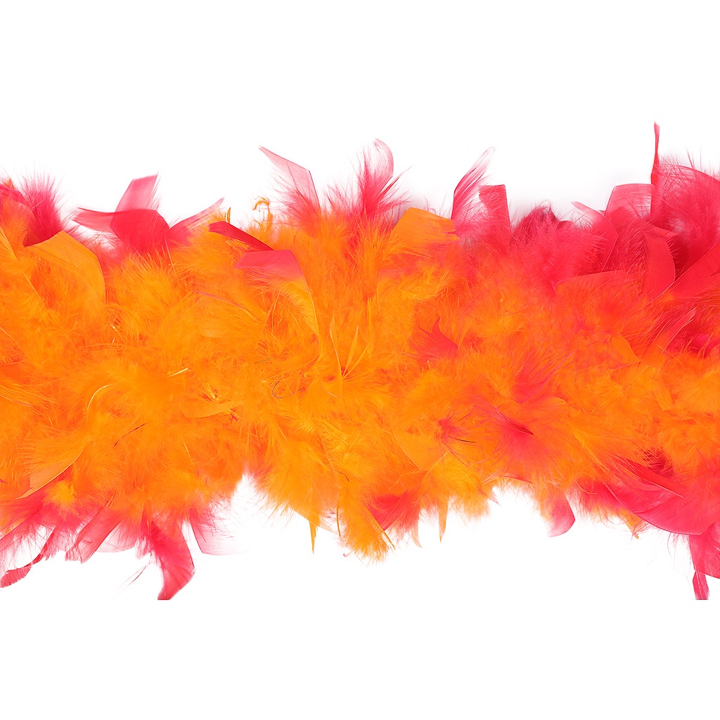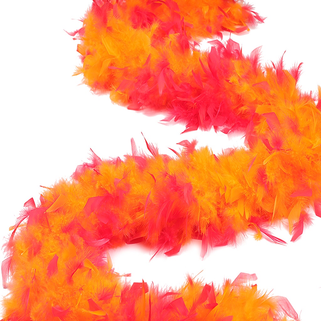 This neon feather boa is the fullest and most luxurious of the thick feather boas made from chandelle. Our Zucker feather boa measures 2 yards (6 ft) long, and approx 7.5" in diameter. The unique look of this orange and hot pink feather boa comes from a two-step dyeing process that leaves the inside of the feathers and boa one color and the tips the outer portion another color.