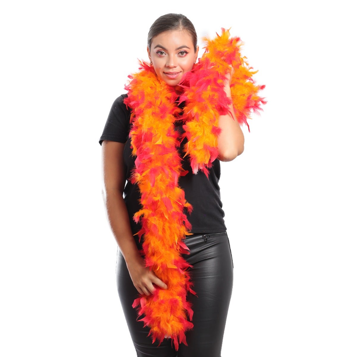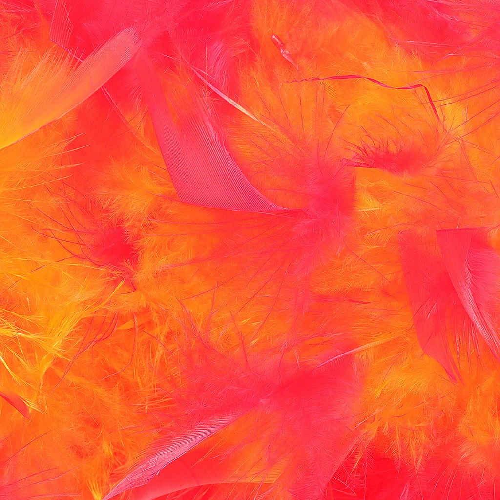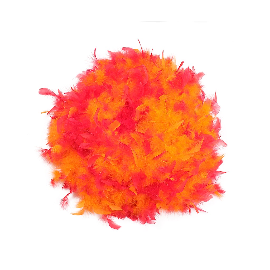 This neon feather boa is the fullest and most luxurious of the thick feather boas made from chandelle. Our Zucker feather boa measures 2 yards (6 ft) long, and approx 7.5" in diameter. The unique look of this orange and hot pink feather boa comes from a two-step dyeing process that leaves the inside of the feathers and boa one color and the tips the outer portion another color.