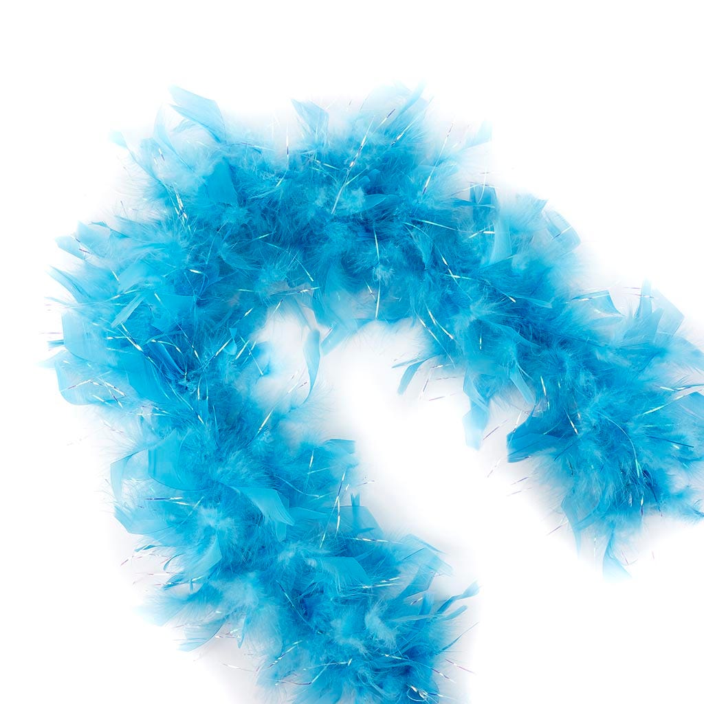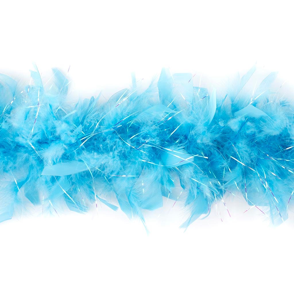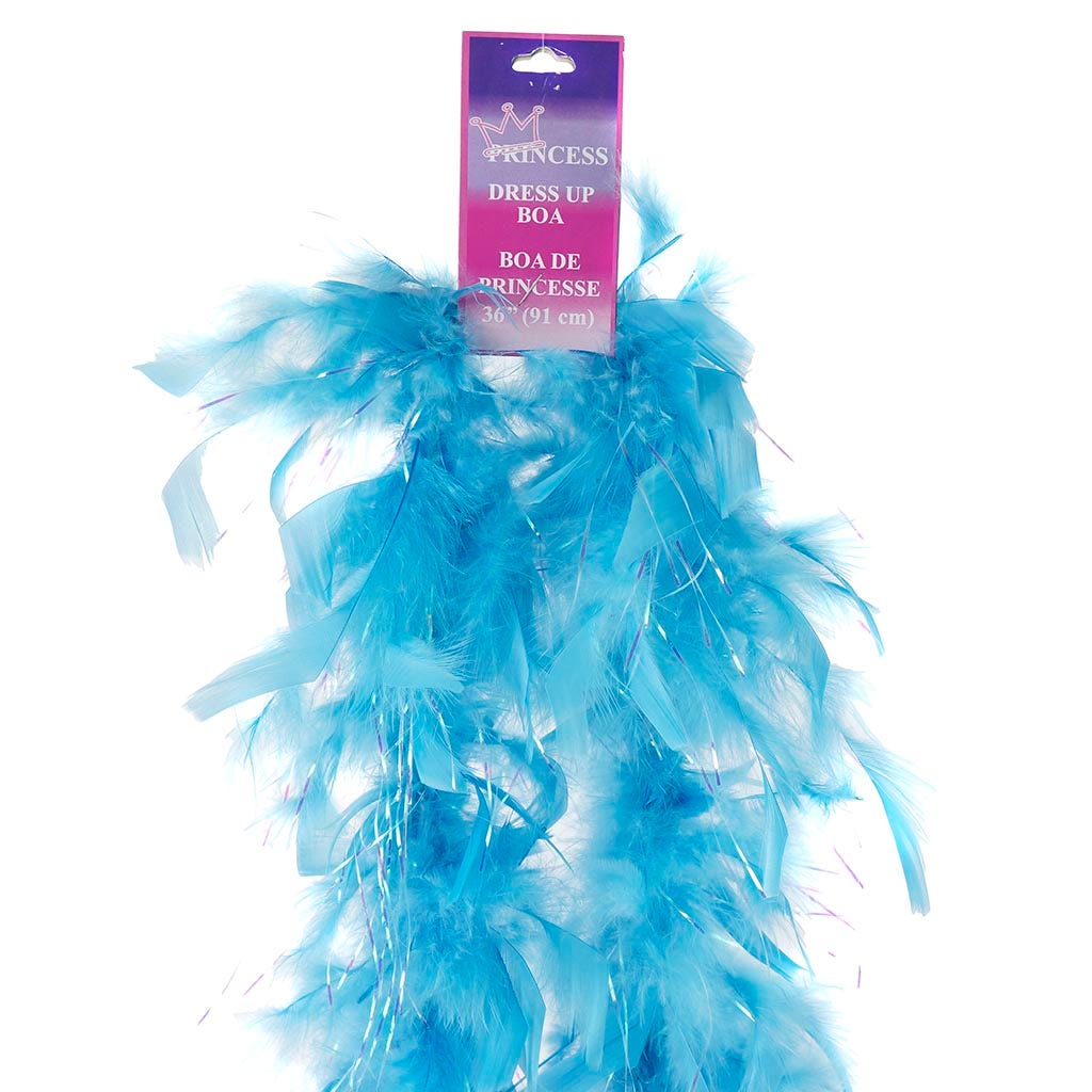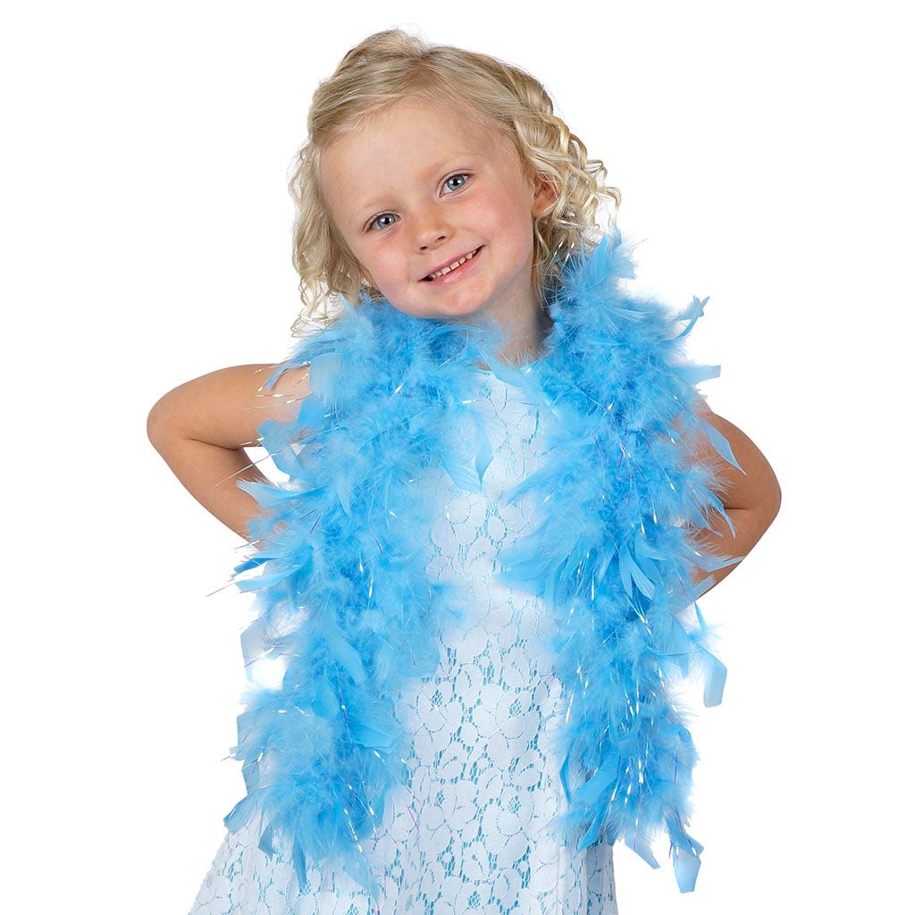 This fluffy boa with opal lurex adds a touch of sparkle. The light blue feather boa is half the length of our regular chandelle feather boa at 3 ft long and approx. 4" in diameter, making it a perfect accessory for a tea party, princess costume, a toddler feather boa or as a birthday party favor.