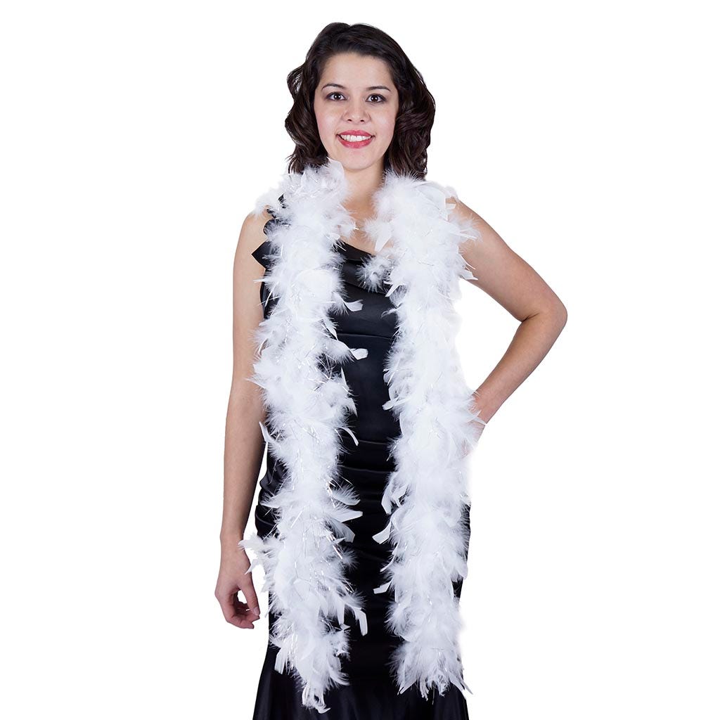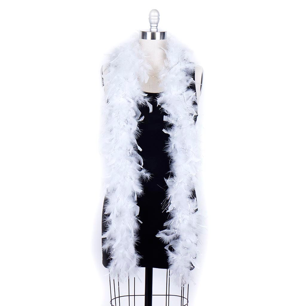 This small feather boa is the lightest of our chandelle boas. This white feather boa has shiny silver lurex added among the fluffy feathers. Our thin feather boa measures 2 yards (6 ft) long, and approx 4-4.5" in diameter. This Zucker feather boa can be cut without unraveling as feathers are sewn on to a cotton cord.