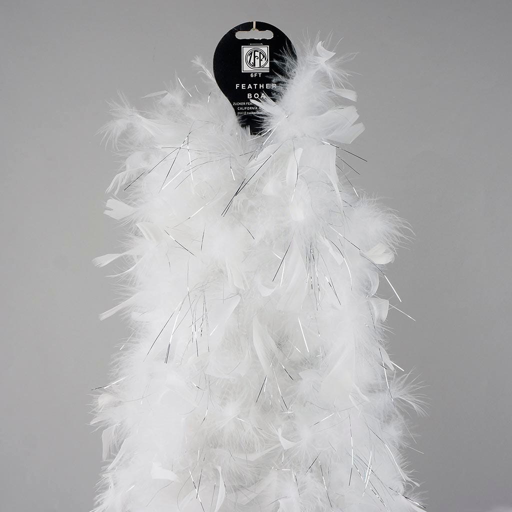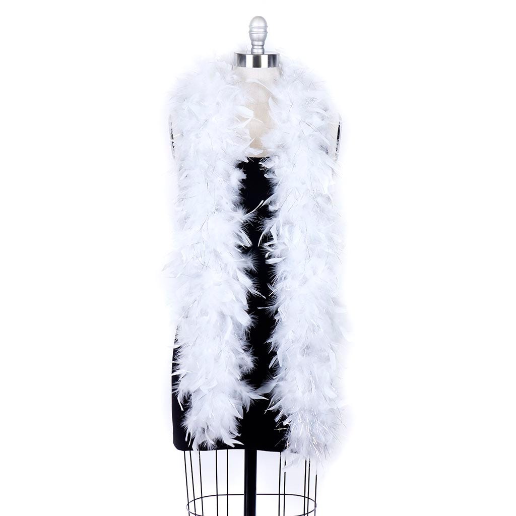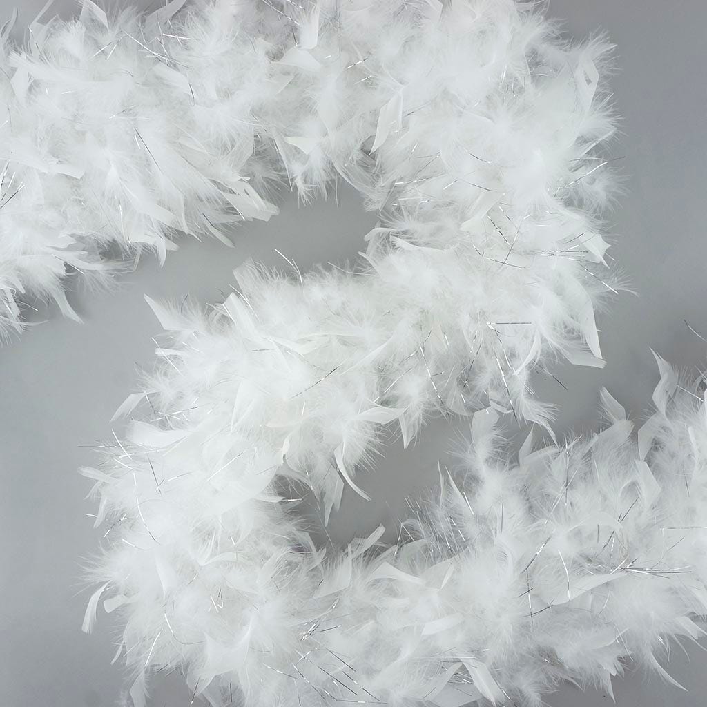 This fluffy feather boa is our medium weight chandelle boa. This white feather boa has shiny silver lurex added among the feathers. Our chandelle turkey feather boa measures 2 yards (6 ft) long, and approx 5.5" in diameter. This mid-sized Zucker feather boa gives you a fuller look without adding much additional cost. It can be cut without unraveling as feathers are sewn on to a cotton cord