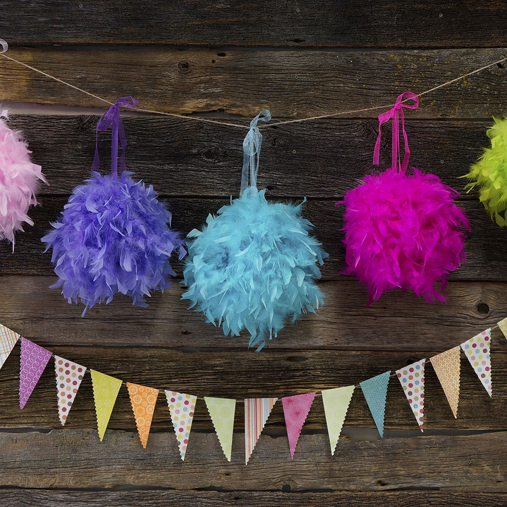 Chandelle Feather Pom Poms measure 12 inches in diameter and are made with Chandelle Feather Boas. Whimsical and festive, these hanging feather Pom Pom decorations can brighten up any party space. Go Green and use recycled newspaper, tissue paper, craft paper or plastic bags to fill your Chandelle Feather Pom Pom. Matching organza ribbon can be adjusted like a drawstring to open, close & hang your Chandelle Feather Pom Poms. Use for Birthday Parties, Weddings, Halloween, Christmas, New Years & more...
