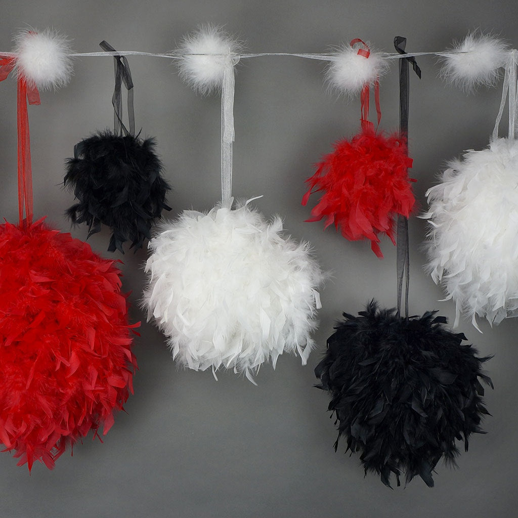 Chandelle Feather Pom Poms measure 6 inches in diameter and are made with Chandelle Feather Boas. Whimsical and festive, these hanging feather Pom Pom decorations can brighten up any party space. Go Green and use recycled newspaper, tissue paper, craft paper or plastic bags to fill your Chandelle Feather Pom Pom. Matching organza ribbon can be adjusted like a drawstring to open, close & hang your Chandelle Feather Pom Poms. Use for Birthday Parties, Weddings, Halloween, Christmas, New Years & more...