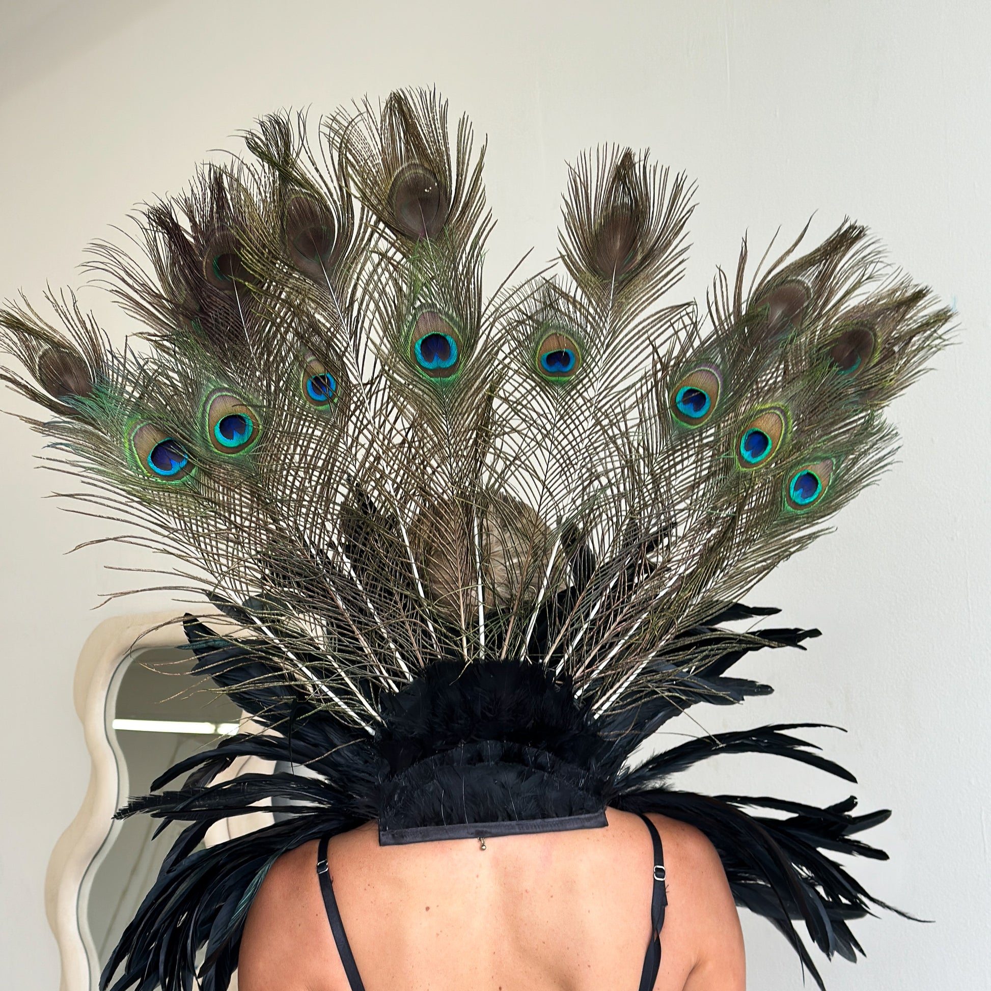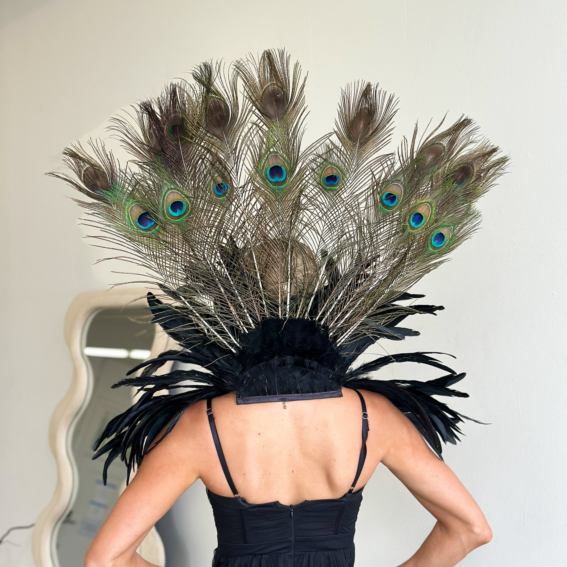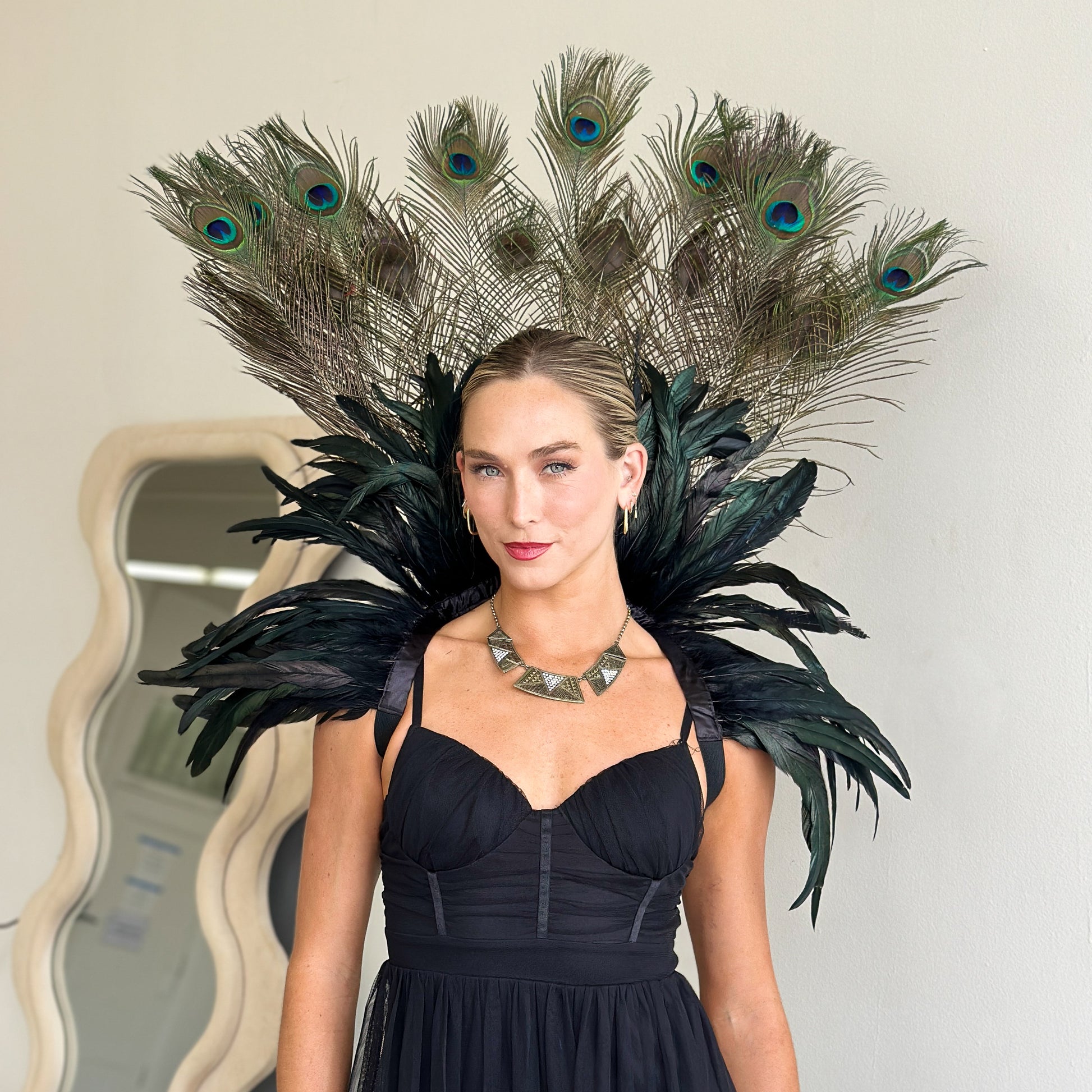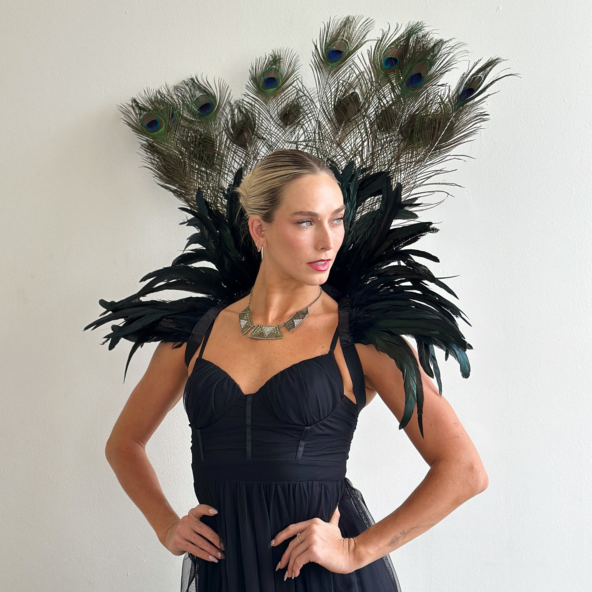 Make a striking statement with this luxurious feather collar, handcrafted from 10–12" black iridescent rooster coque tail feathers and adorned with stunning 12–20" natural peacock tail feathers. Designed for performers and costume lovers, The deep, iridescent tones create a captivating blend of drama and elegance—perfect for showgirls, burlesque, drag, cosplay, or high-fashion costume styling.