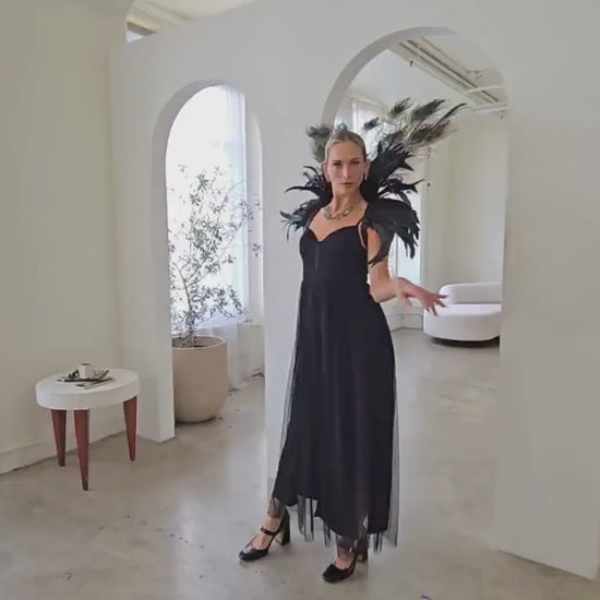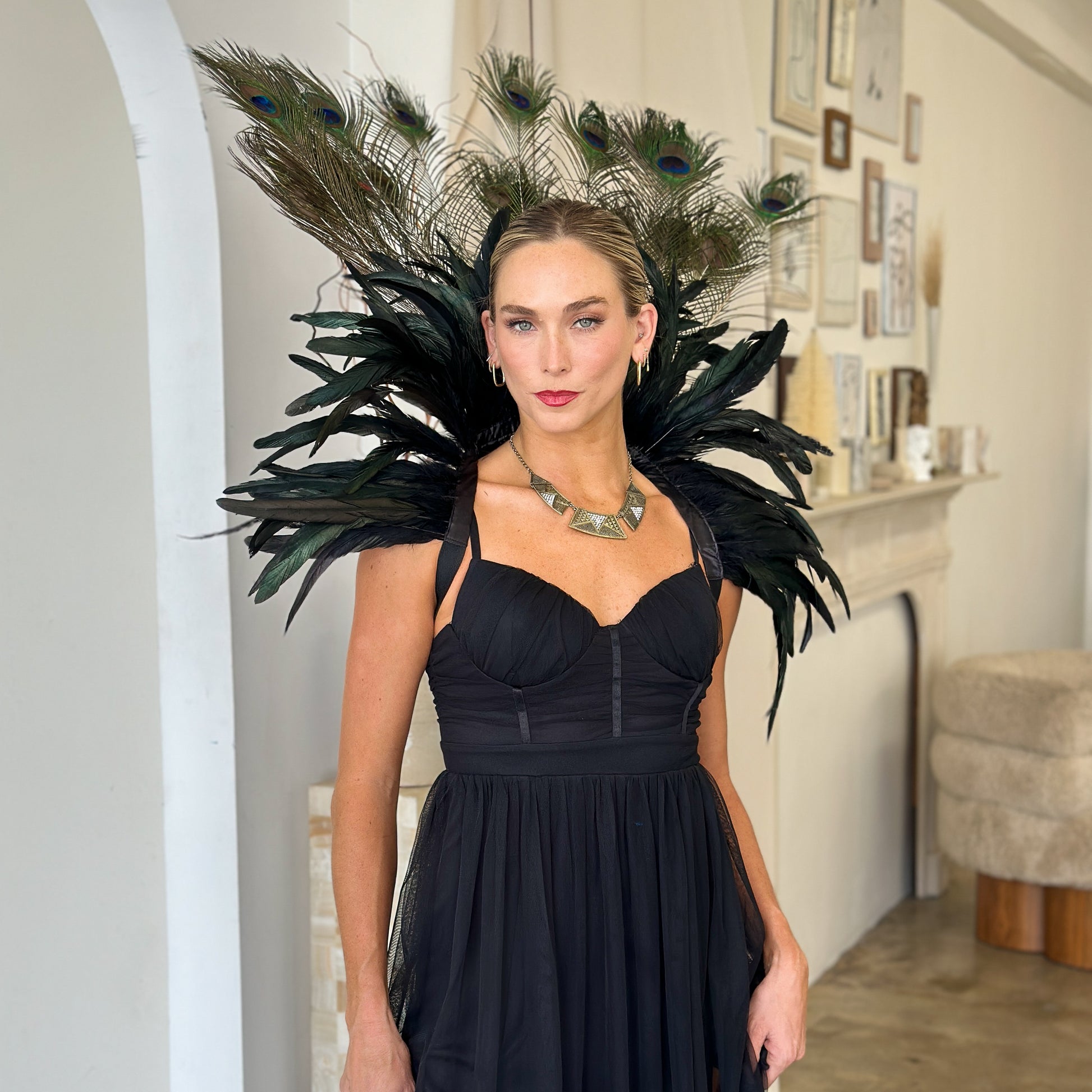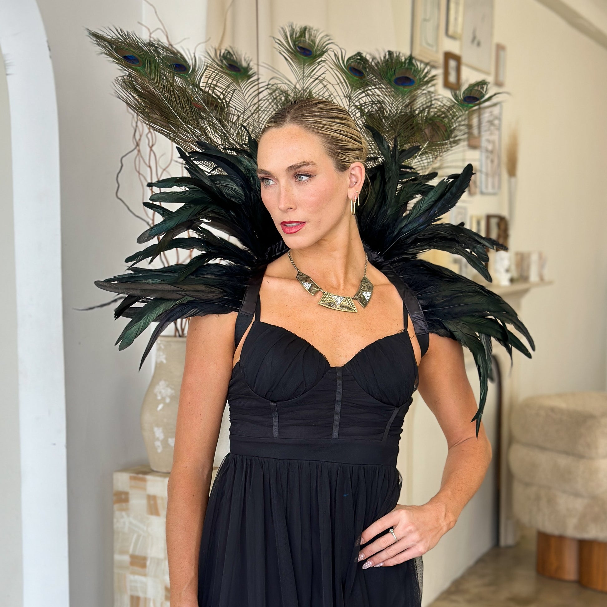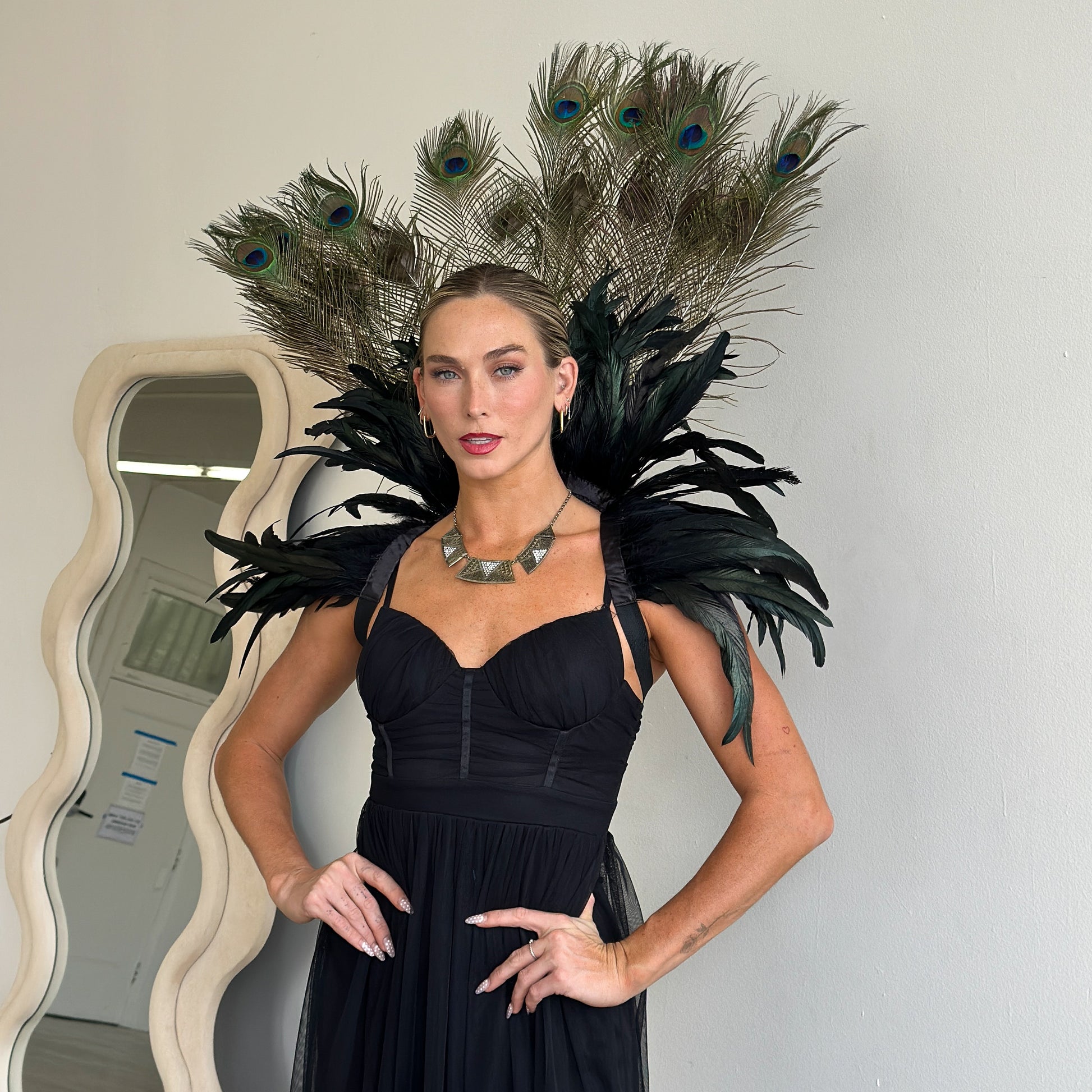 Make a striking statement with this luxurious feather collar, handcrafted from 10–12" black iridescent rooster coque tail feathers and adorned with stunning 12–20" natural peacock tail feathers. Designed for performers and costume lovers, The deep, iridescent tones create a captivating blend of drama and elegance—perfect for showgirls, burlesque, drag, cosplay, or high-fashion costume styling.