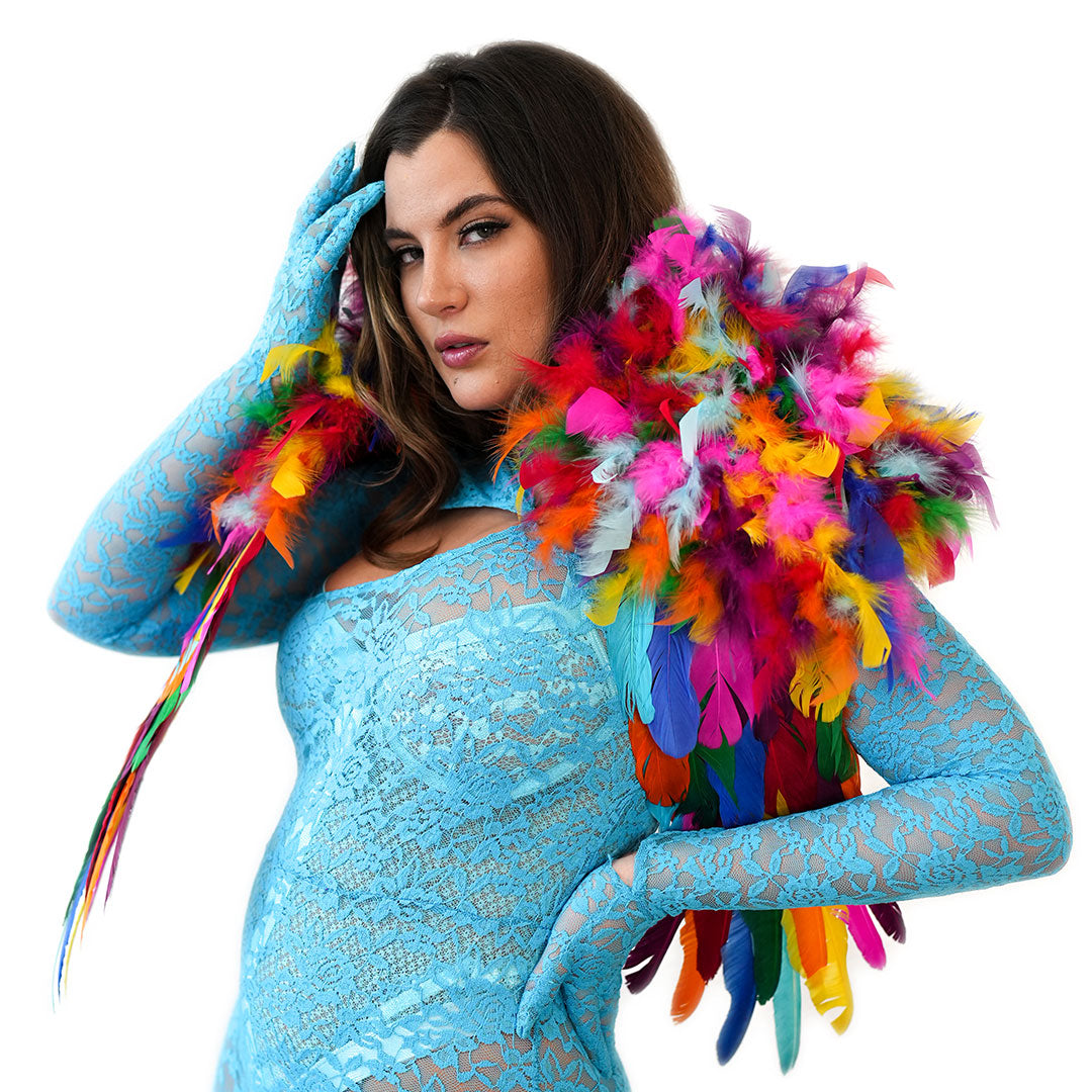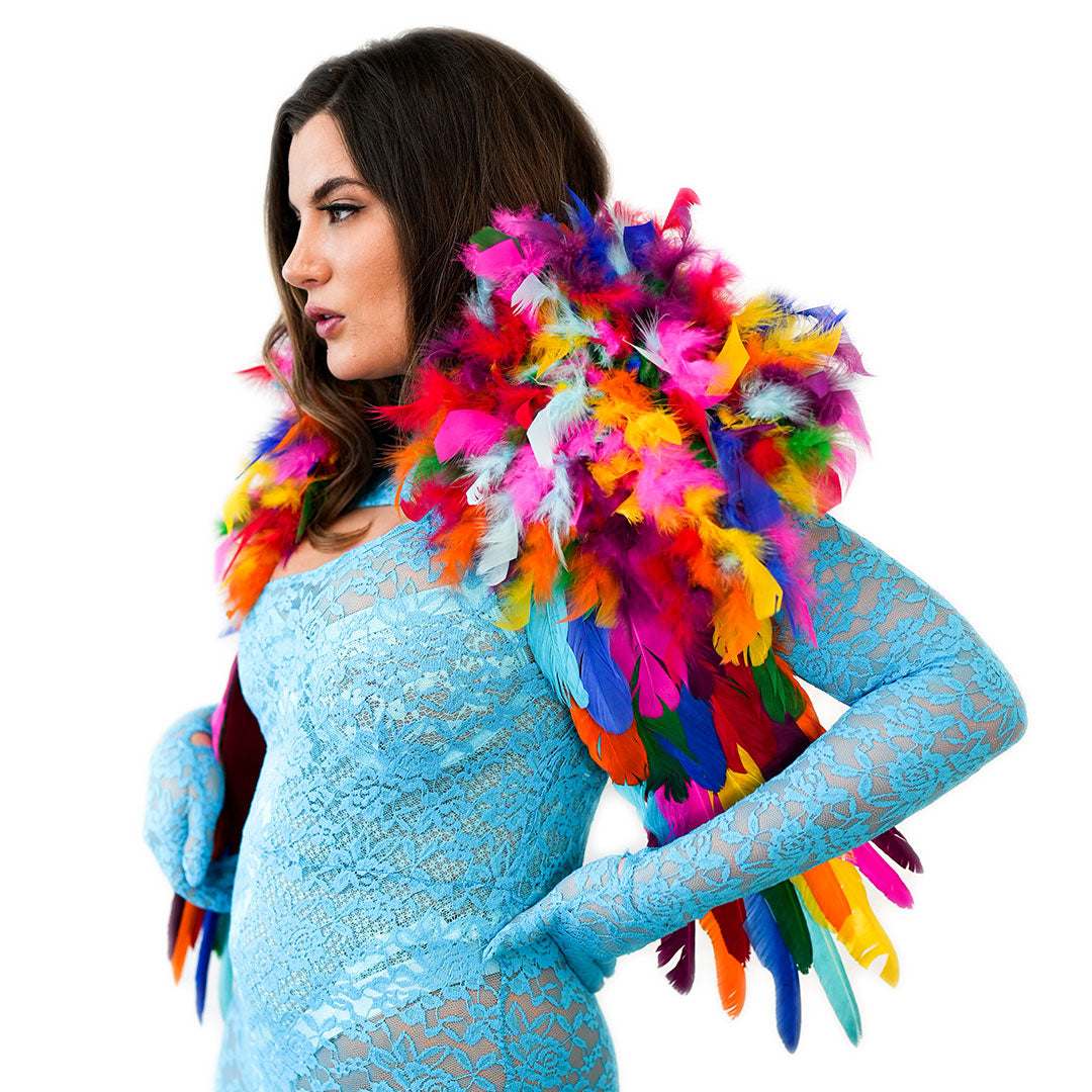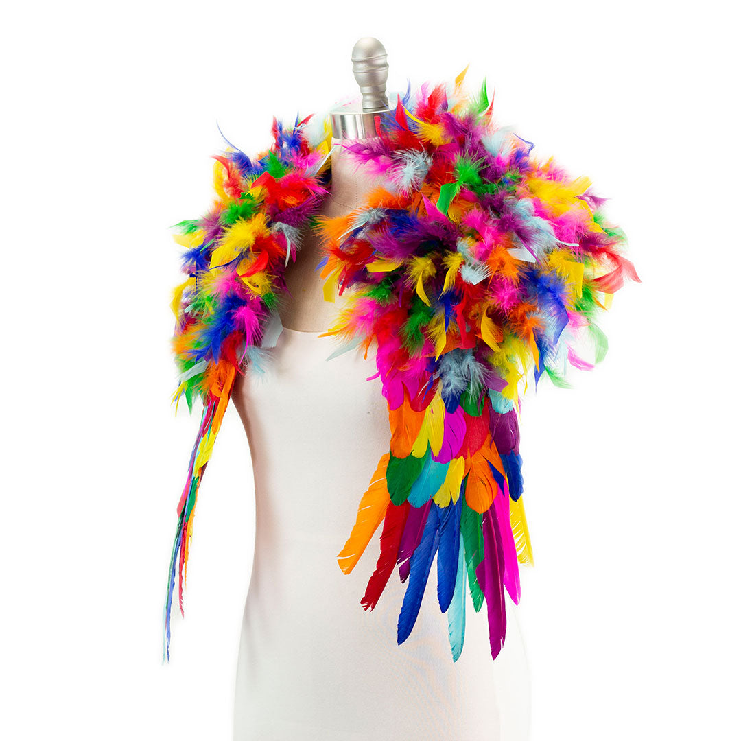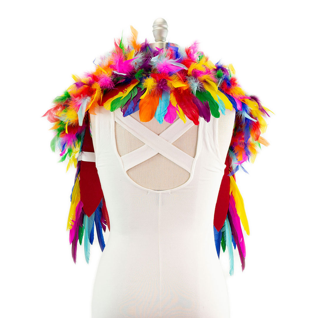 Make a bold fashion statement with our stunning Rainbow Feather Shrug (RAINBOWBRIGHT). This feather shrug, measuring 25 in x 24 in x 1.5 in, wraps around the shoulders and effortlessly drapes down the chest, offering a comfortable fit that you can wear all day or night long. Its eye-catching design is sure to make heads turn and create an impact wherever you go. This shrug, equipped with soft shoulder pads for added comfort, is particularly suitable for tight spaces where larger boas or wings would be impractical to manage. Step into the spotlight and embrace your boldness with this unique shoulder accessory.