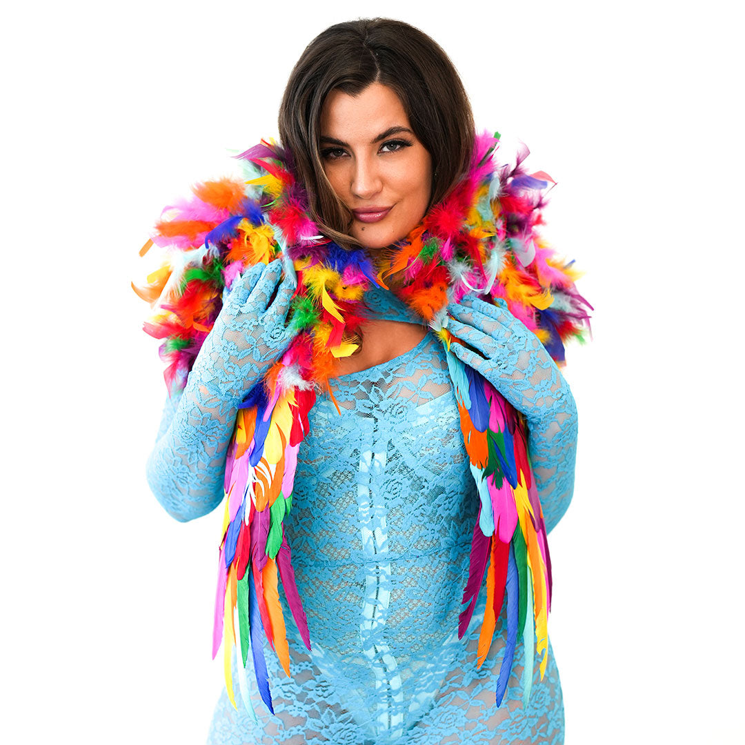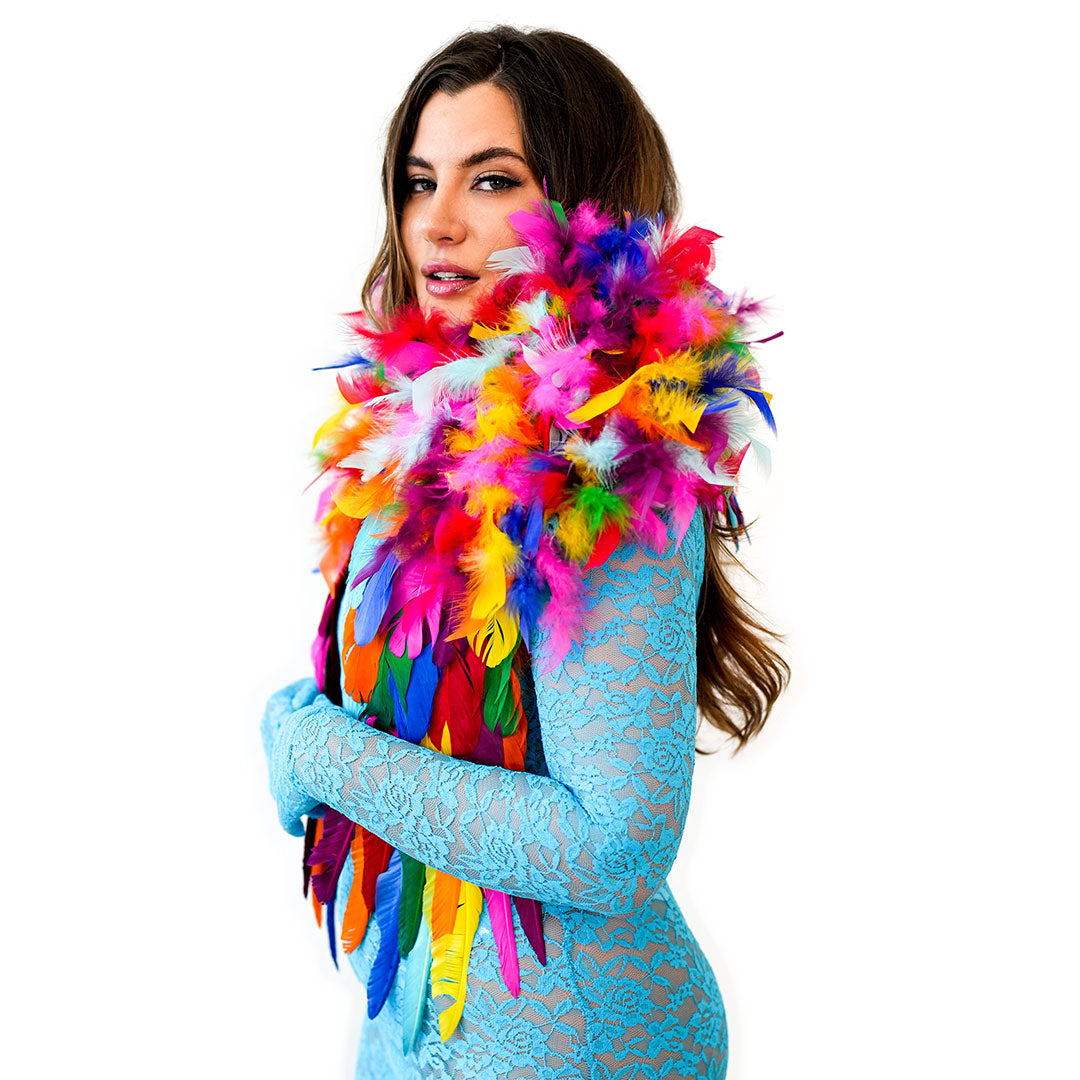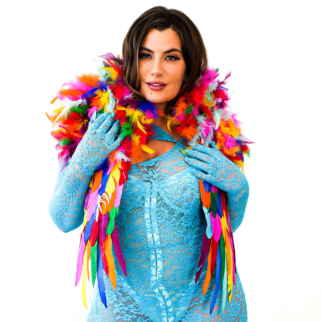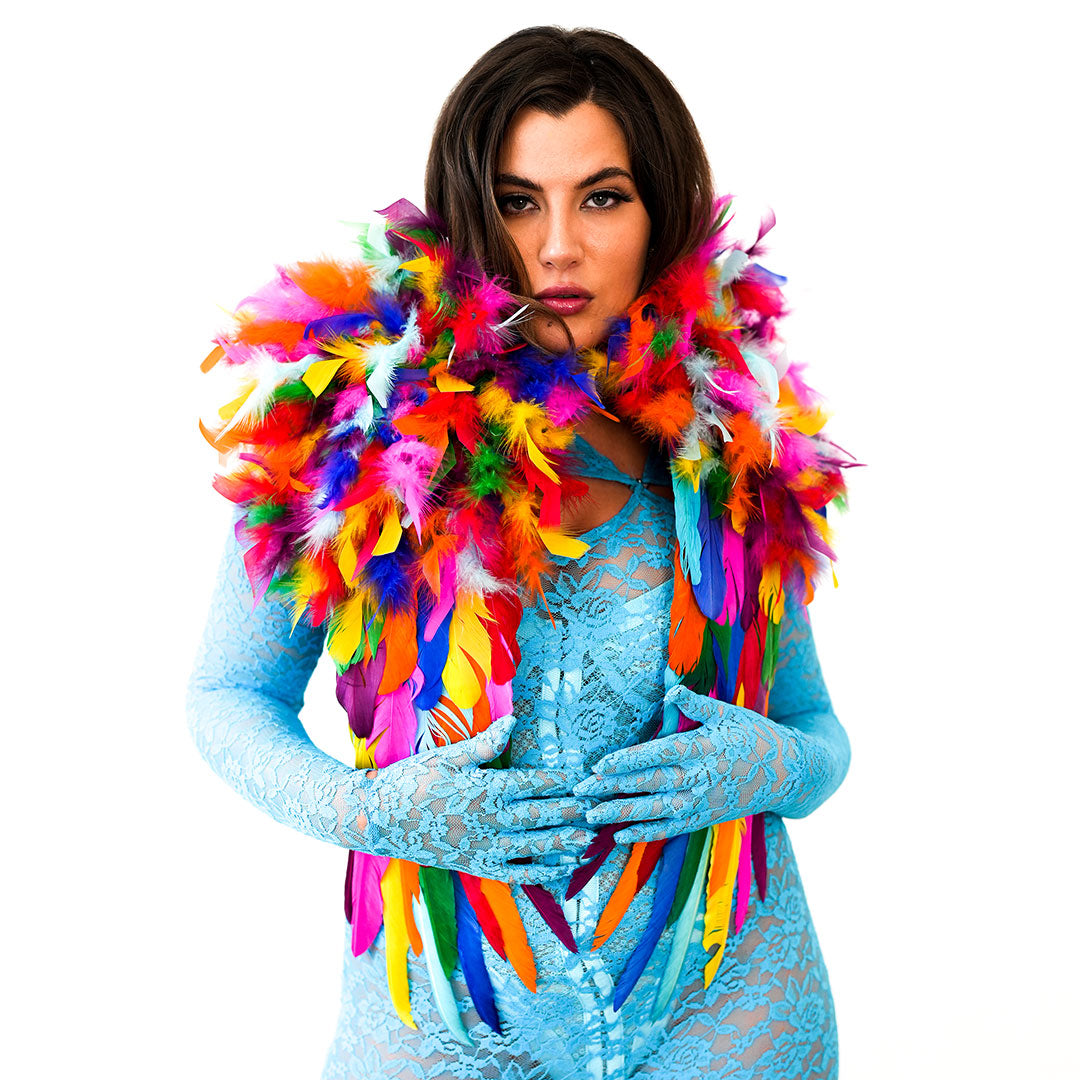 Make a bold fashion statement with our stunning Rainbow Feather Shrug (RAINBOWBRIGHT). This feather shrug, measuring 25 in x 24 in x 1.5 in, wraps around the shoulders and effortlessly drapes down the chest, offering a comfortable fit that you can wear all day or night long. Its eye-catching design is sure to make heads turn and create an impact wherever you go. This shrug, equipped with soft shoulder pads for added comfort, is particularly suitable for tight spaces where larger boas or wings would be impractical to manage. Step into the spotlight and embrace your boldness with this unique shoulder accessory.