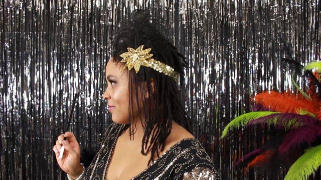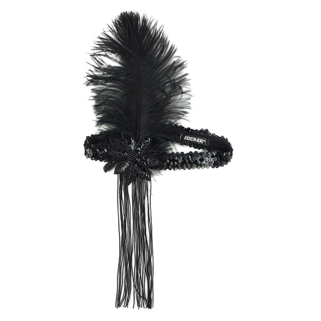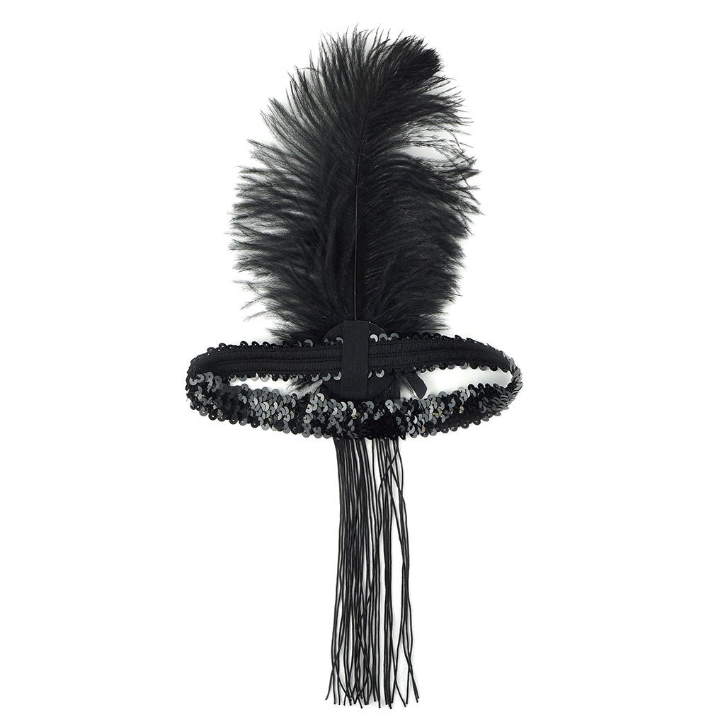 This Flapper Headband is made with an 8-10 inch black ostrich feather embellished with a movable bead and sequin applique and 8-inch Black fringe tassel for a classic dramatic look.