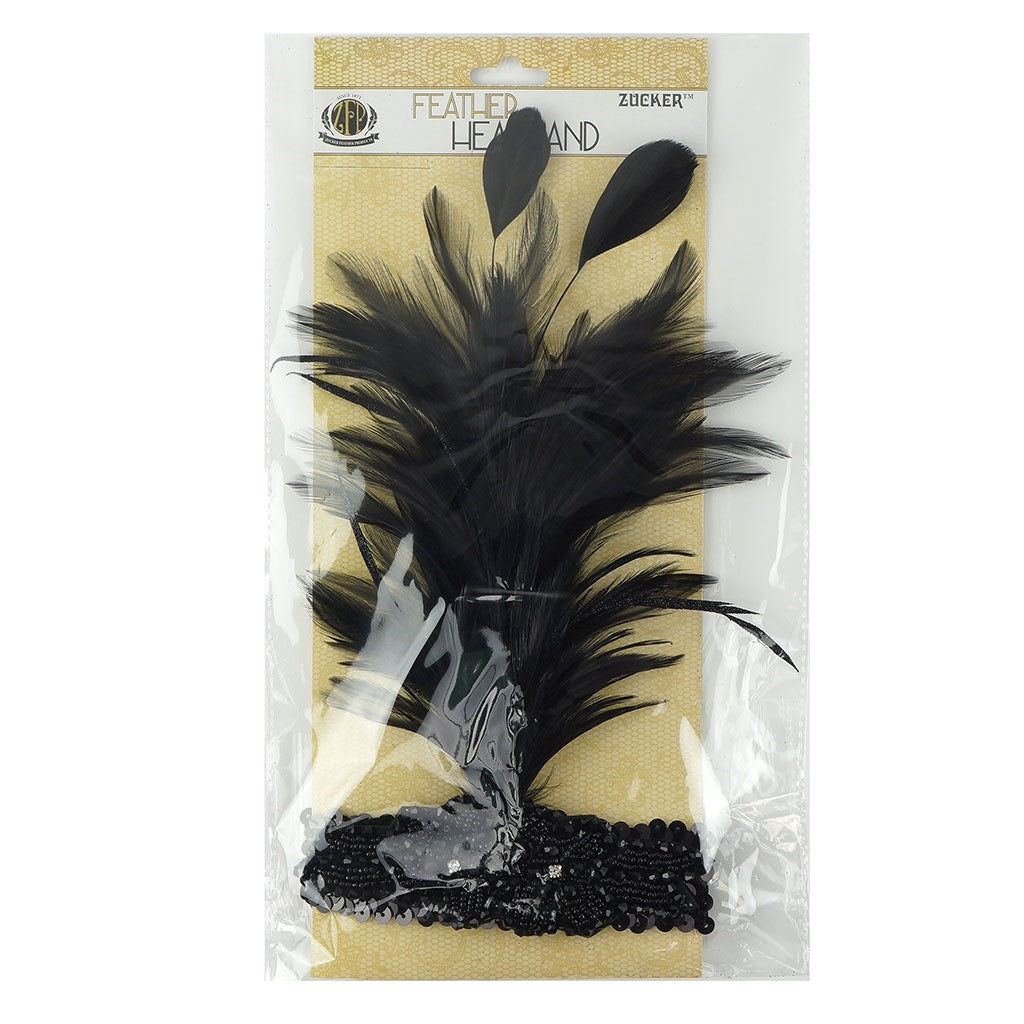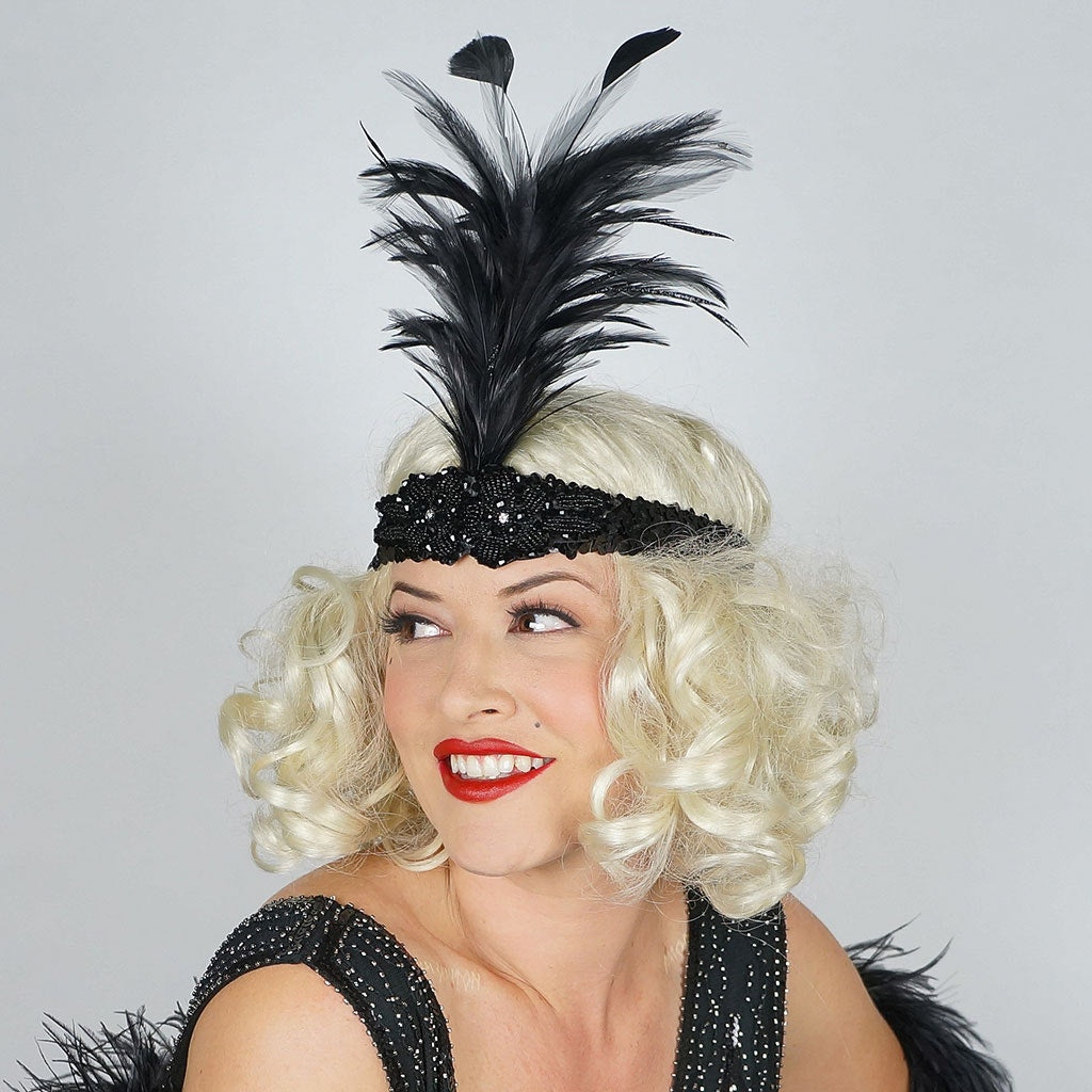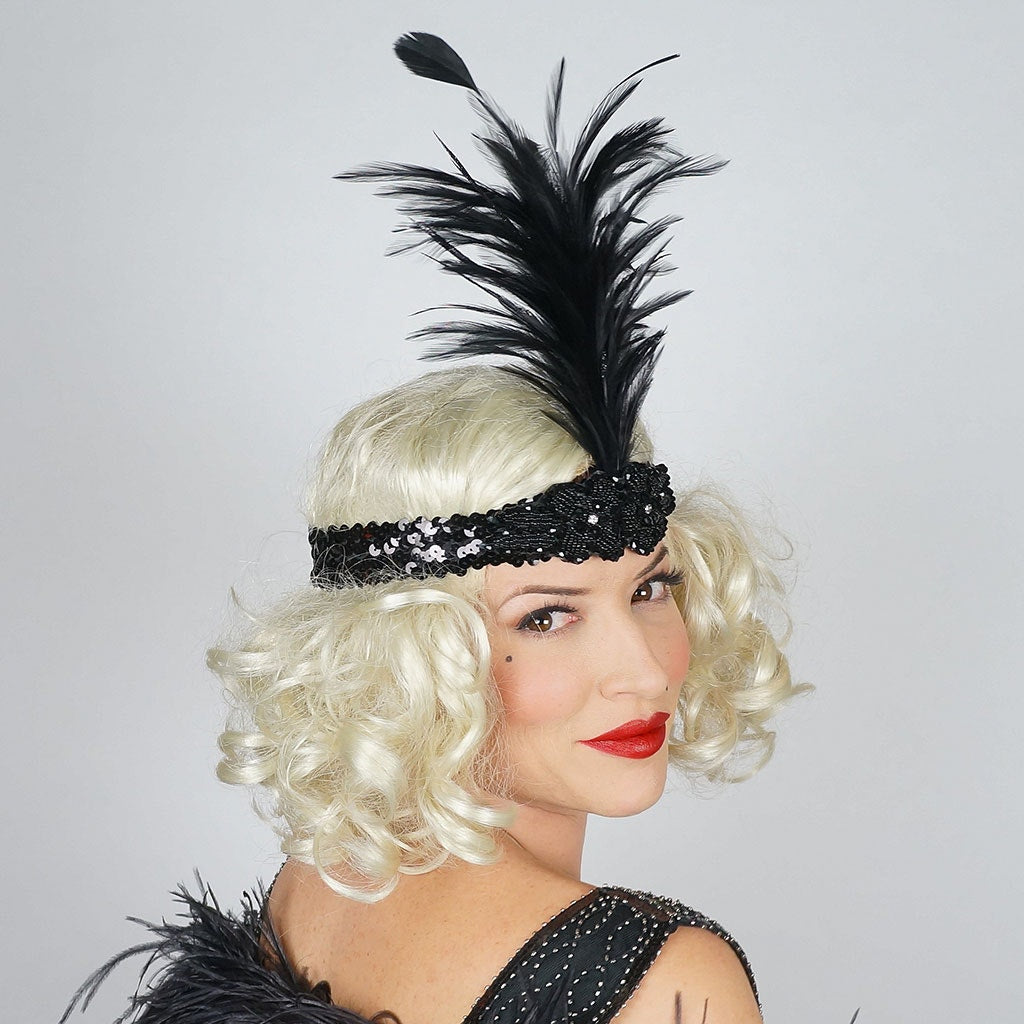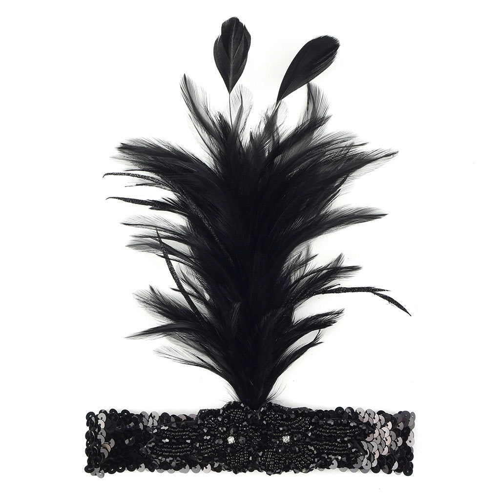 This Flapper Headband is made with a 7-8 inch tall dazzling hackle and goose feather stem giving it a classic art deco, Vaudeville or Cabaret look. This feather headpiece is an elegant women's accessory for roaring 1920s Gatsby themed parties, Halloween, Holidays and more.. Made with a beaded applique and 1 inch wide black elastic sequence band, the goose biot feathers are covered in black glitter for a little extra pizzazz. One size fits most and is very comfortable to wear during any party or event. This product is part of our Feather Fashion Accessories - Feather Headbands and Embellishments category.