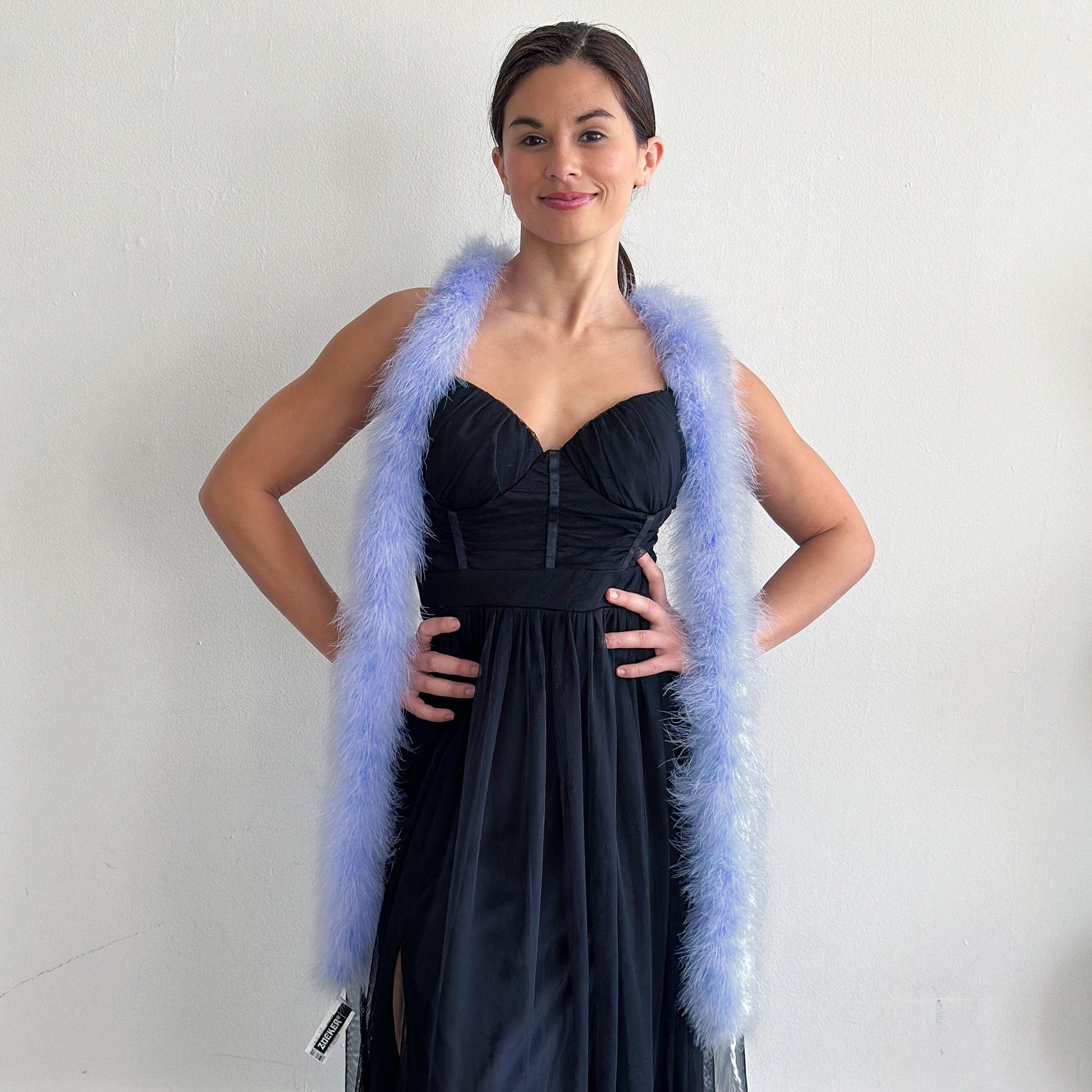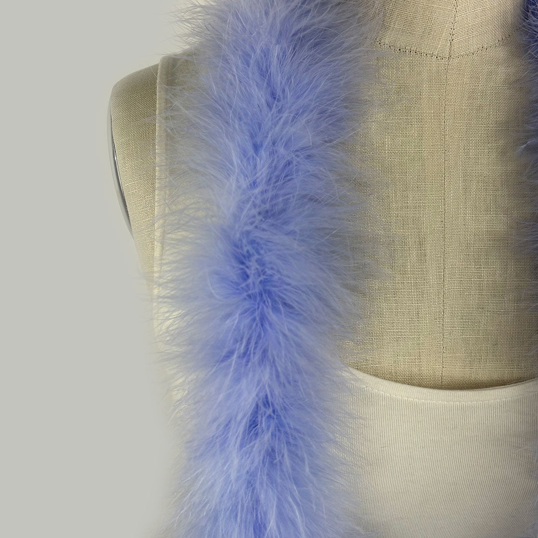 This fluffy feather boa is our fullest sky blue marabou boa. This thick feather boa measures 6 ft long by approximately 3" in diameter. Our Zucker feather boa can be cut without unraveling as feathers are sewn on to a cotton cord.