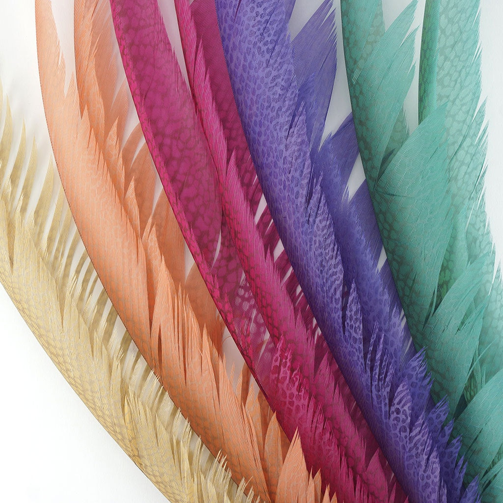 Degraded & Dyed Golden Pheasant Center Tail Feathers range in size from 20-30 inches and come in a 1 piece package. Golden Pheasant Center Tail Feathers drape over the stem of the quill creating an umbrella effect. These pheasant tails are approximately 1/2" wide on each side of the quill near the base of the quill and become approx. 1" wide through the body of the feather before tapering to a 1/5" point at the top. These Golden Pheasant Tail Feathers are degraded and dyed with some natural , leopard print-like markings showing throughout the body of the feather.