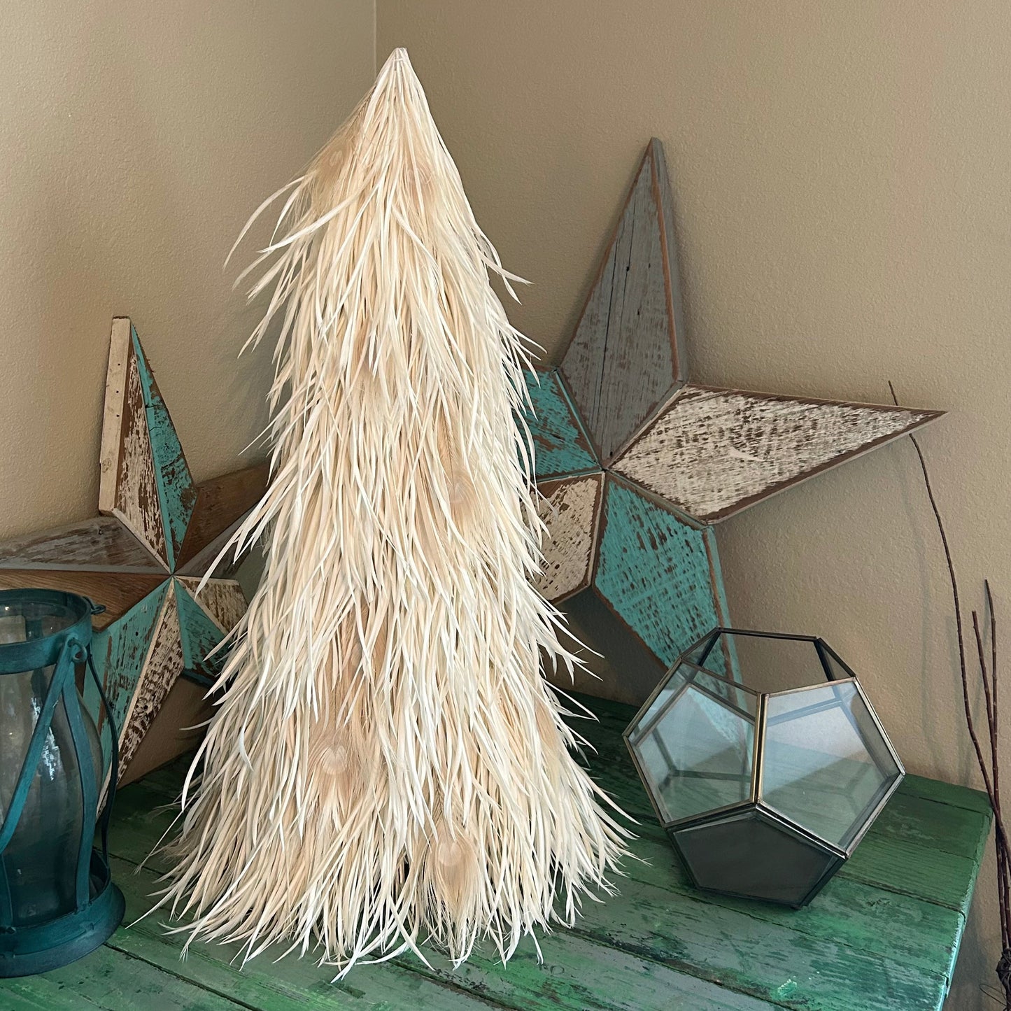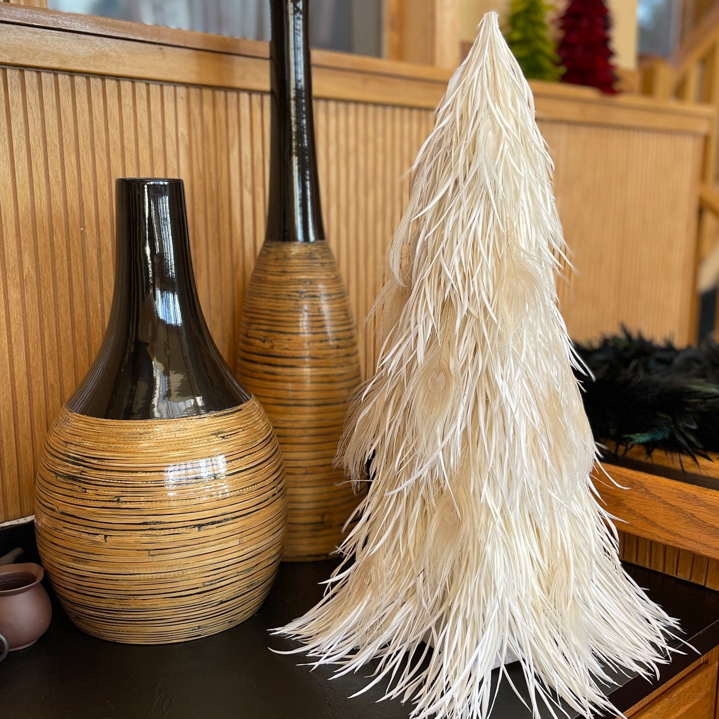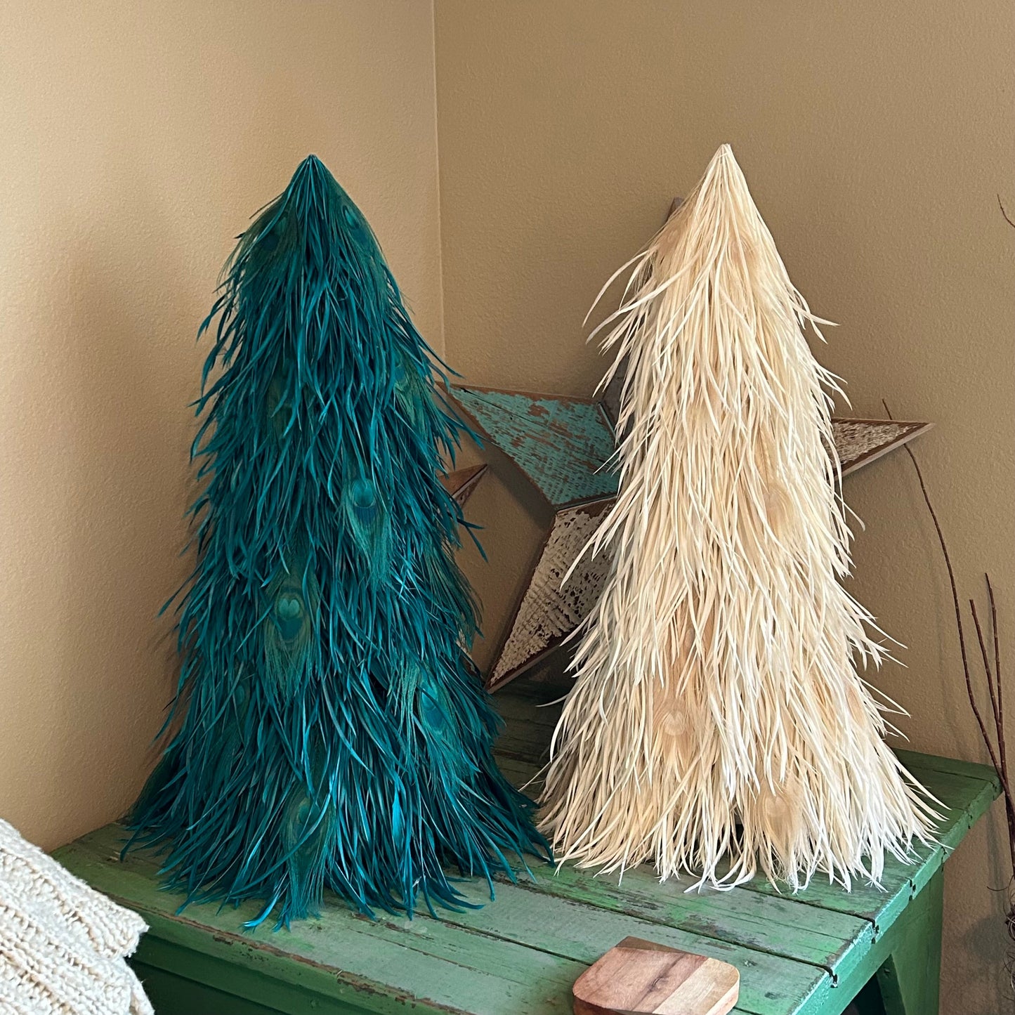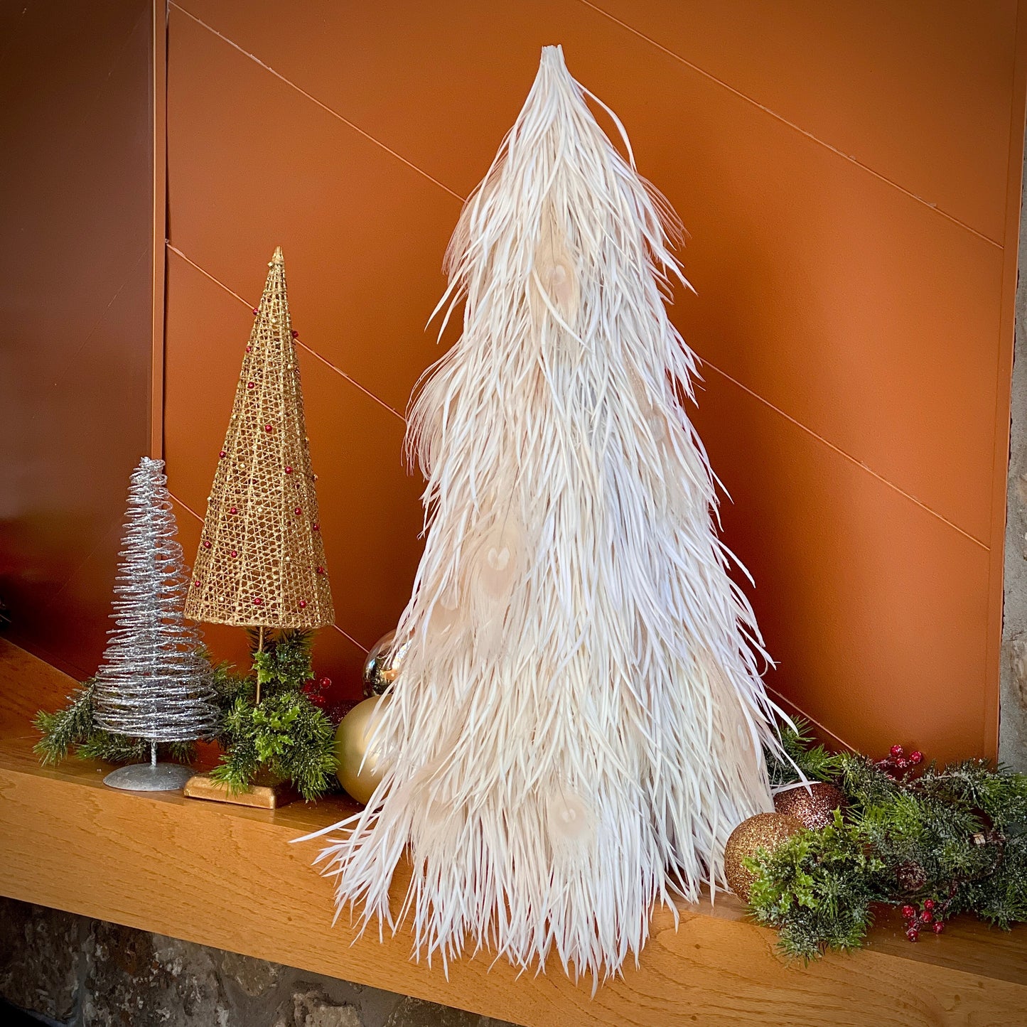 These decorative Feather Trees are made with White Goose Biot Feather and Bleach dyed Ivory Peacock Feathers. These trees are designed as slipcovers lined with thick felt for easy shipping, set up and storage. Each tree comes packaged with a reusable, easy to assemble wooden pop out to give the feather tree shape in order to stand alone on a flat surface.