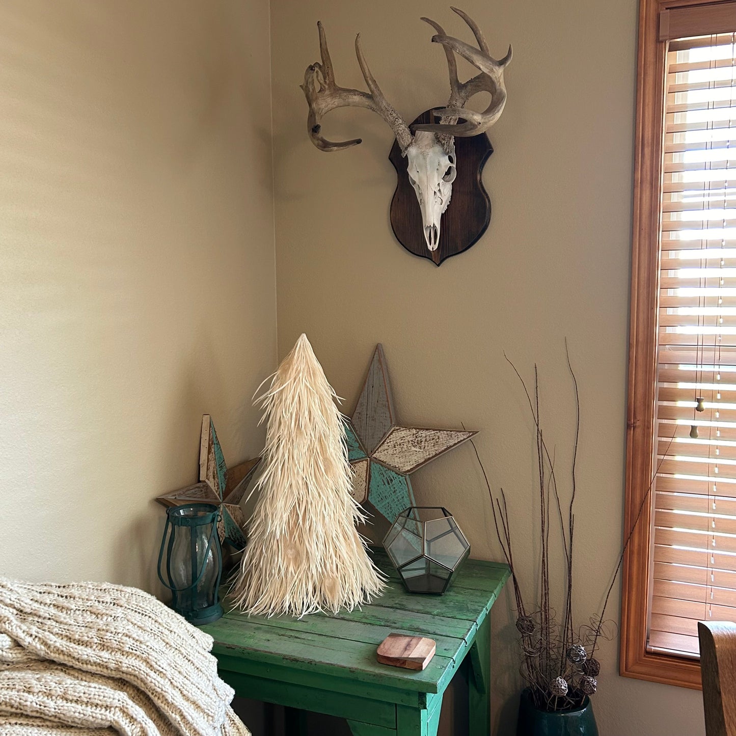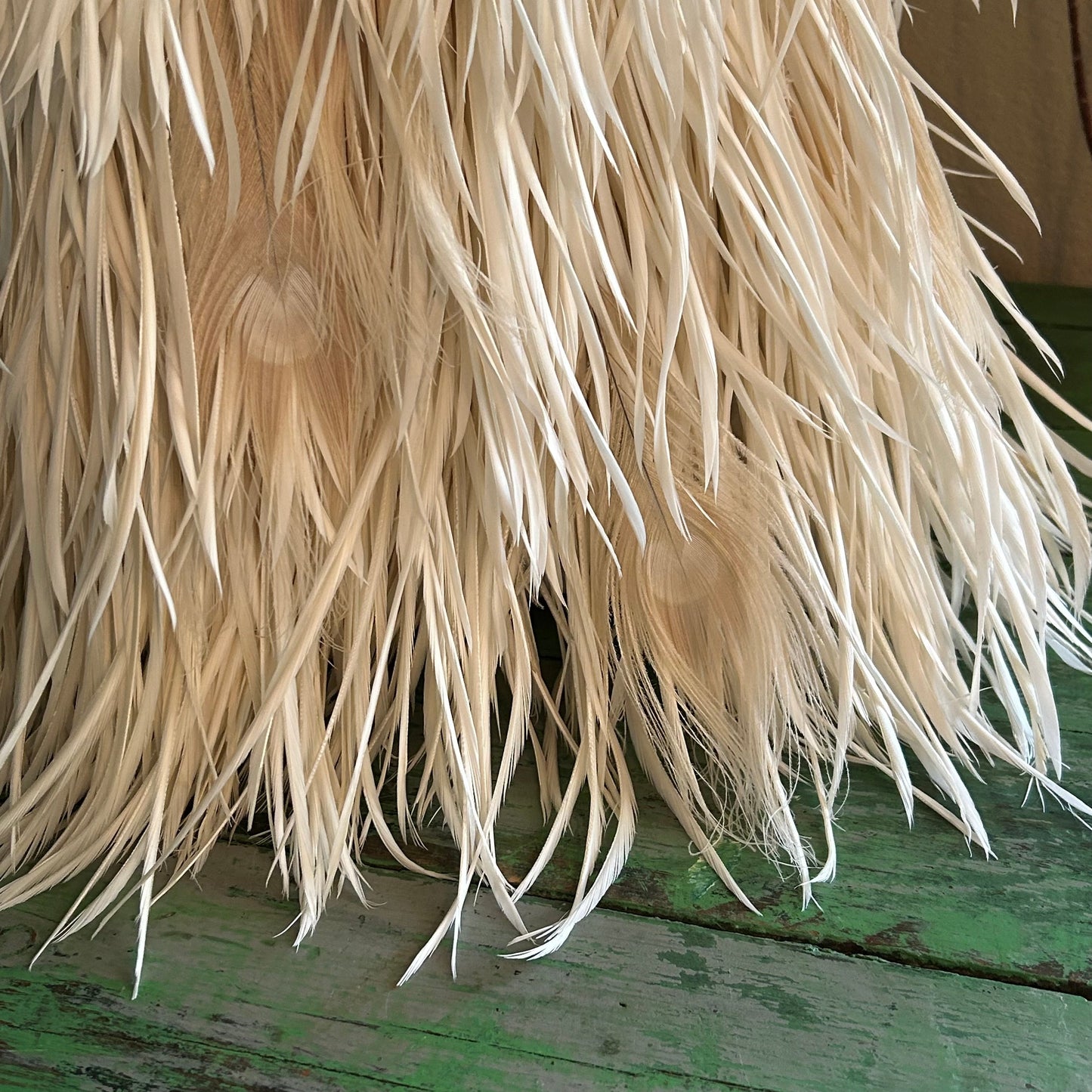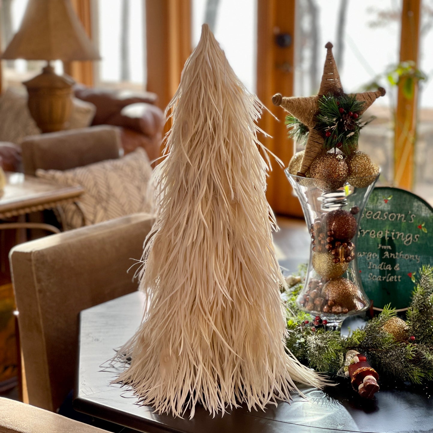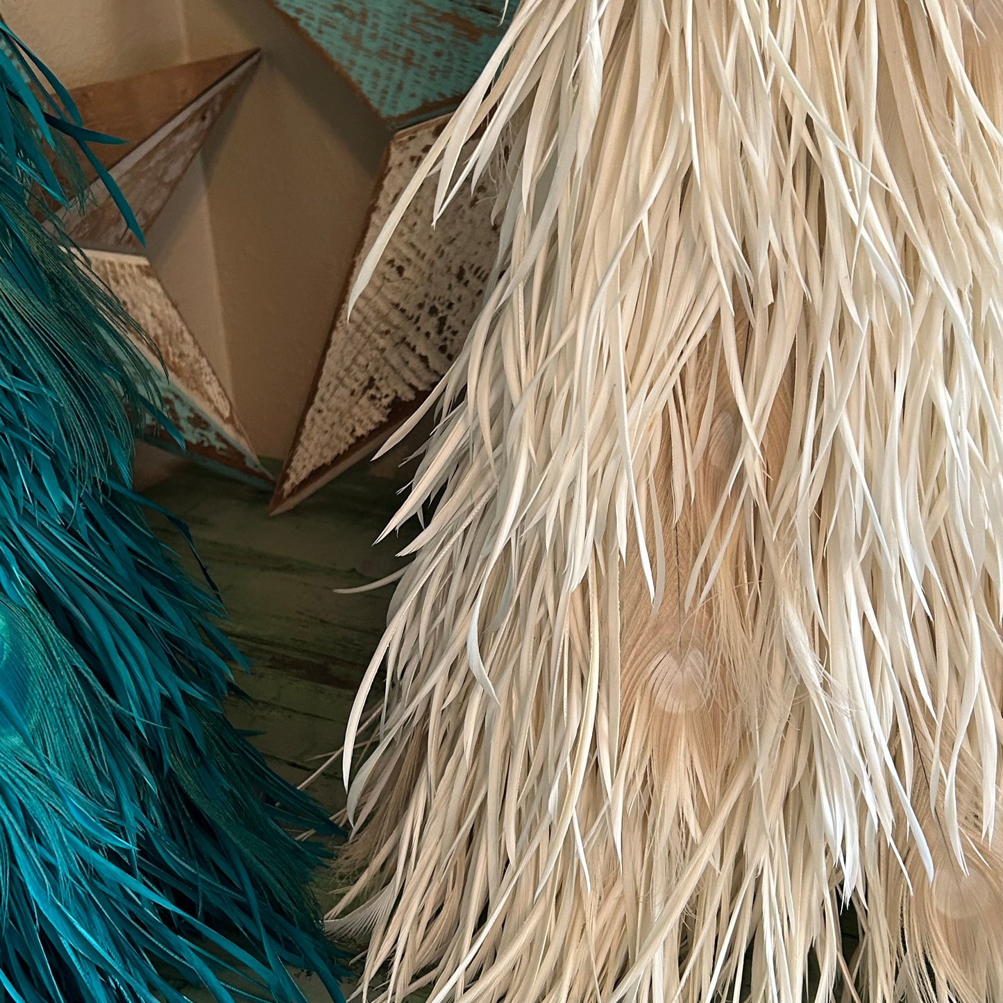 These decorative Feather Trees are made with White Goose Biot Feather and Bleach dyed Ivory Peacock Feathers. These trees are designed as slipcovers lined with thick felt for easy shipping, set up and storage. Each tree comes packaged with a reusable, easy to assemble wooden pop out to give the feather tree shape in order to stand alone on a flat surface.