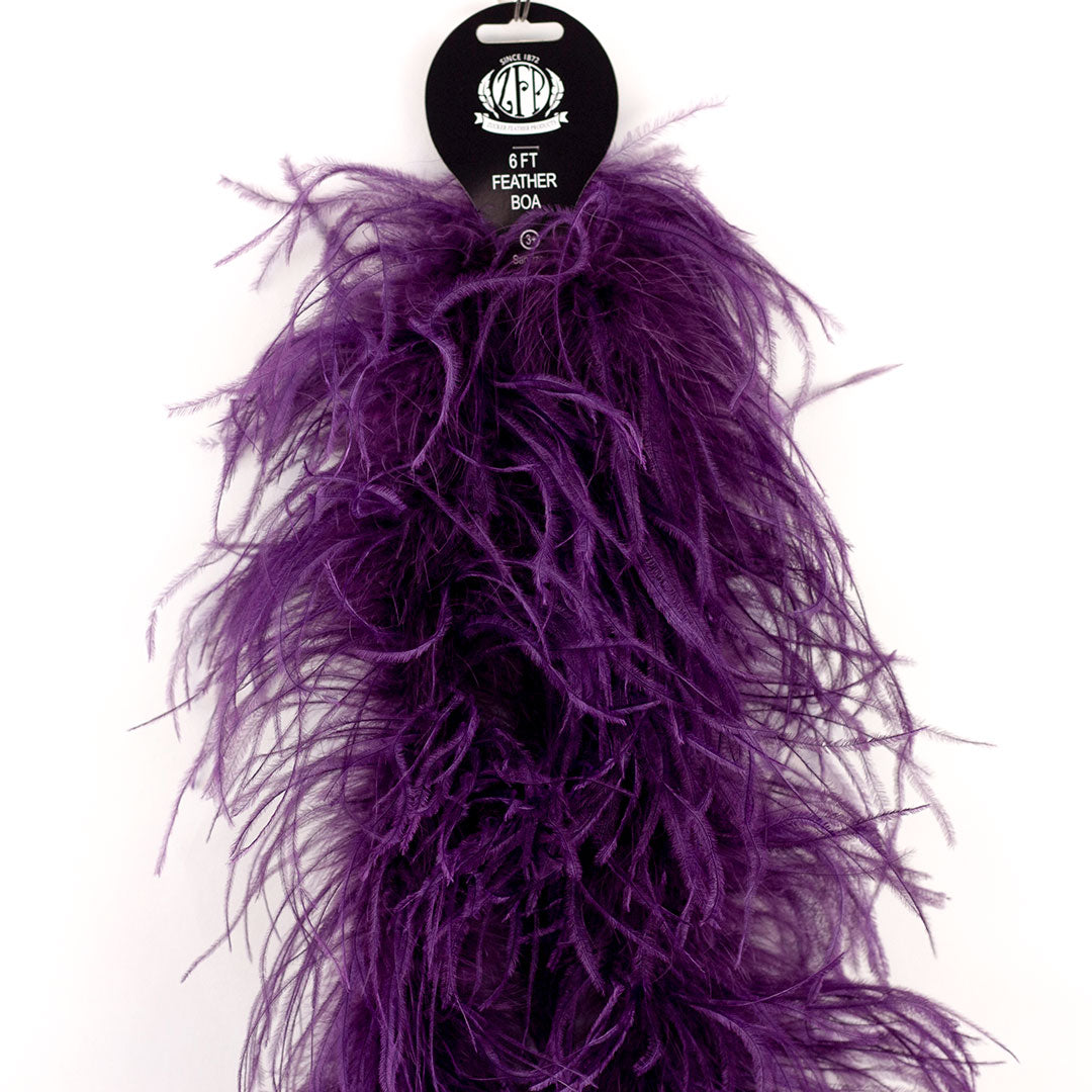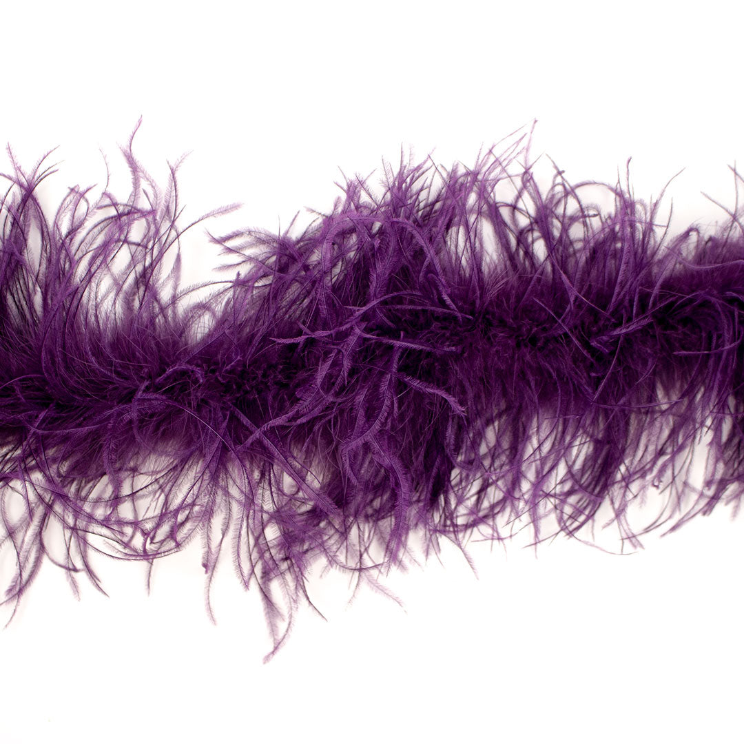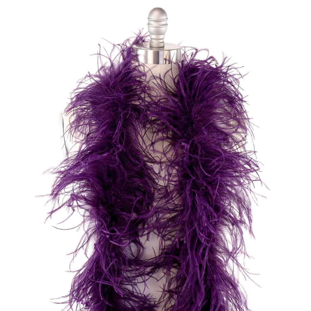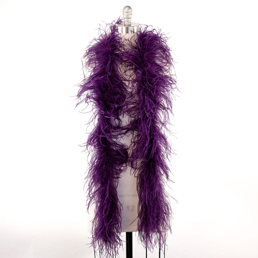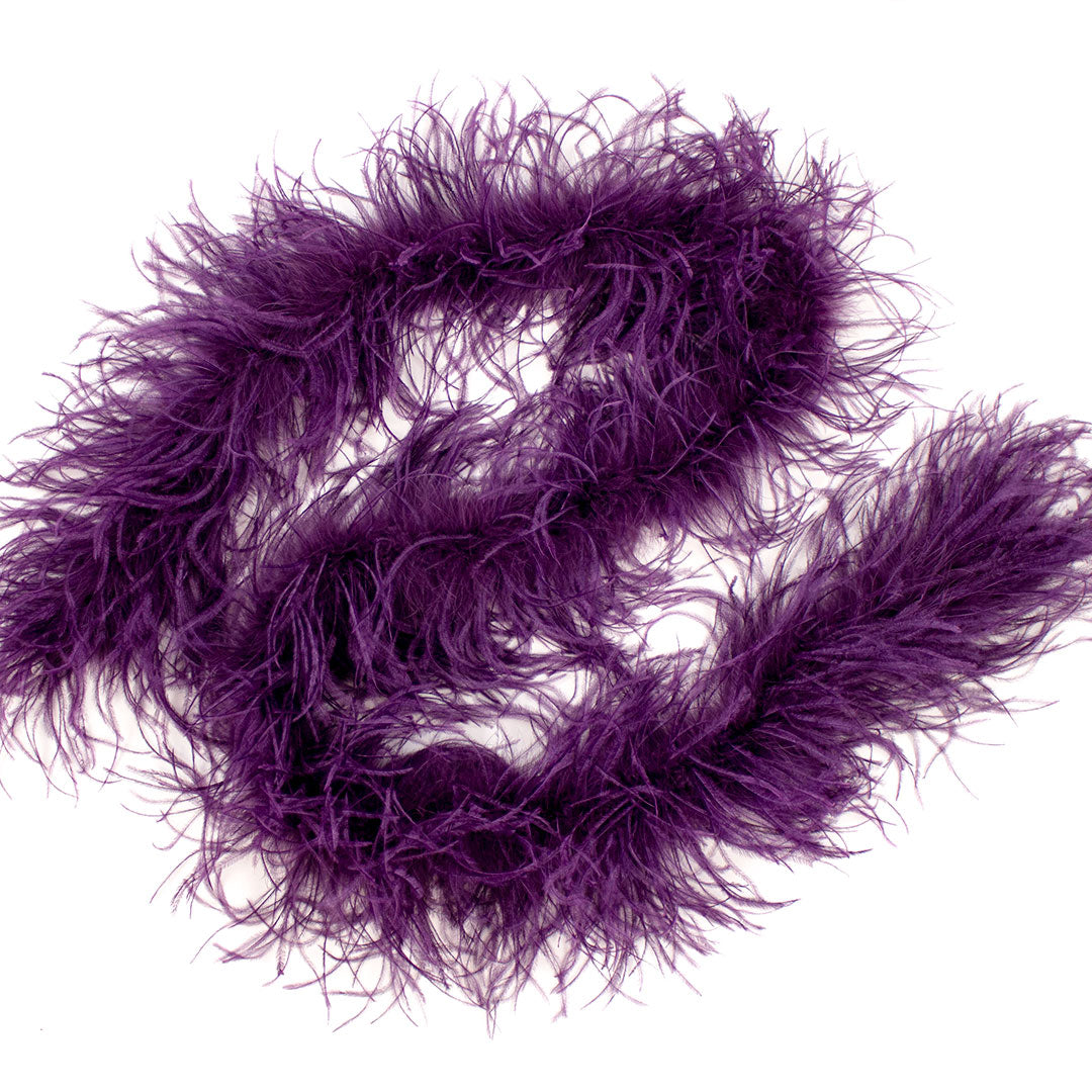 This grape purple ostrich feather boa has marabou feathers with two layers of ostrich feathers sewn into it and measures 6 feet long by approximately 9" in diameter. Our Zucker feather boa can be cut without unraveling as feathers are sewn on to a cotton cord. This ostrich boa is an ideal roaring 20s feather boa, perfect for a Great Gatsby theme party.