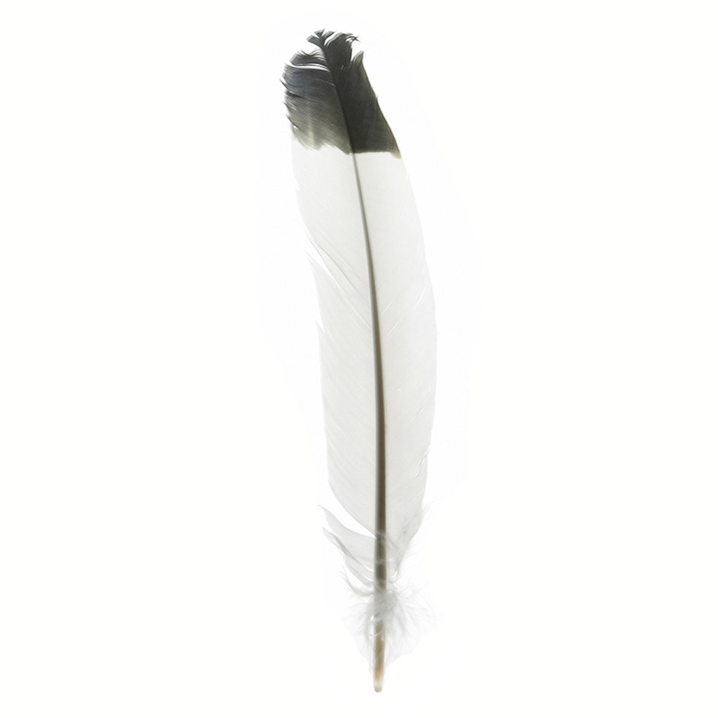 Imitation Eagle Turkey Quills Left Wing Feathers are approximately 10-12 inches long and . They are available in White with Black or Brown dyed tips. This items is a Left Side wing quill, but is available in either a Left or Right Side. Sold by the pound with approximately 275 pieces per pound.
