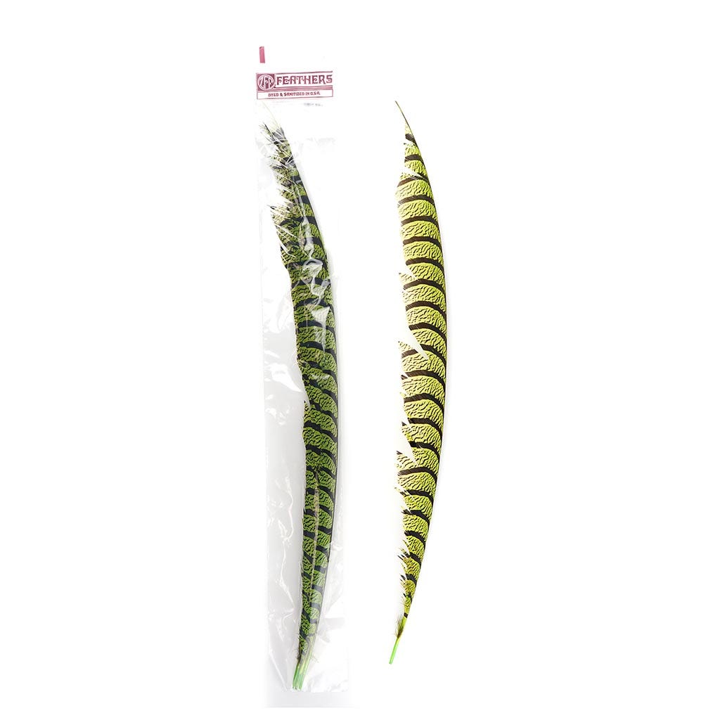 Lady Amherst Pheasant Center Tail Feathers are are approcimately 20-30 inches long and come in a 3 piece package. This style of pheasant feather is dyed over the natural white with black zebra-like stripes going through the feather. Lady Amherst Center Tail feathers have a stiff but flexible spine and drapes from the center of the quill creating an umbrella effect. The feather comes from the center tail of the Lady Amherst Pheasant.