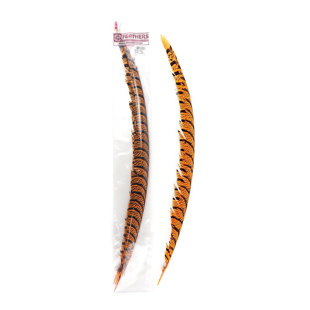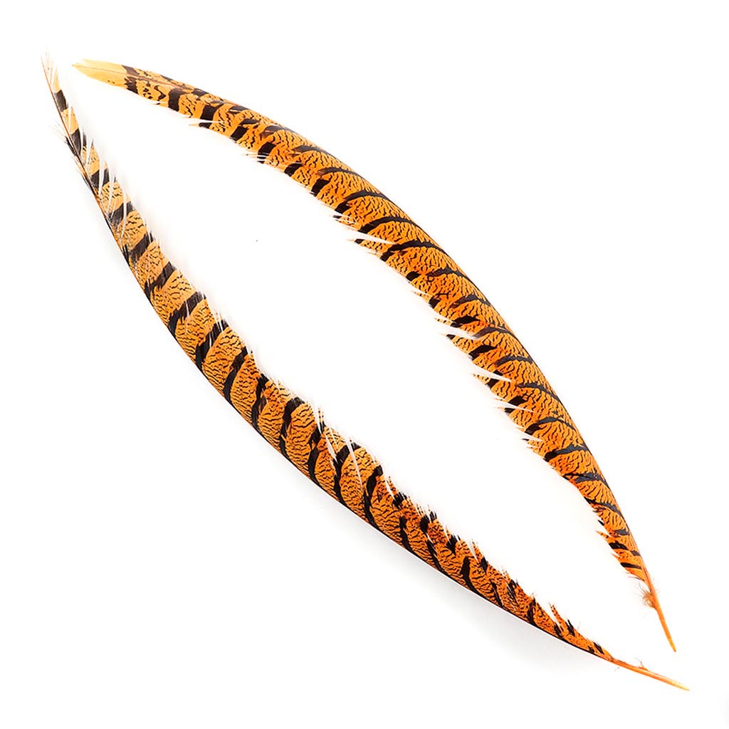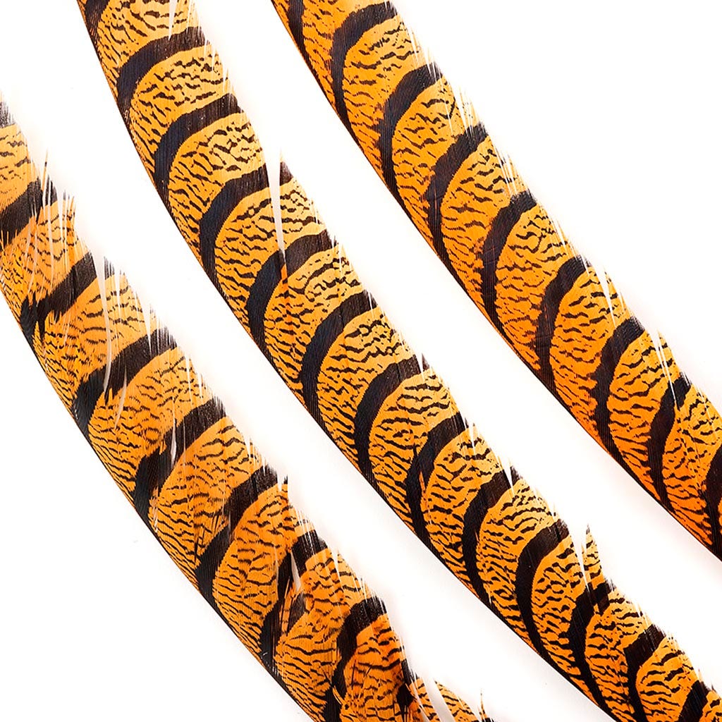 Lady Amherst Pheasant Center Tail Feathers are are approcimately 20-30 inches long and come in a 3 piece package. This style of pheasant feather is dyed over the natural white with black zebra-like stripes going through the feather. Lady Amherst Center Tail feathers have a stiff but flexible spine and drapes from the center of the quill creating an umbrella effect. The feather comes from the center tail of the Lady Amherst Pheasant.
