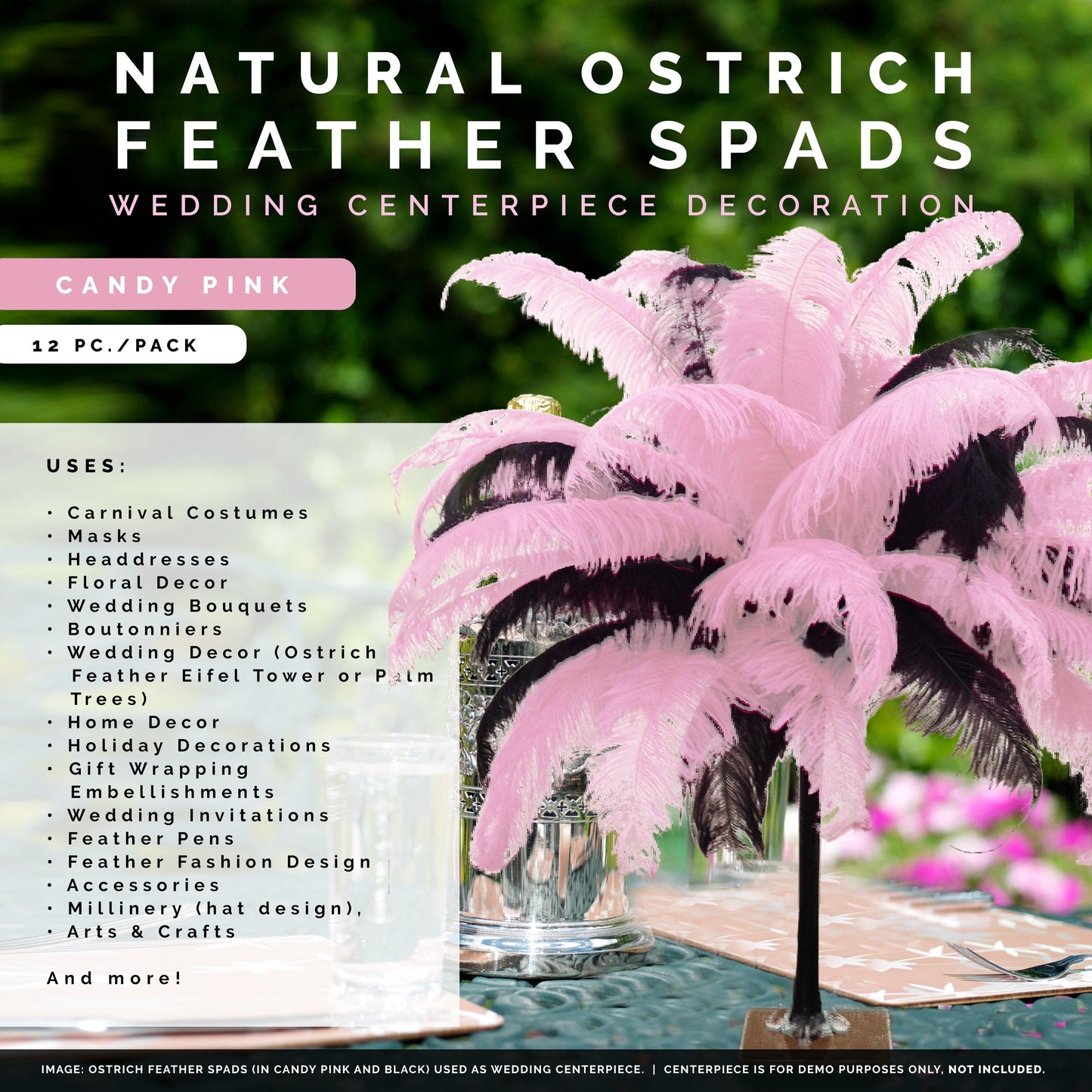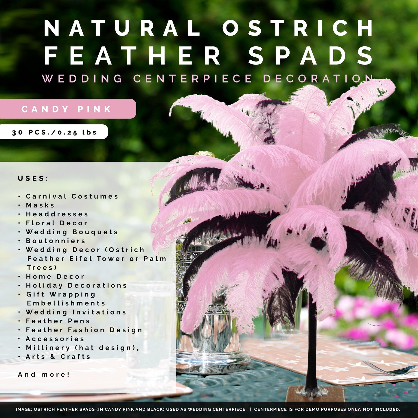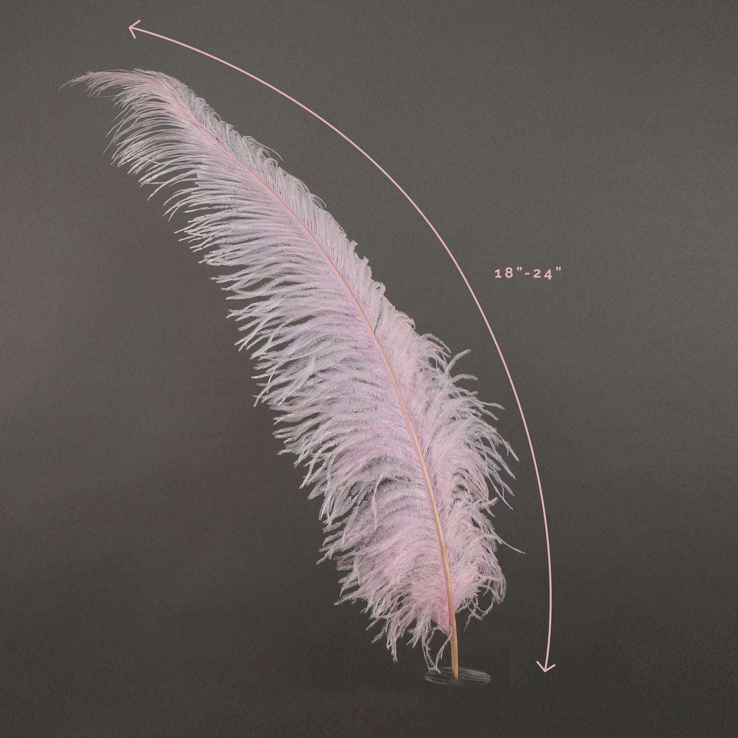 Ostrich Feather Spads ranges in size from 18 to 24 inches long. The 1 piece and 12 piece packages of these long ostrich feathers are hand selected. The 1/4 lb ostrich feathers bulk spads contain approximately 30 pieces, non-selected.