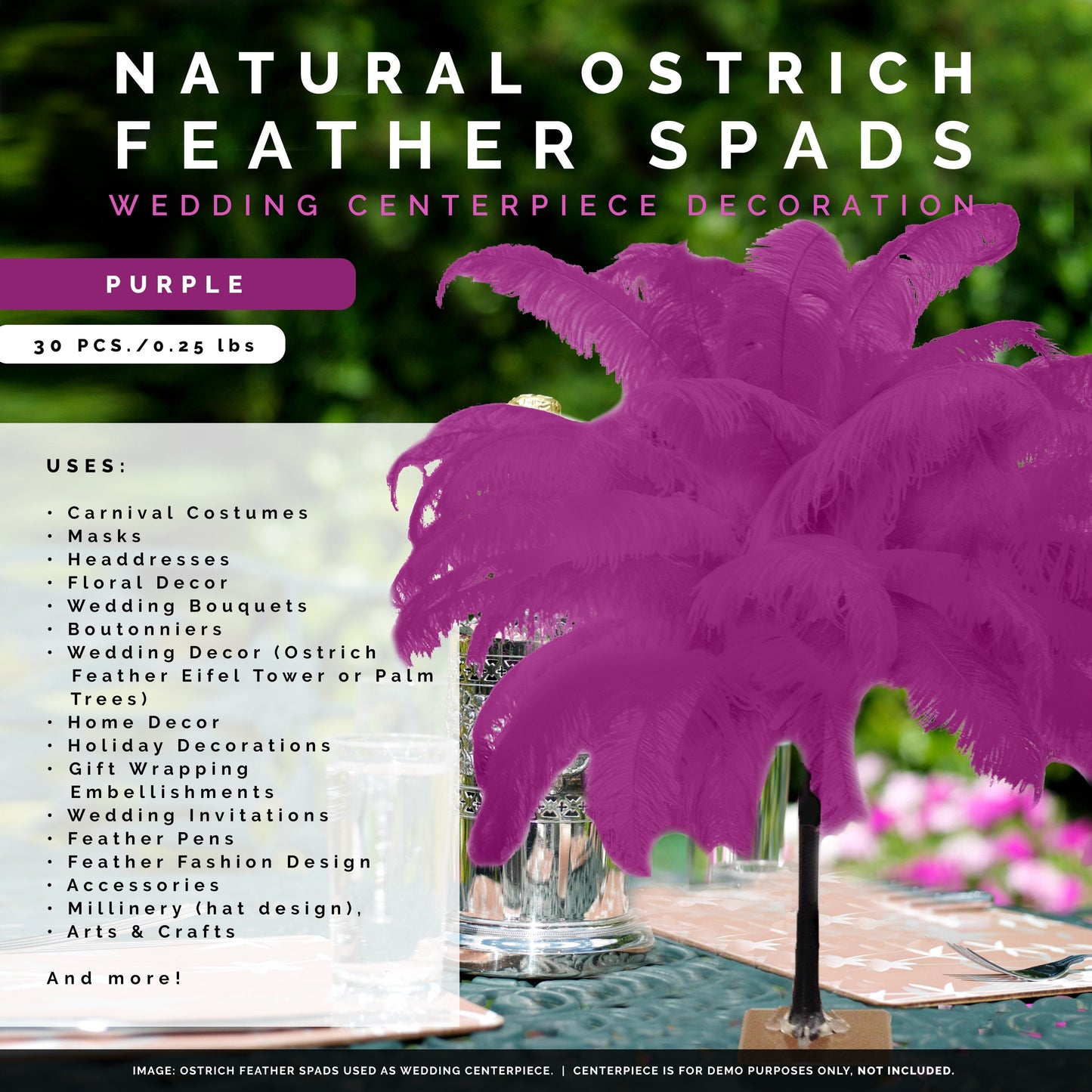 Ostrich Feather Spads ranges in size from 18 to 24 inches long. The 1 piece and 12 piece packages of these long ostrich feathers are hand selected. The 1/4 lb ostrich feathers bulk spads contain approximately 30 pieces, non-selected.