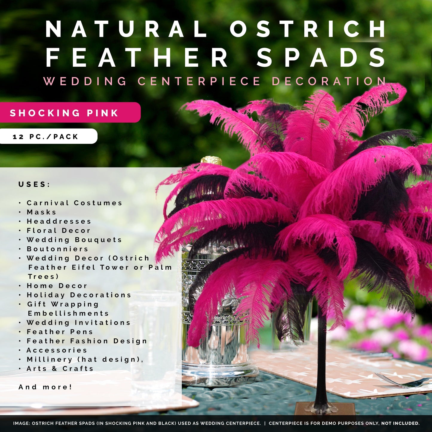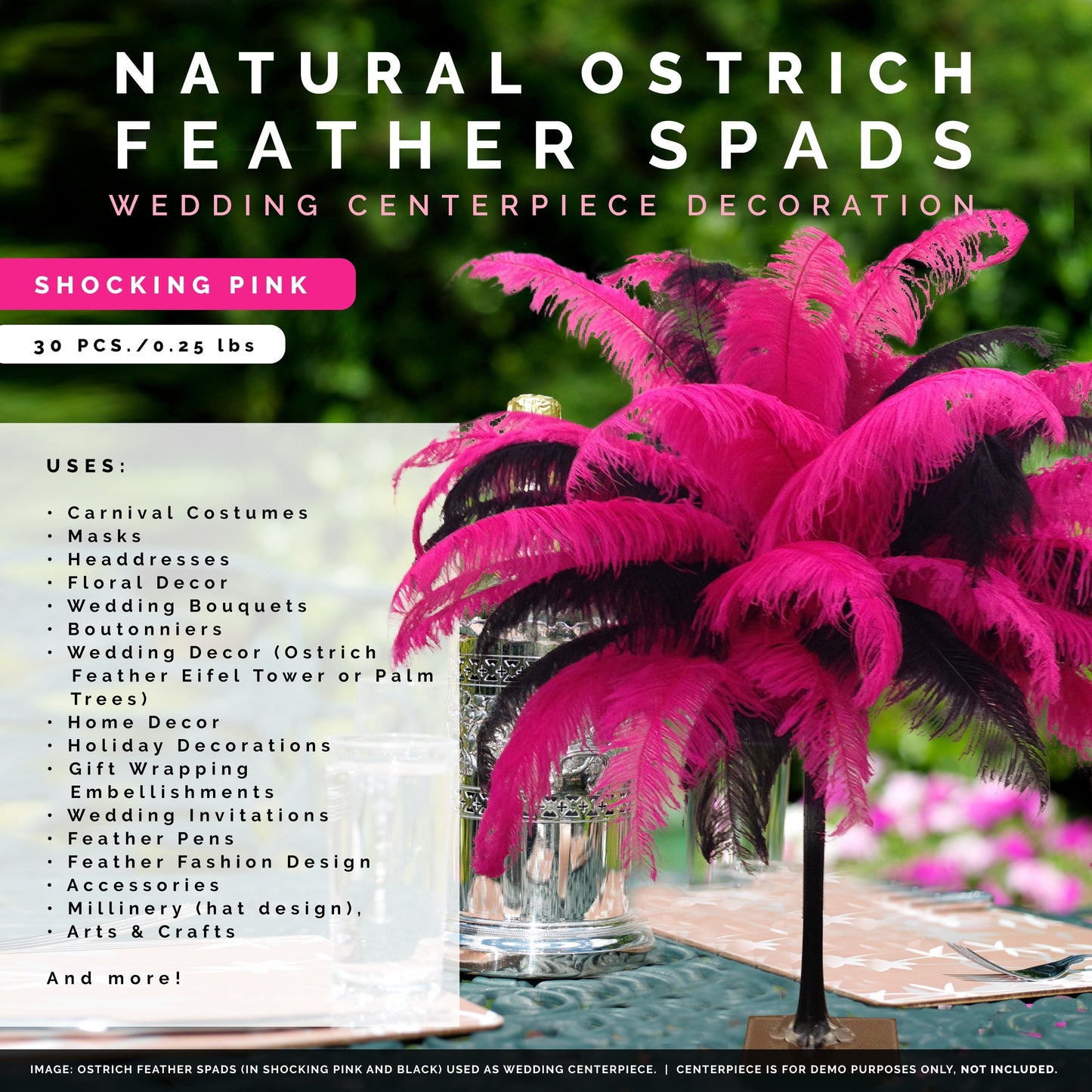 Ostrich Feather Spads ranges in size from 18 to 24 inches long. The 1 piece and 12 piece packages of these long ostrich feathers are hand selected. The 1/4 lb ostrich feathers bulk spads contain approximately 30 pieces, non-selected.