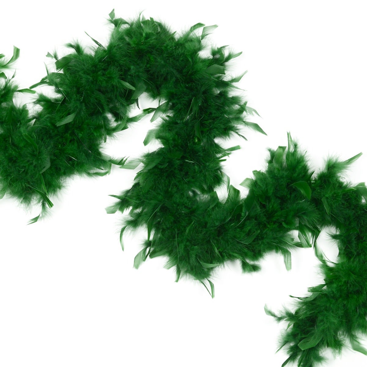 This green feather boa is the lightest of our chandelle boas. Our thin feather boa measures 2 yards (6 ft) long, and approx 4-4.5" in diameter. This Zucker feather boa can be cut without unraveling as feathers are sewn on to a cotton cord.