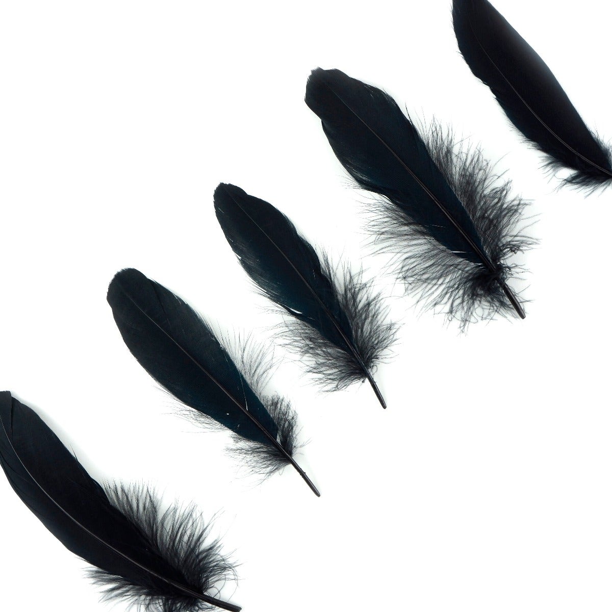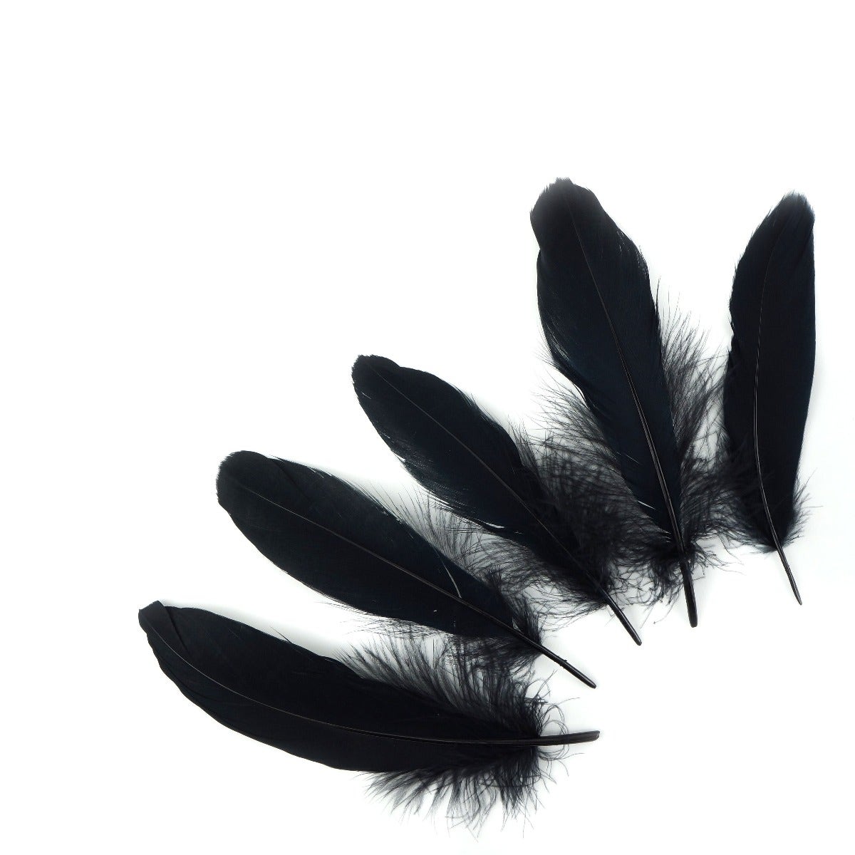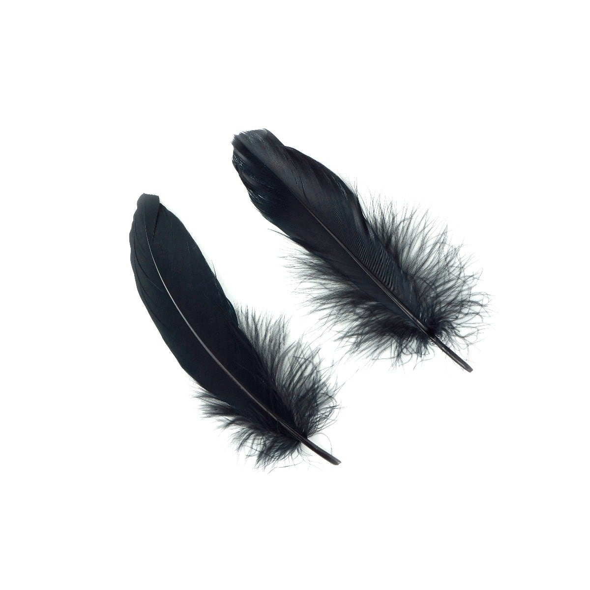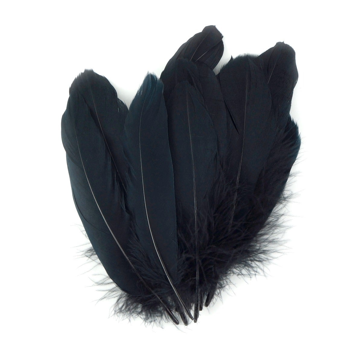 Loose Goose Satinettes Feathers Dyed Solid Colors are approximately 4.5-6 inches long and come in a .25 ounce package. There are approximately 46 feathers per package. The Goose satinette feather has a rounded tip and is fluffy feather near the bottom of the quill.