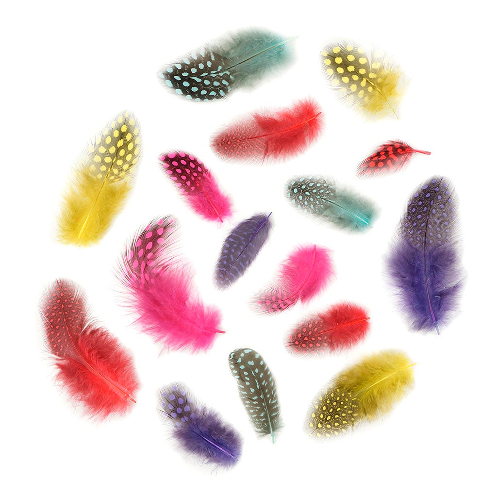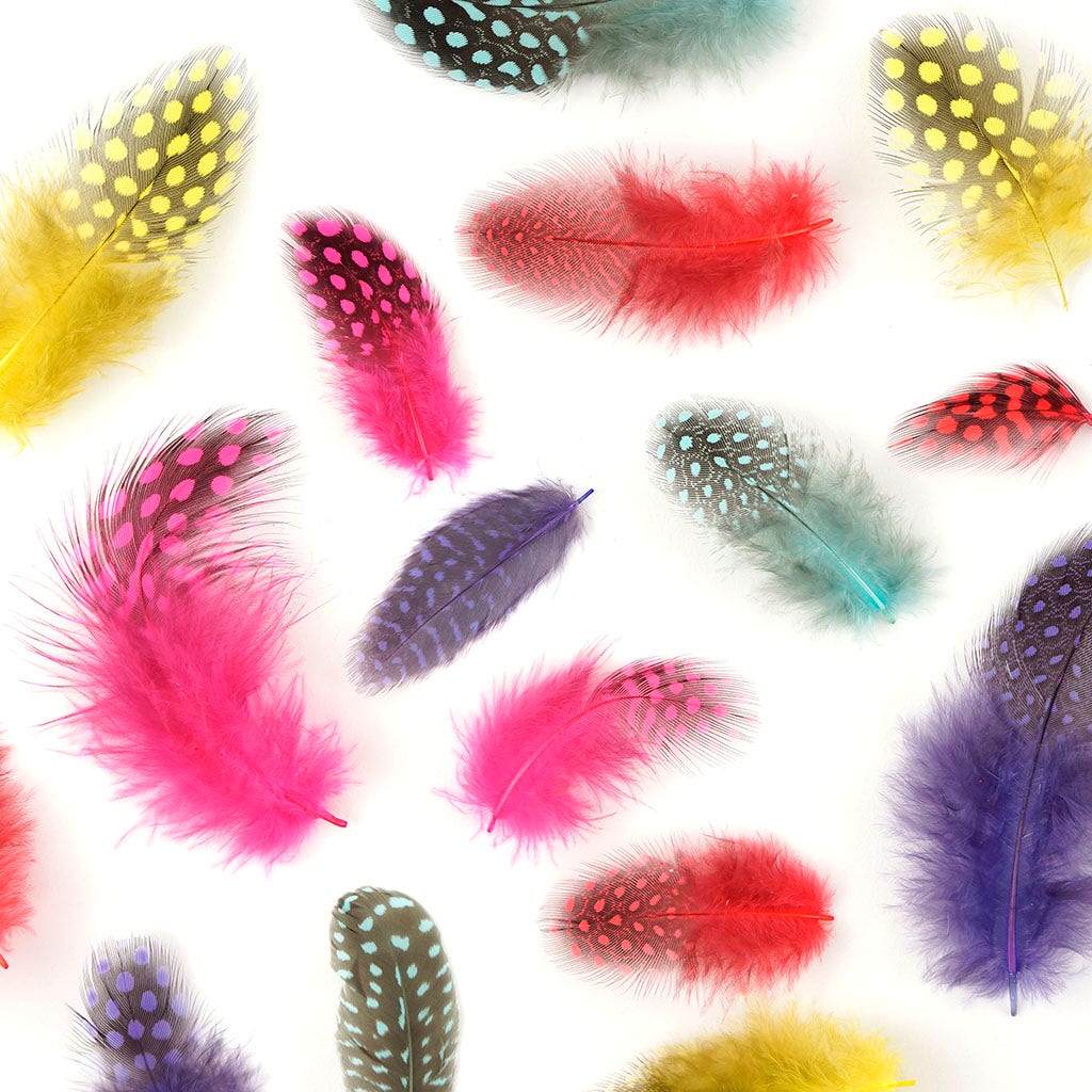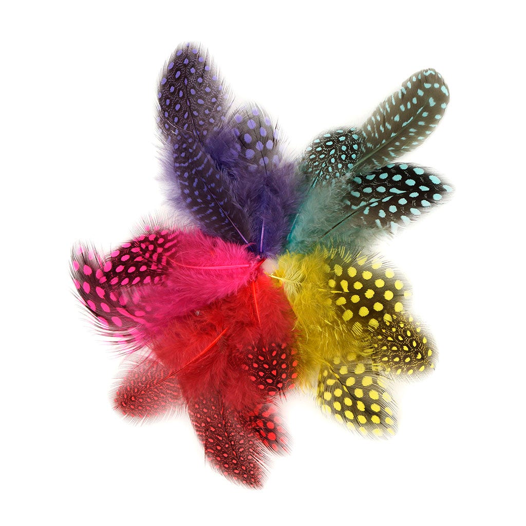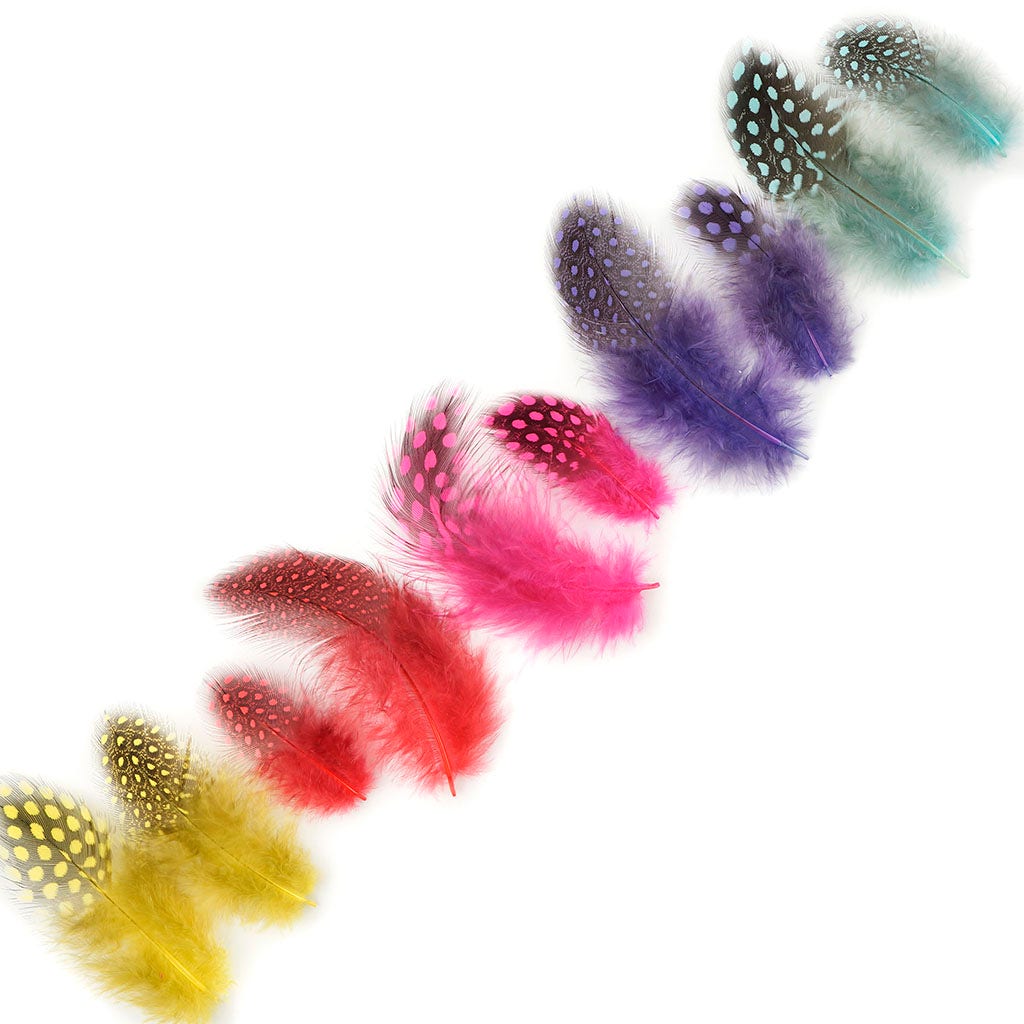 Loose Guinea Plumage Feathers Mix Dyed are 1-4 inches long and come in a .10 ounce package. There are approximately 50 feathers per package/assorted colors.