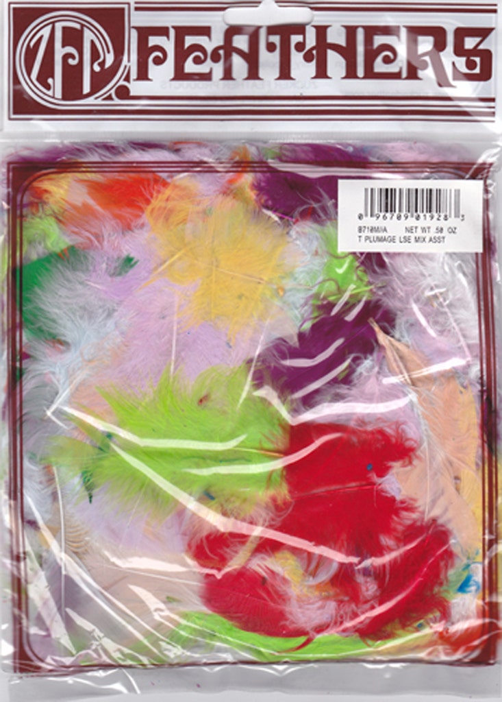Loose Turkey Plumage Mix Dyed Feathers are approximately 3-5 inches long and come in .50 ounce mixed color package. There are approximately 156 pieces per package.